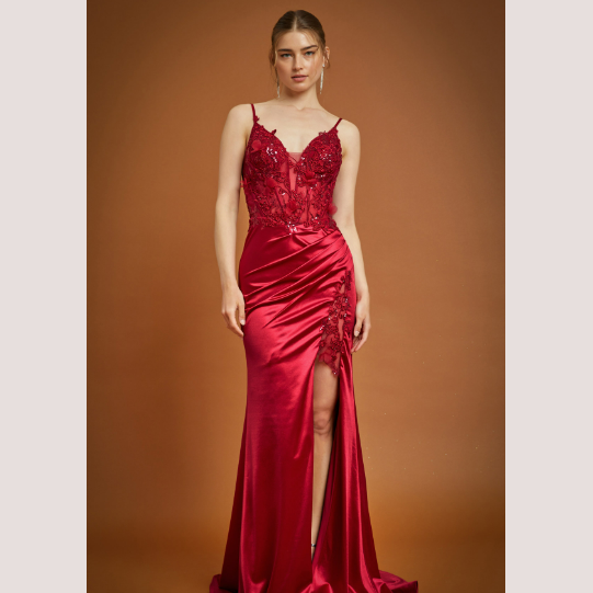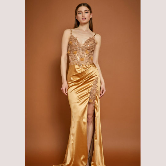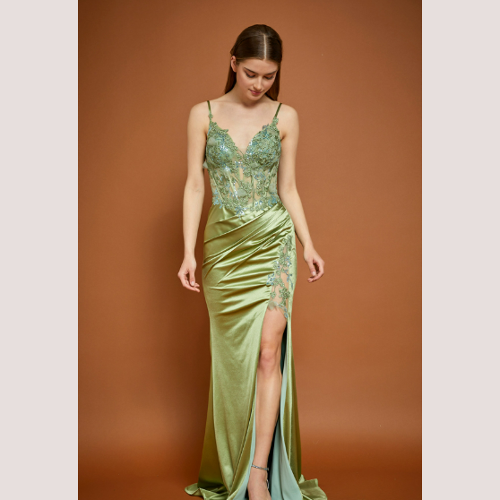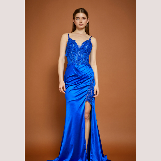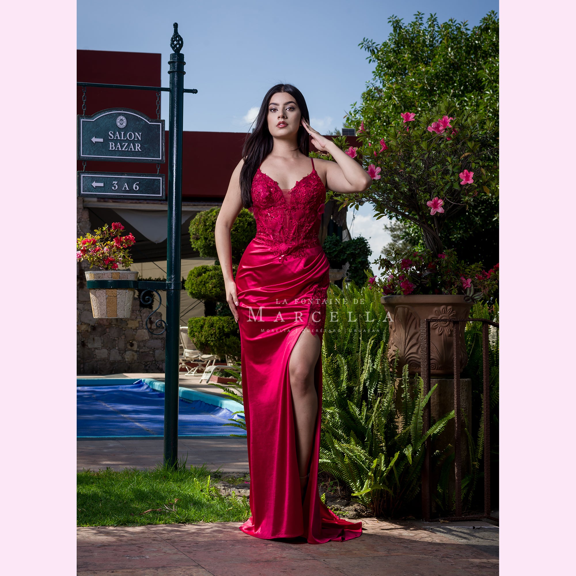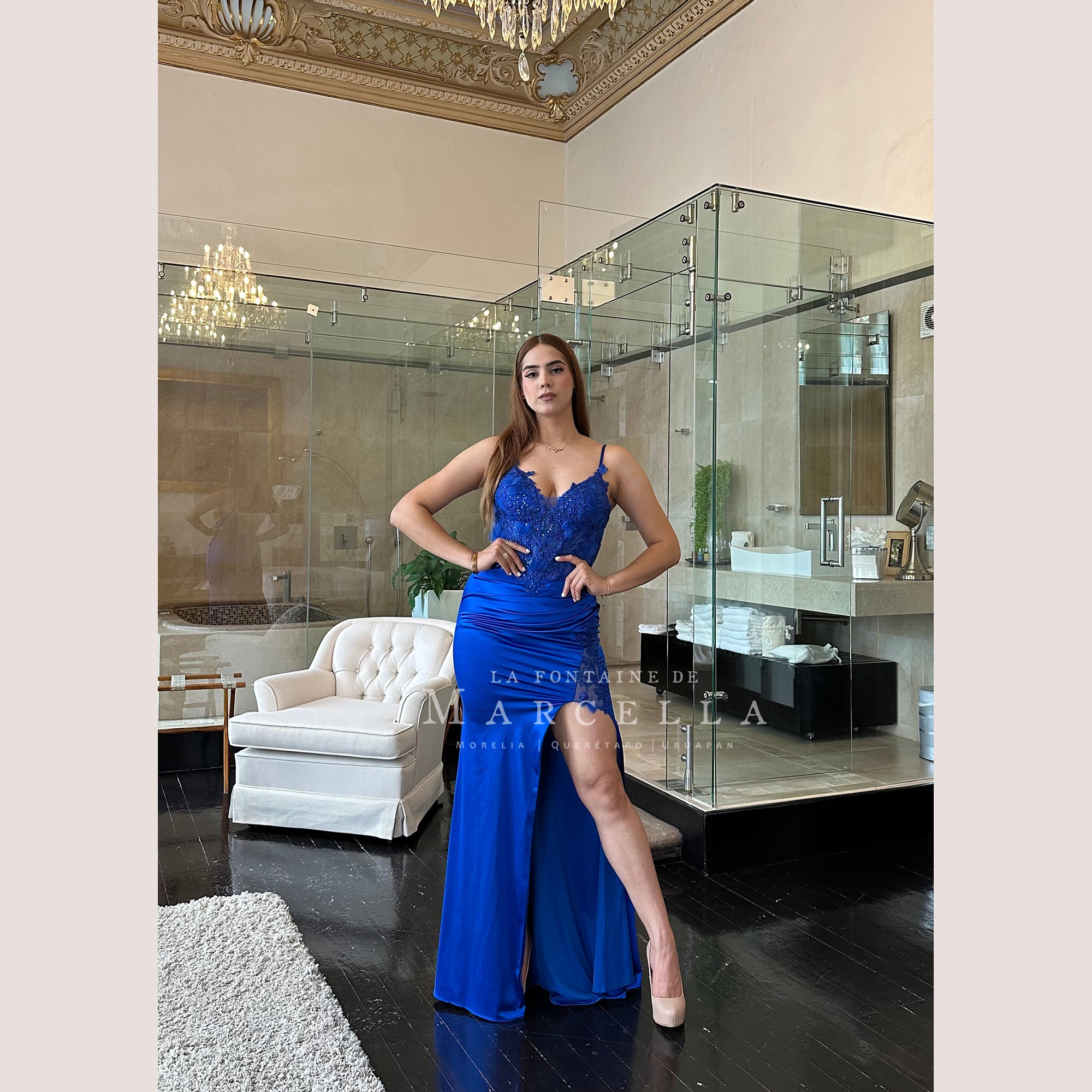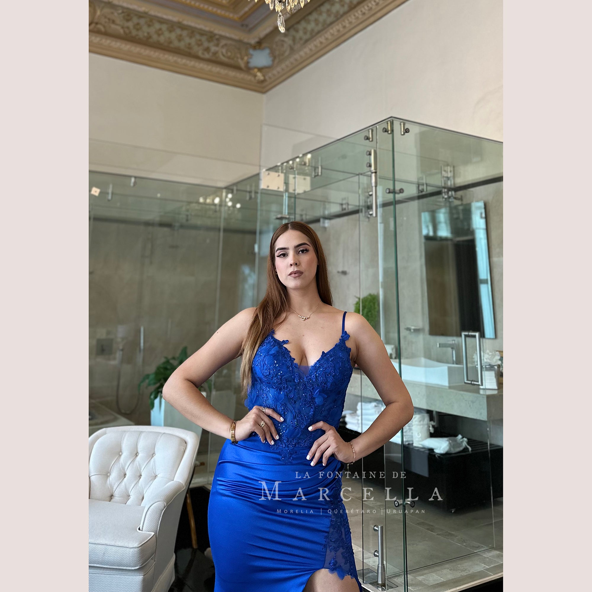 Vestido largo de corte sirena hermosamente adornado con transparencia y apicación brillante.