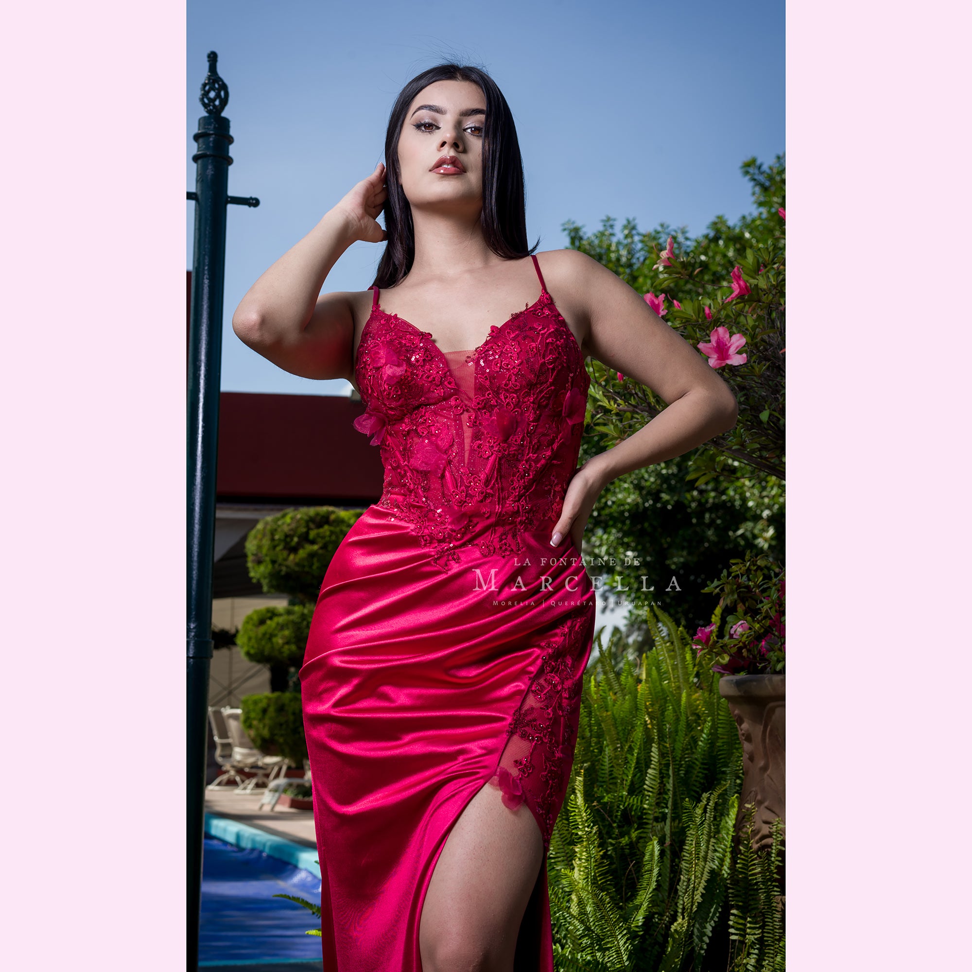 Vestido largo de corte sirena hermosamente adornado con transparencia y apicación brillante.Read more
