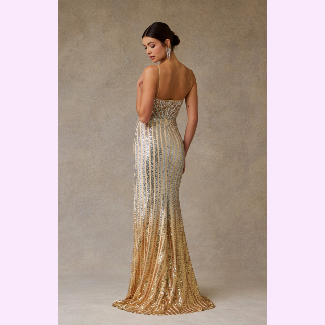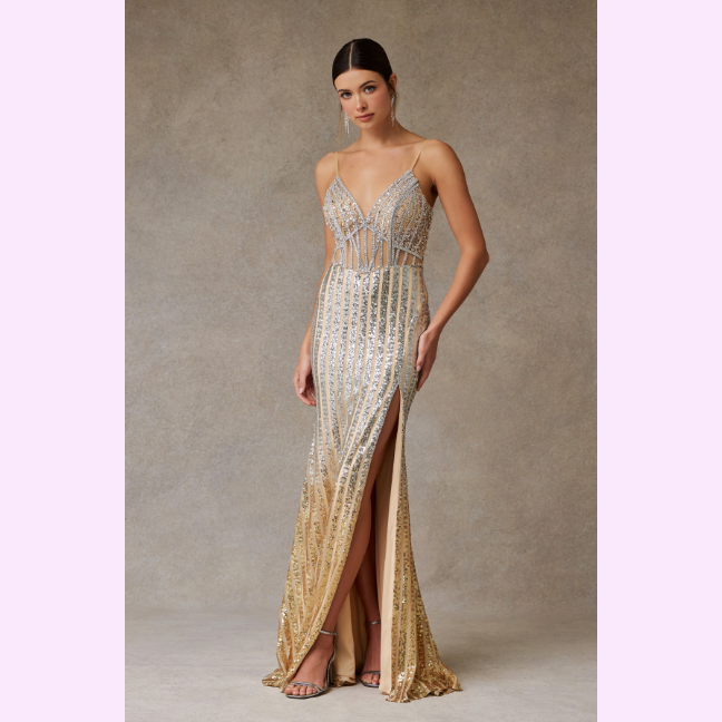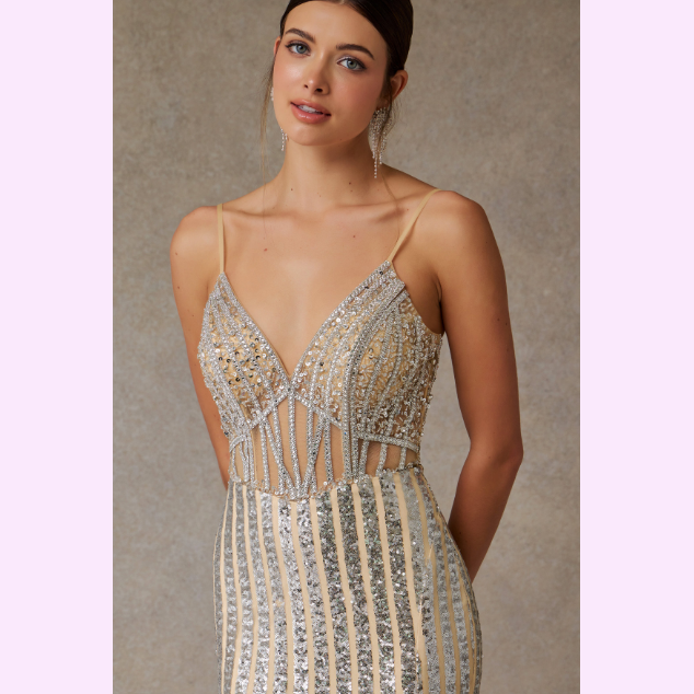 Vestido corte sirena adornado con un hermoso patrón en pedrería de fantasía, es recomendado para cuerpos tipo Reloj de Arena y Pera.