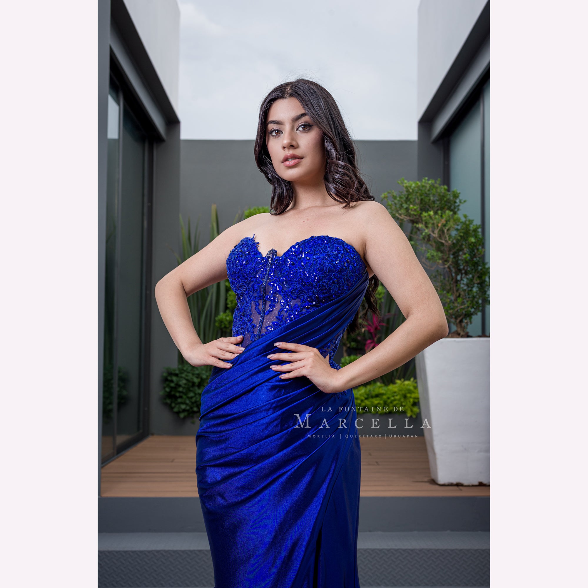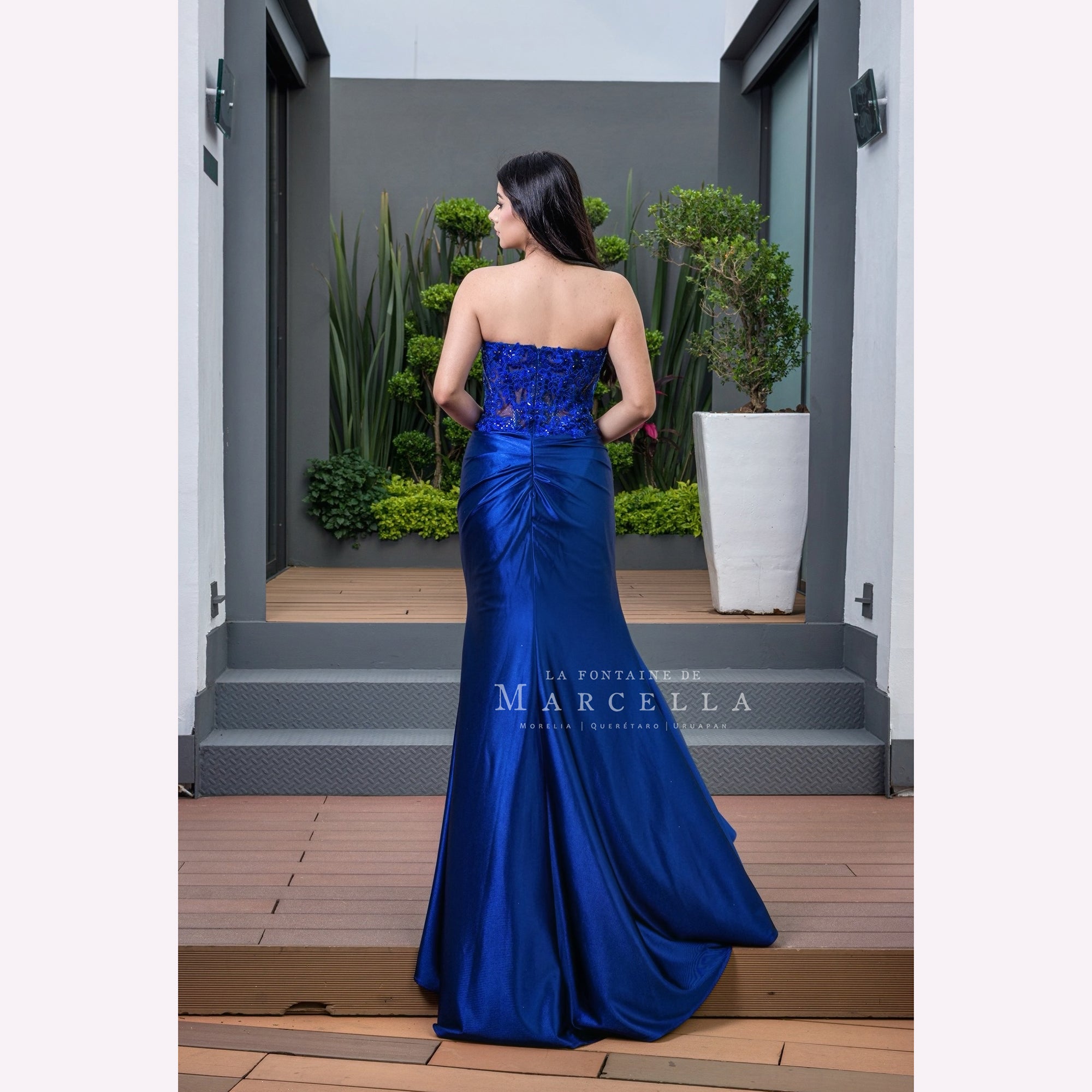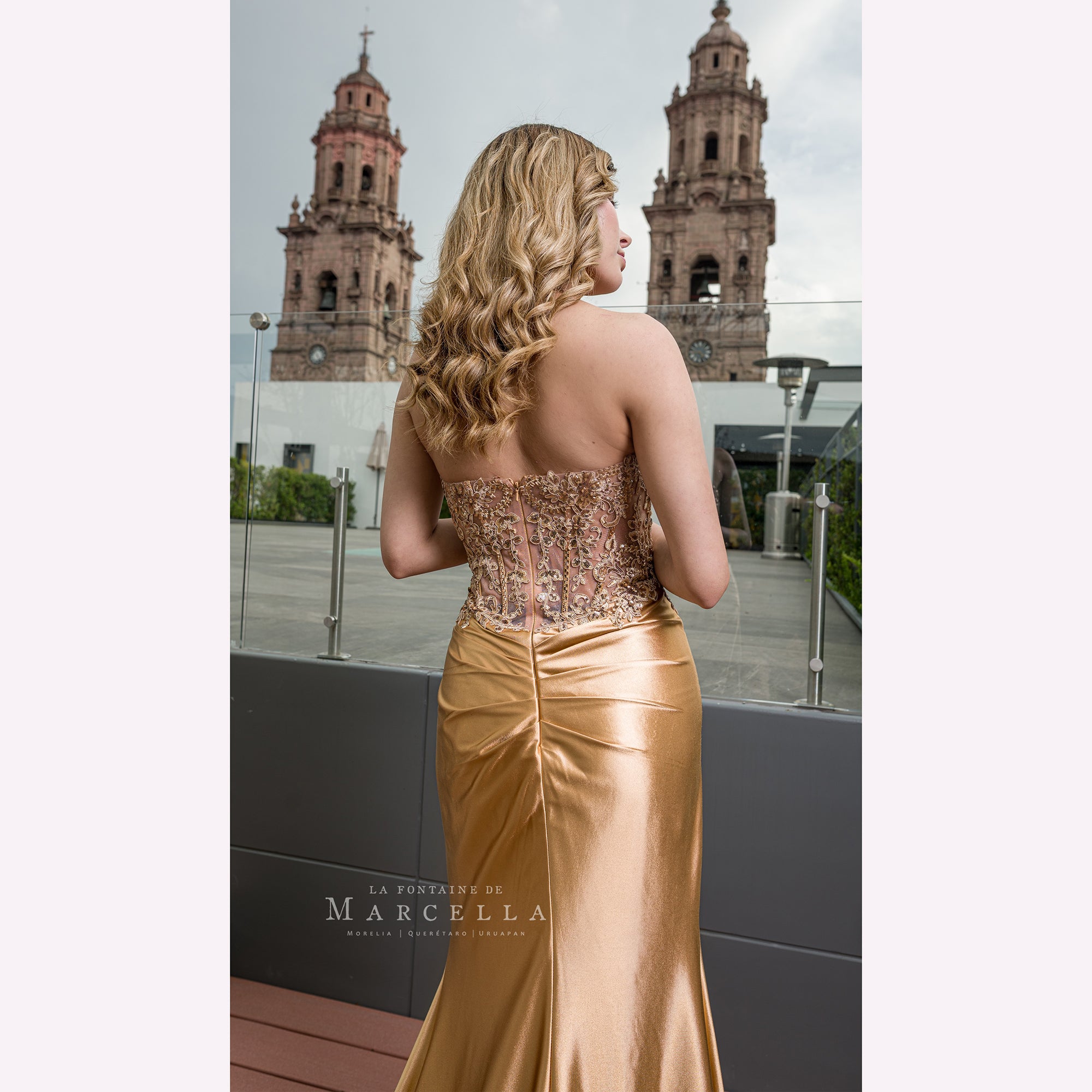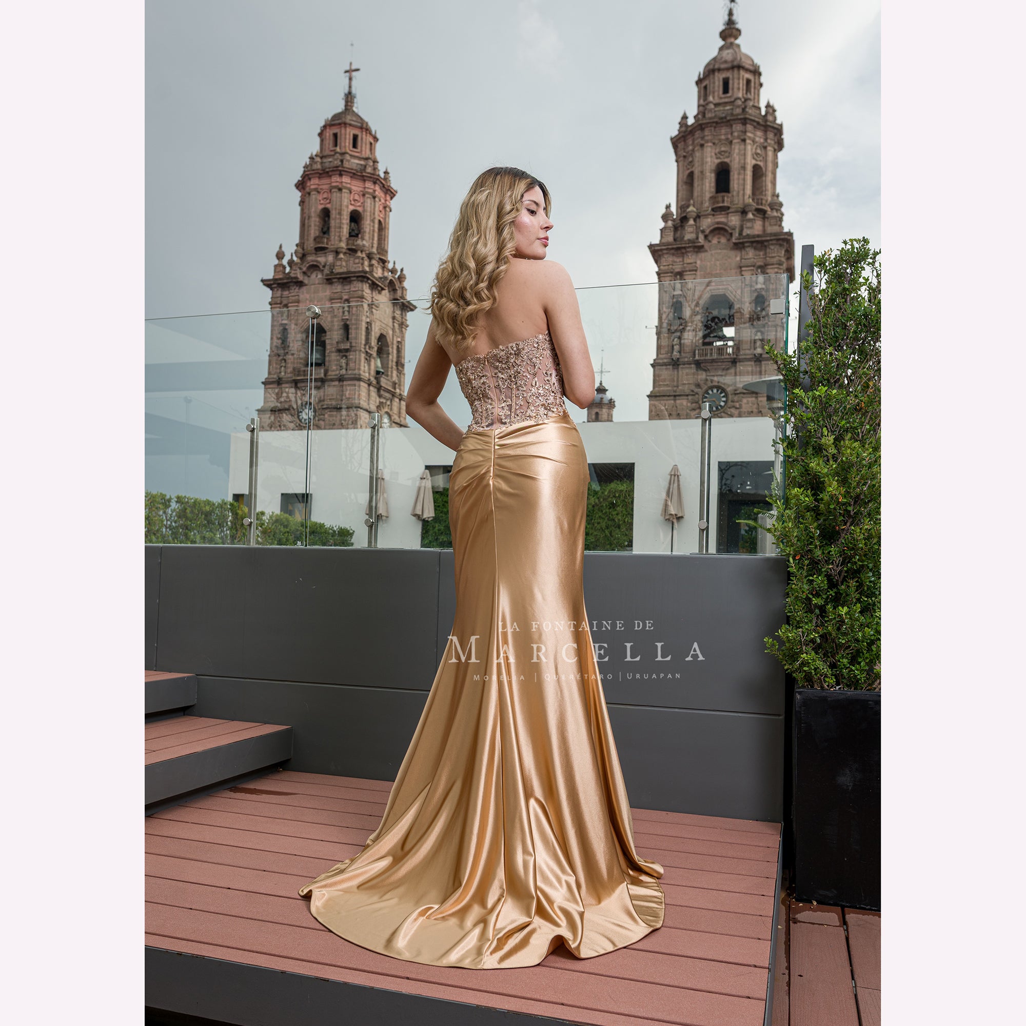 Vestido corte sirena con tela brillante y aplicación en la parte superior, con pliegues en el abdomen que ayudan a contornear la silueta, es recomendado para cuerpos tipo Reloj de Arena y Pera.Read more