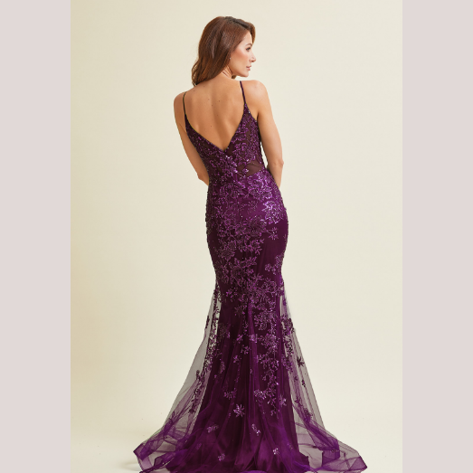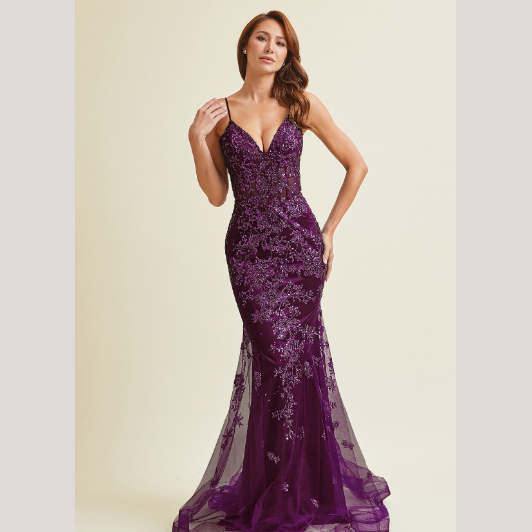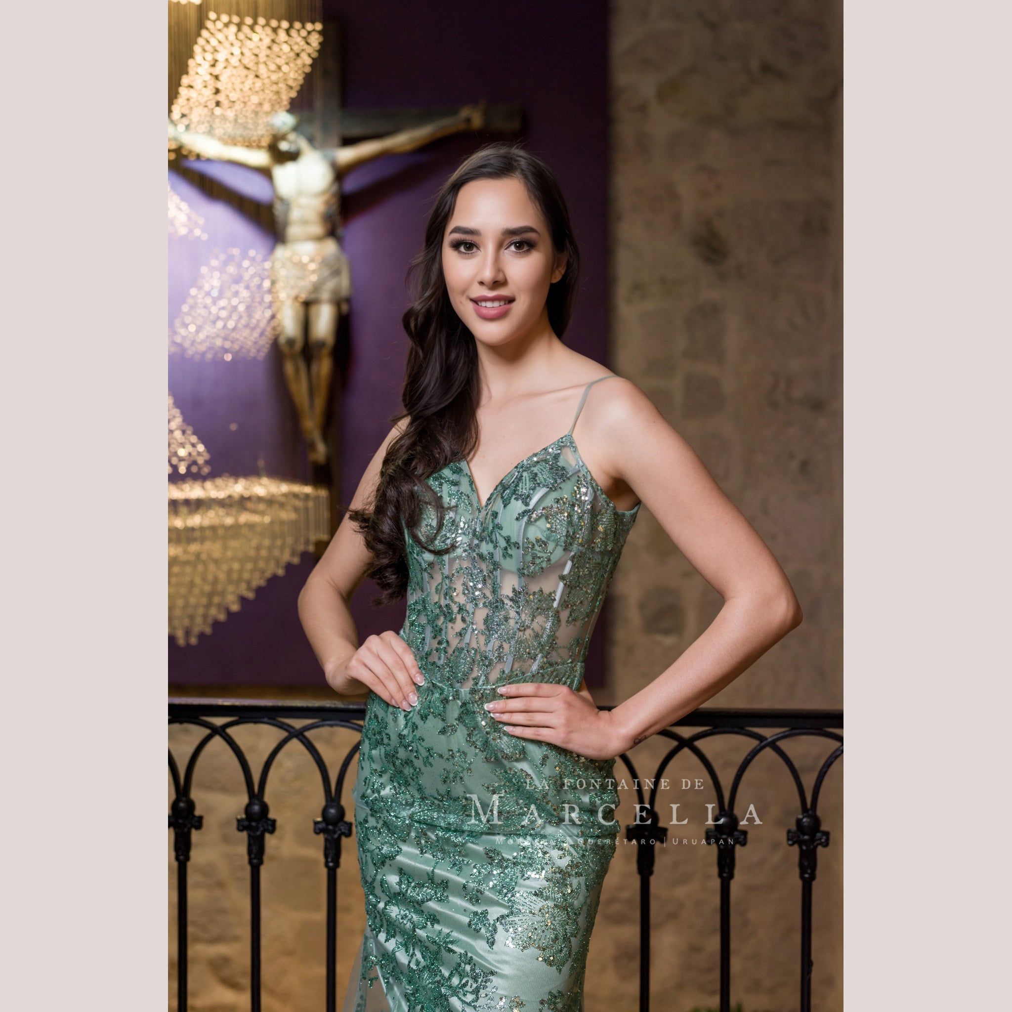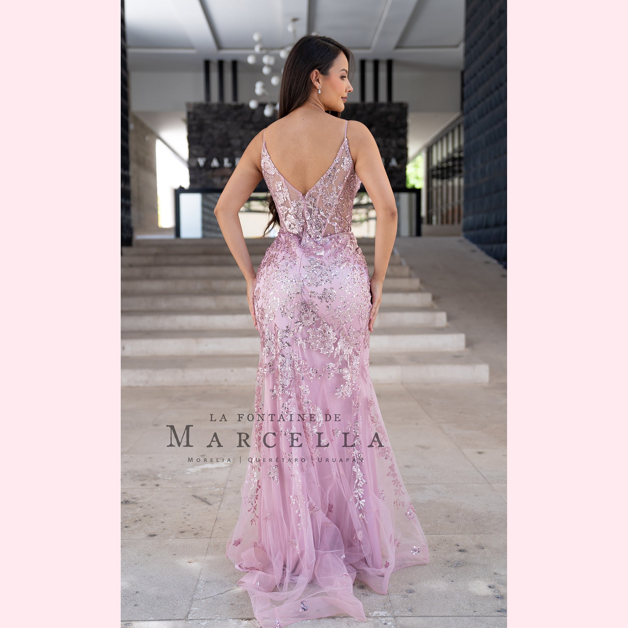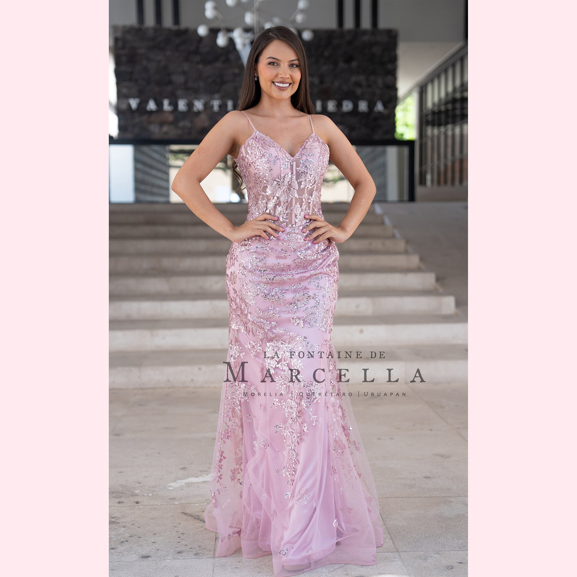 Vestido largo con corte sirena y transparencia en la parte superior que emula un corsé, con hermosa aplicación brillante, recomendado para cuerpos tipo Reloj de Arena y Pera.Read more