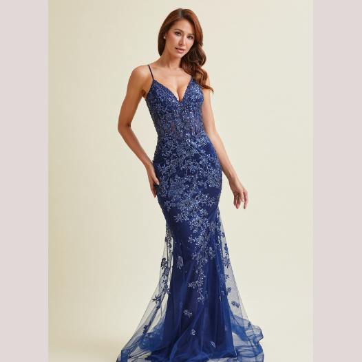 Vestido largo con corte sirena y transparencia en la parte superior que emula un corsé, con hermosa aplicación brillante, recomendado para cuerpos tipo Reloj de Arena y Pera.