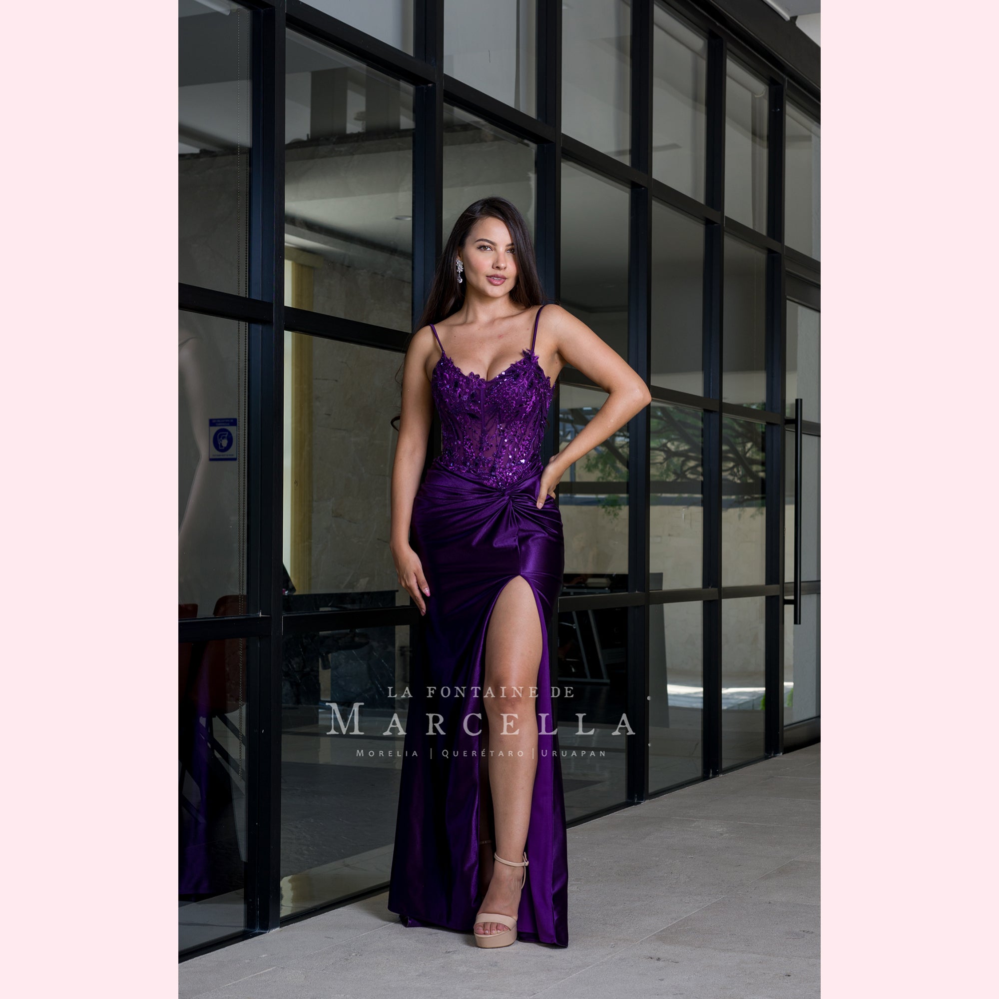 Vestido largo corte sirena, adornado con transparencia y una abertura en la pierna es recomendado para cuerpos tipo Reloj de Arena y Pera.Read more