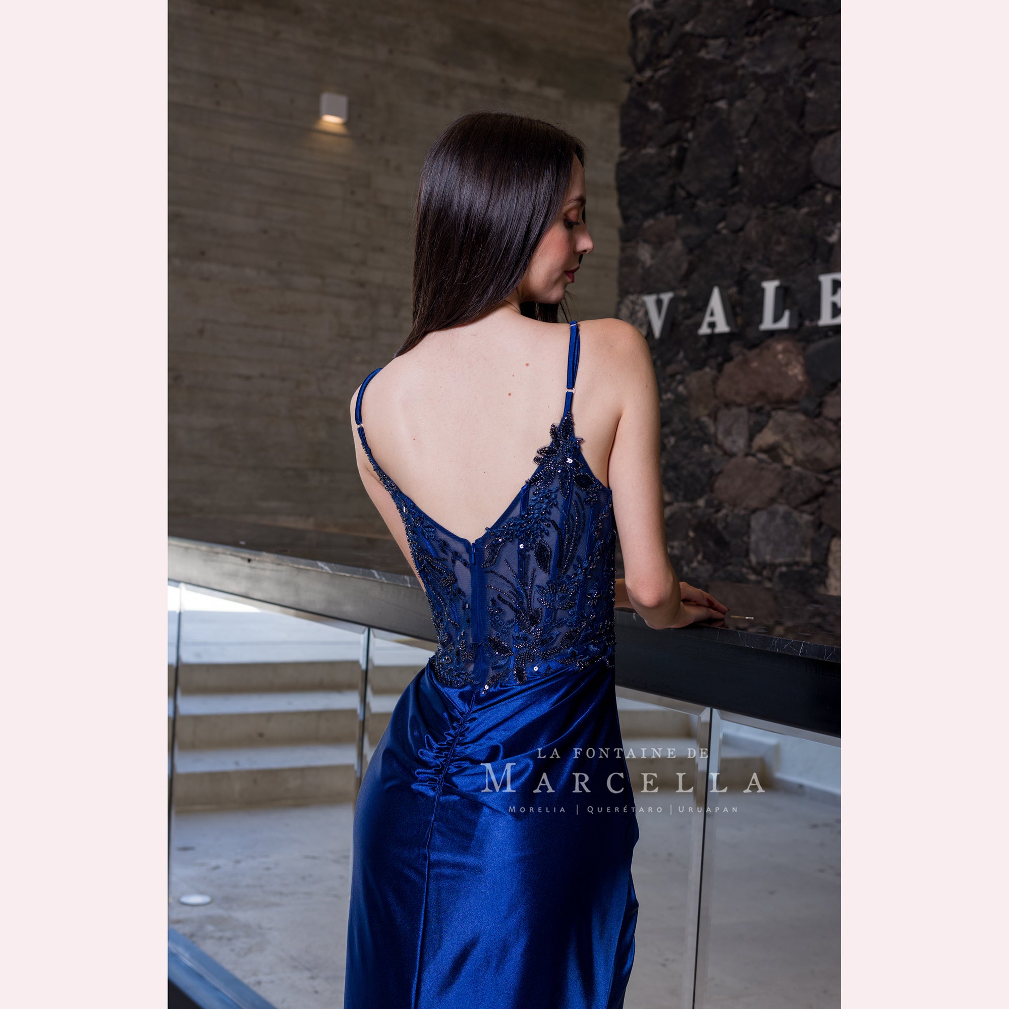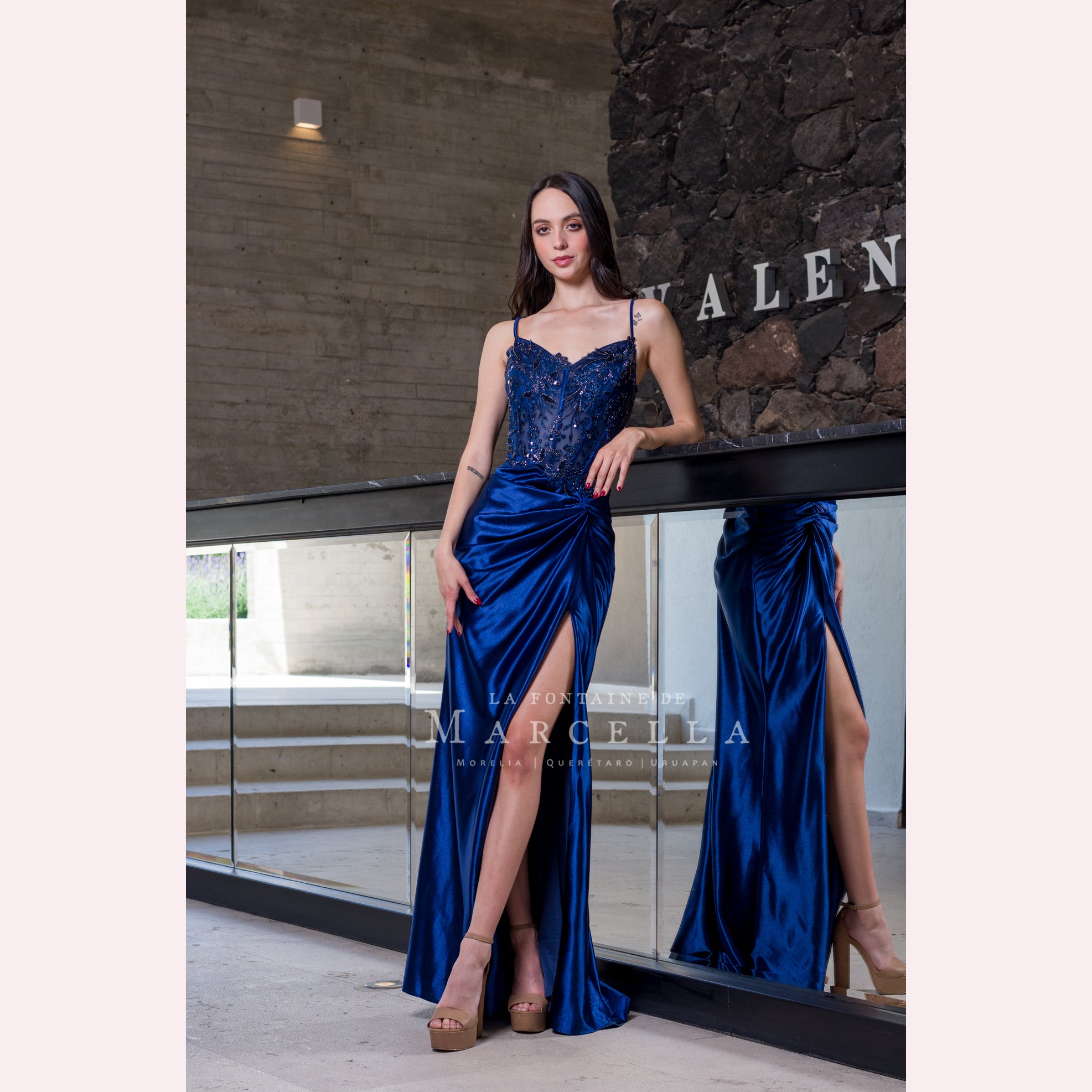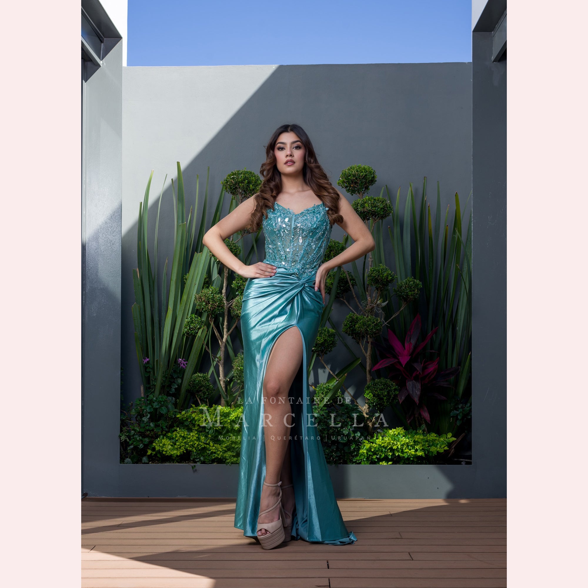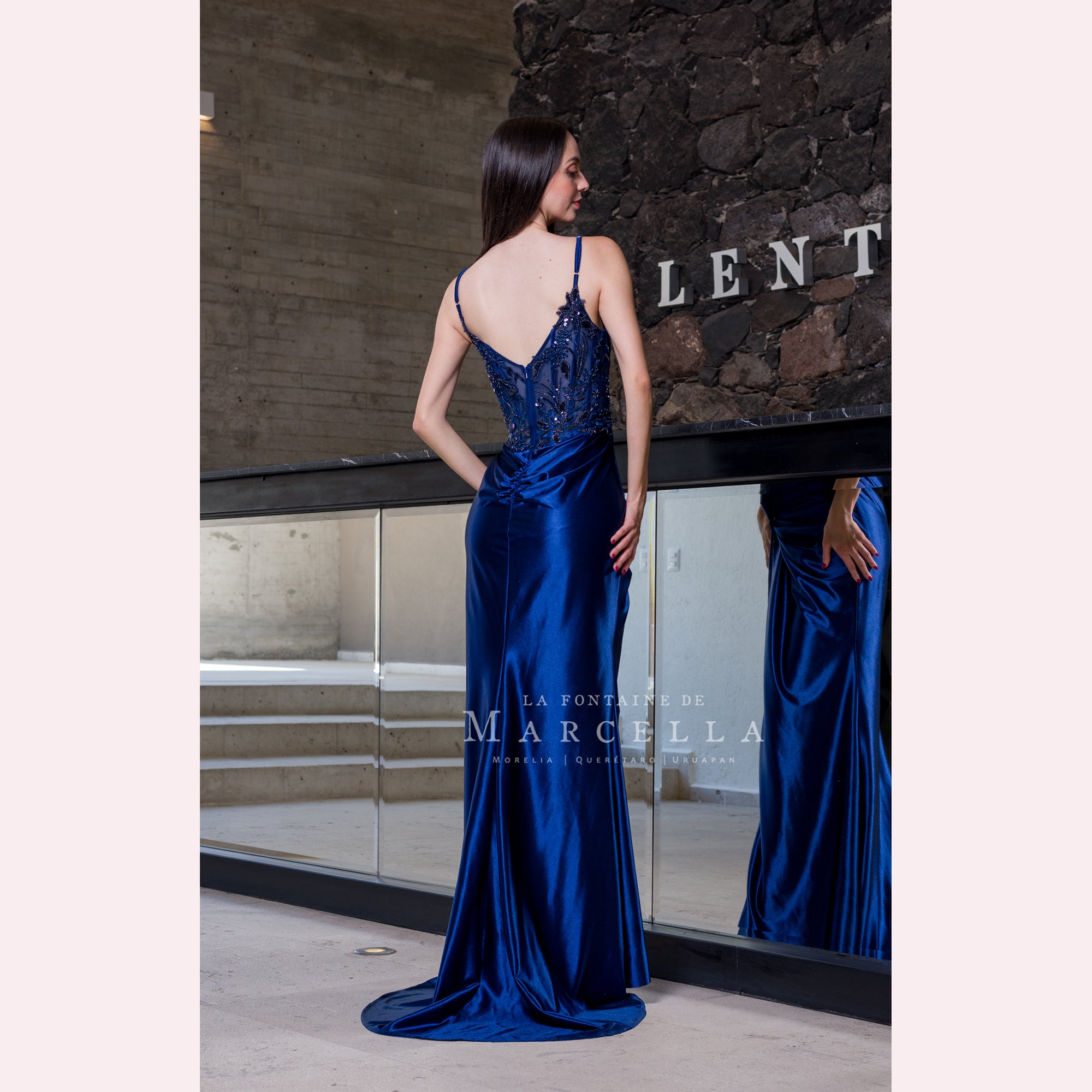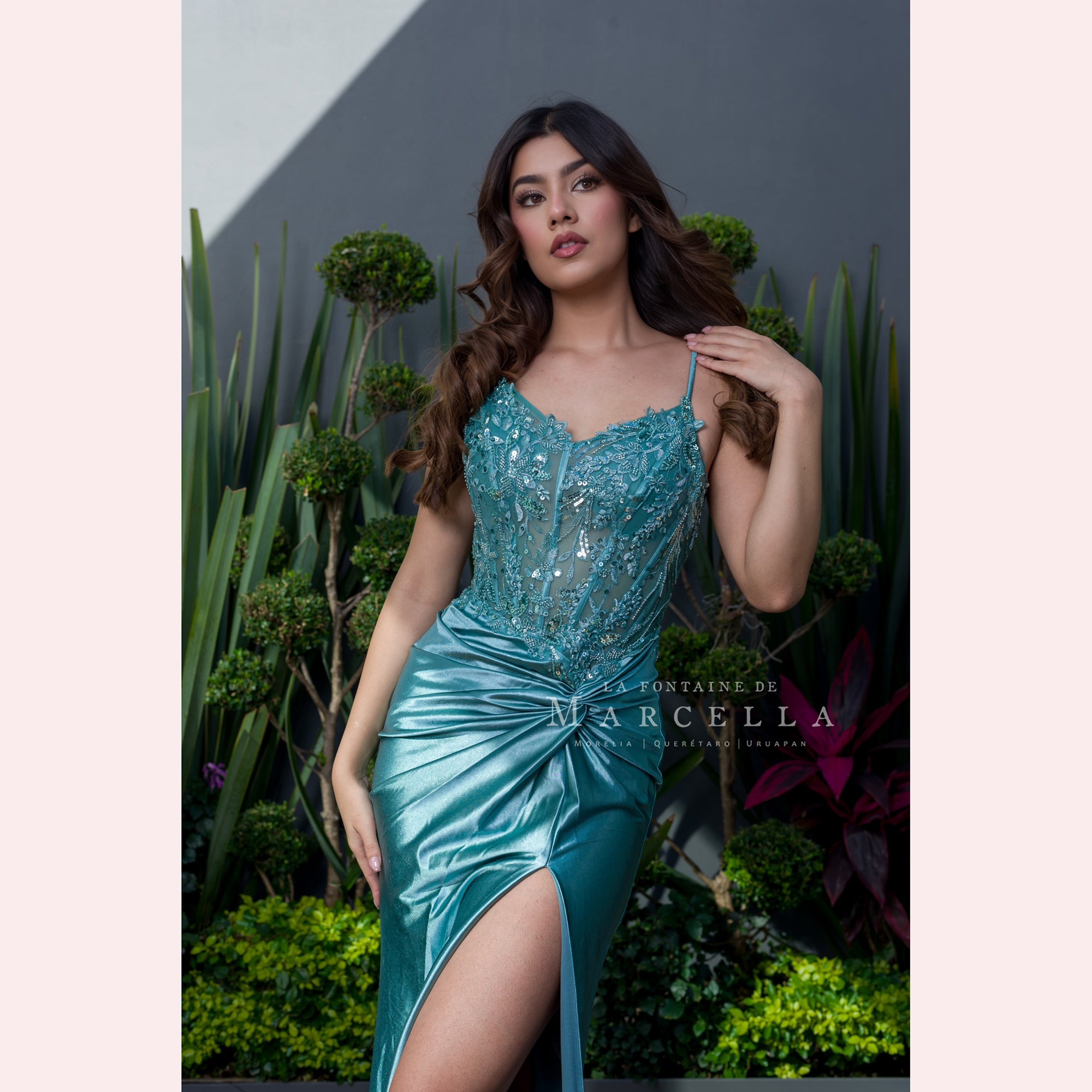 Vestido largo corte sirena, adornado con transparencia y una abertura en la pierna es recomendado para cuerpos tipo Reloj de Arena y Pera.