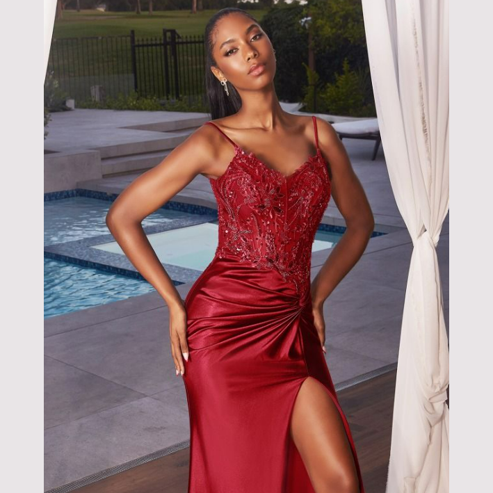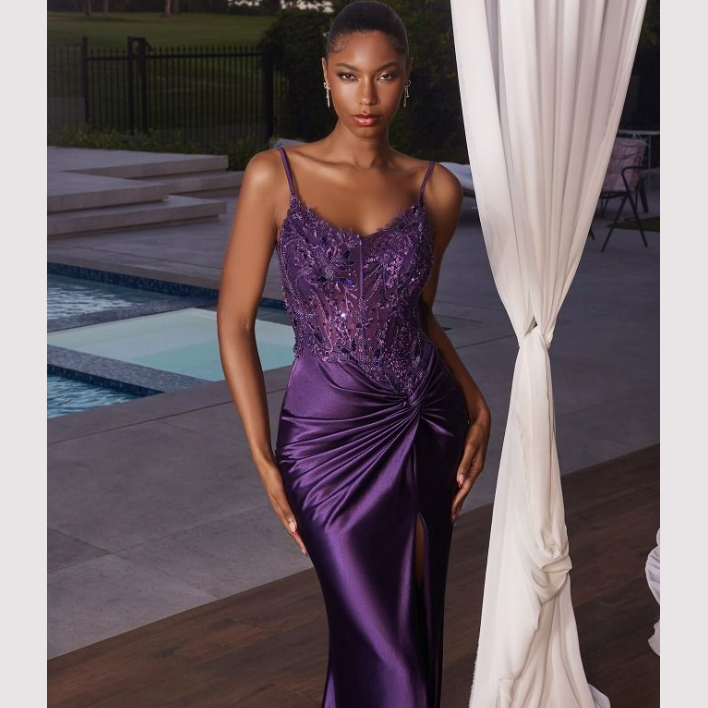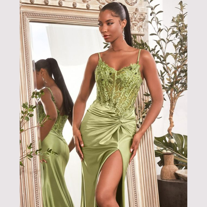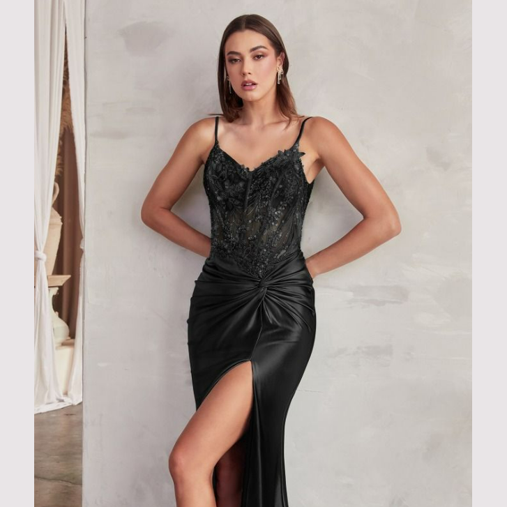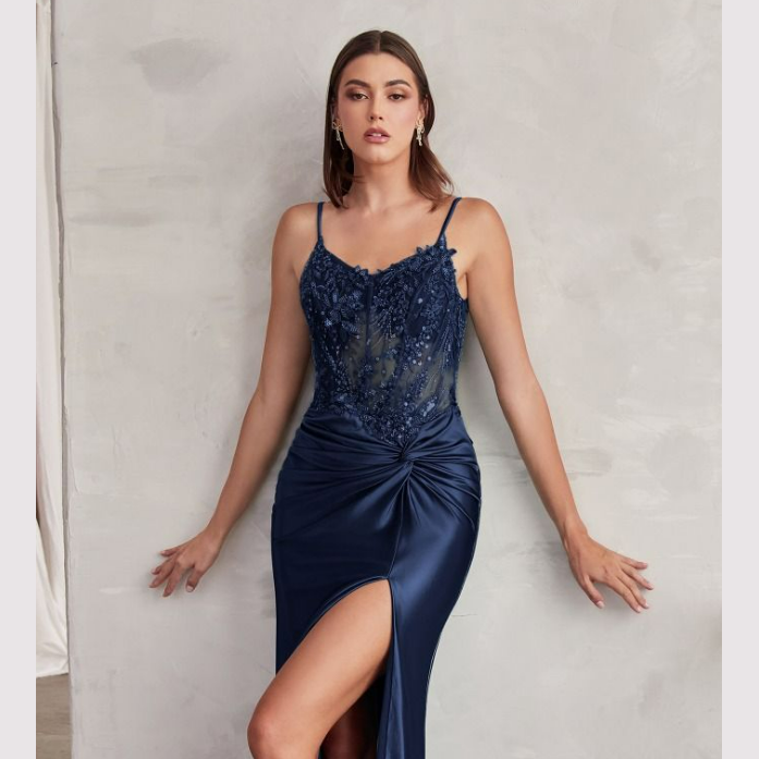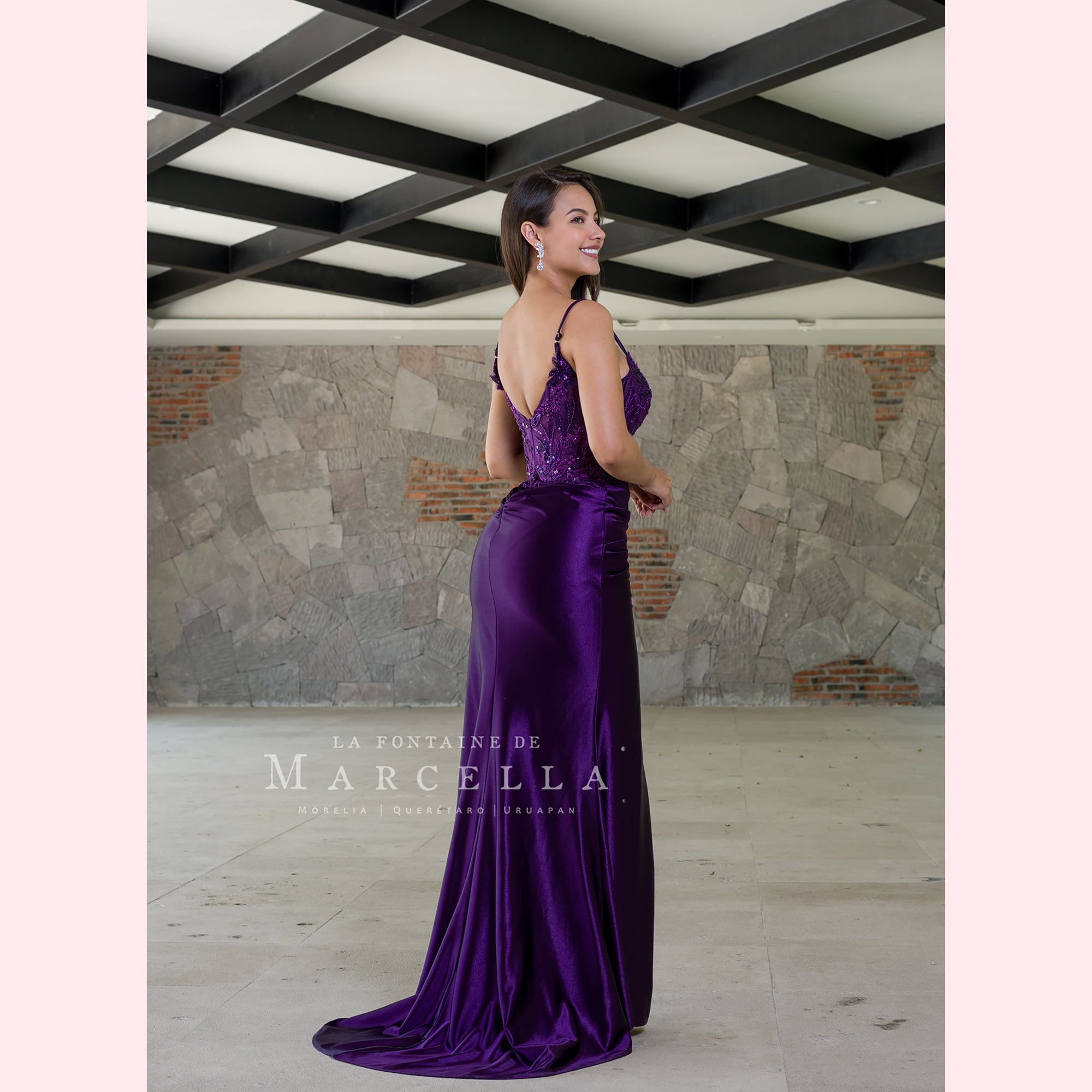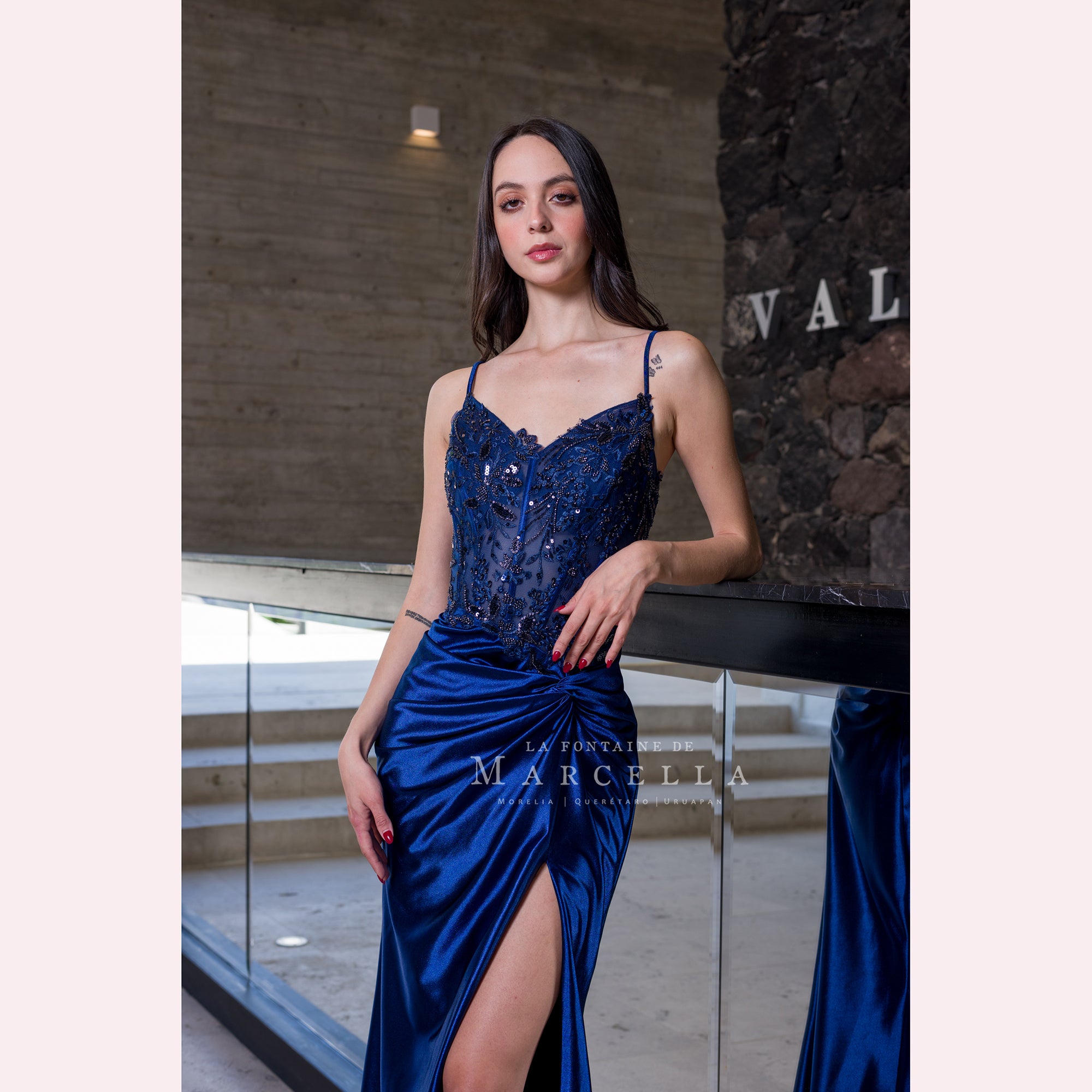 Vestido largo corte sirena, adornado con transparencia y una abertura en la pierna es recomendado para cuerpos tipo Reloj de Arena y Pera.