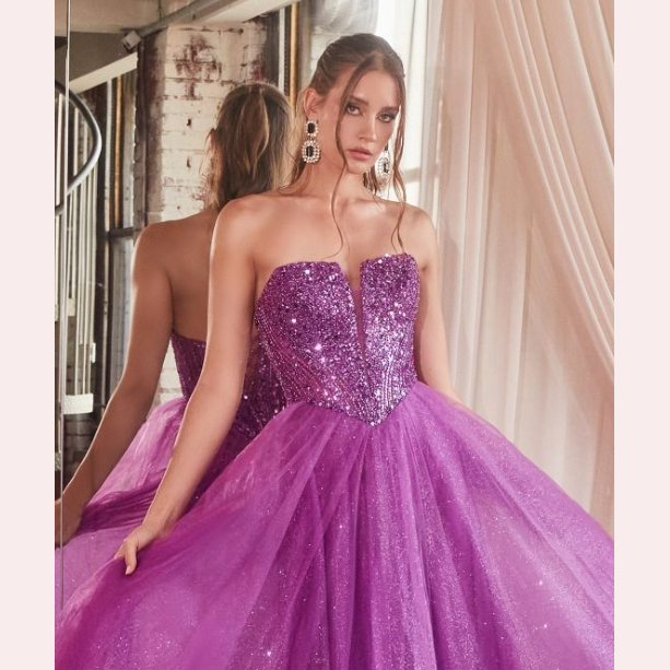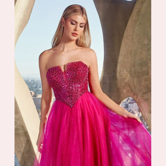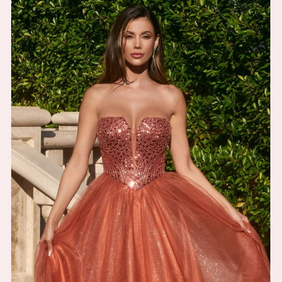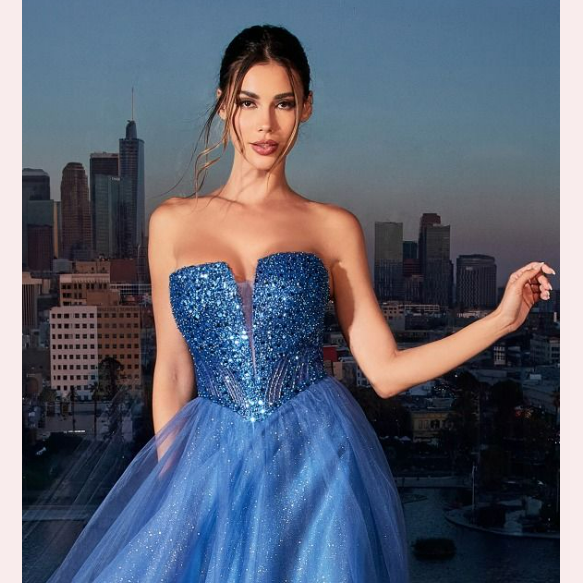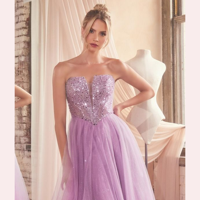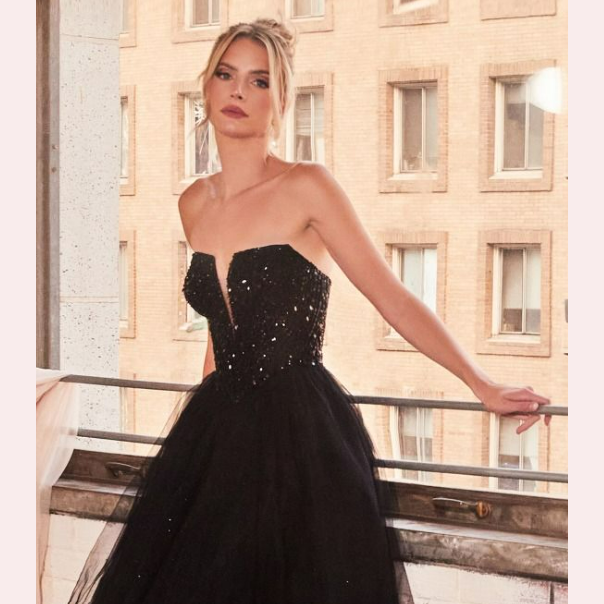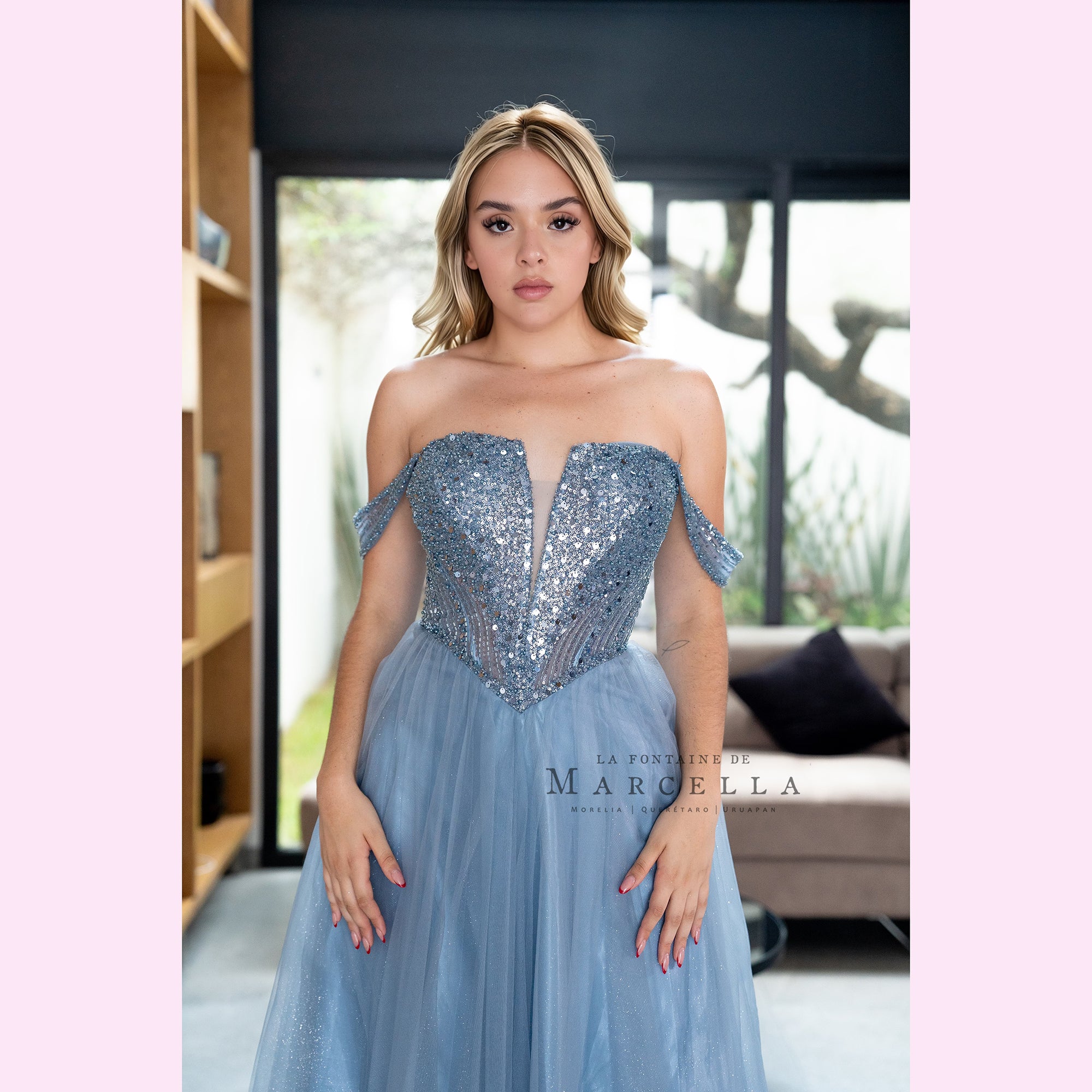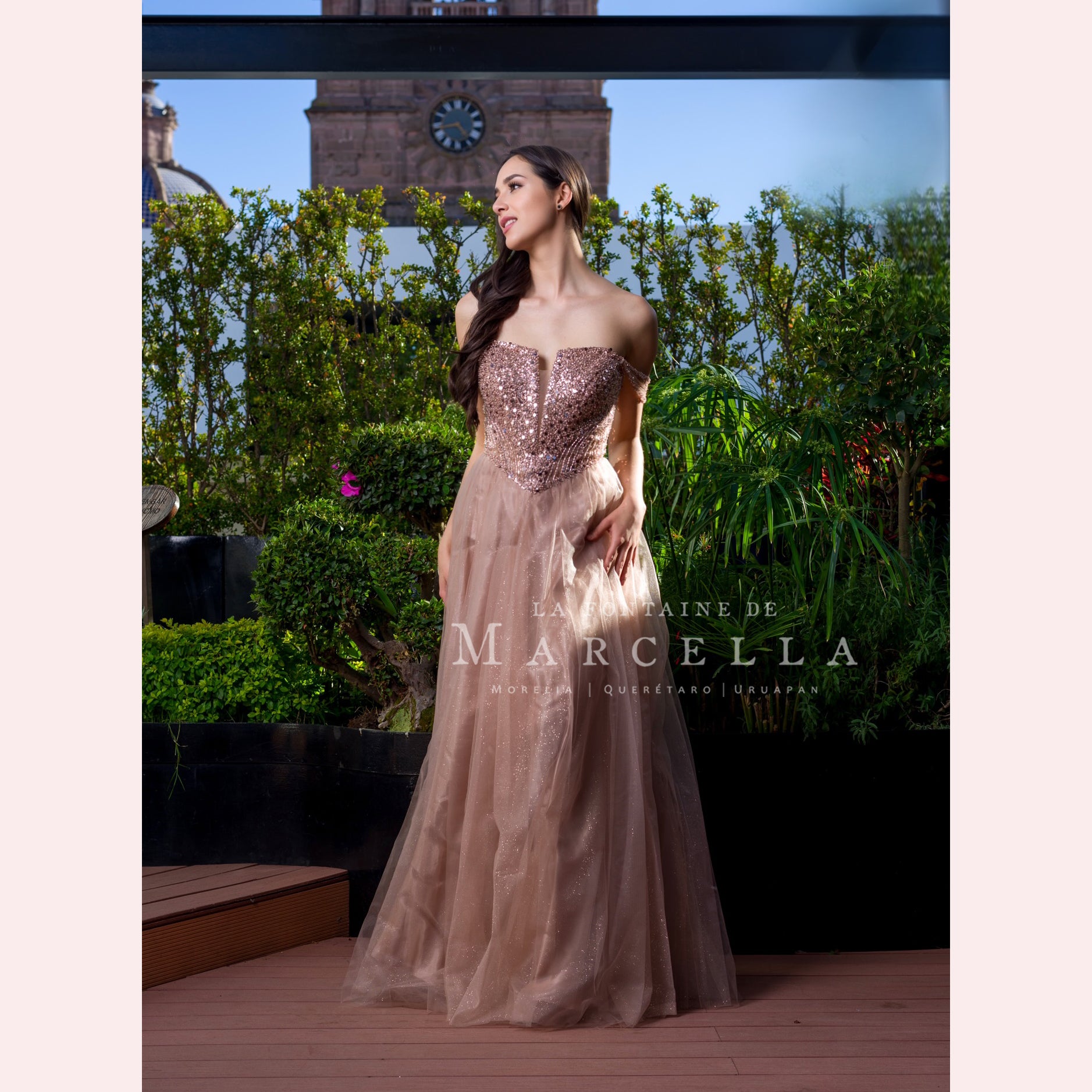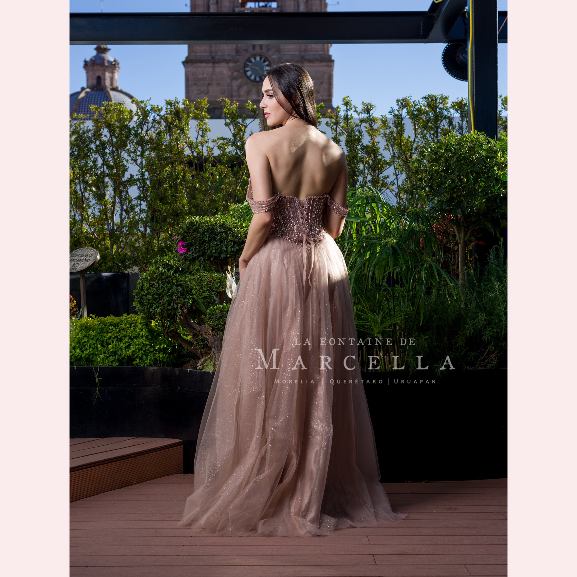 Vestido corte en A en tul con pequeño escote en V, mangas de ojal y adornado con pedrería fantasía es recomendado para cuerpos tipo Rectángulo y Pera.
