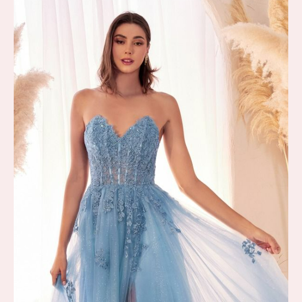 Vestido corte en A en tul, de escote corazón adornado con aplicación en la parte superior, es recomendado para cuerpos tipo Triangulo Invertido y Rectángulo.