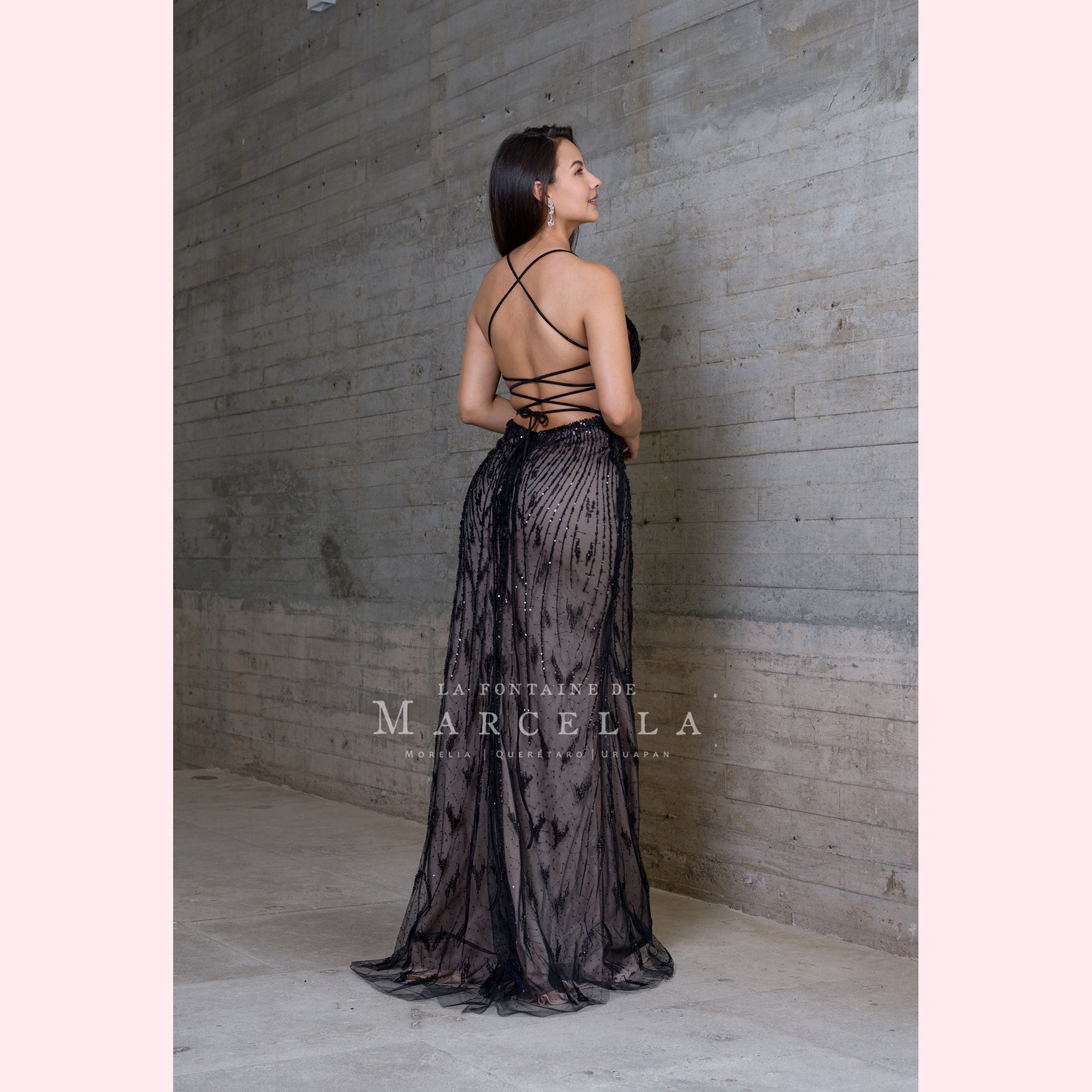 Vestido corte sirena con tirante delgado y patrón en diamantina, es recomendado para cuerpos tipo Reloj de Arena y Pera.