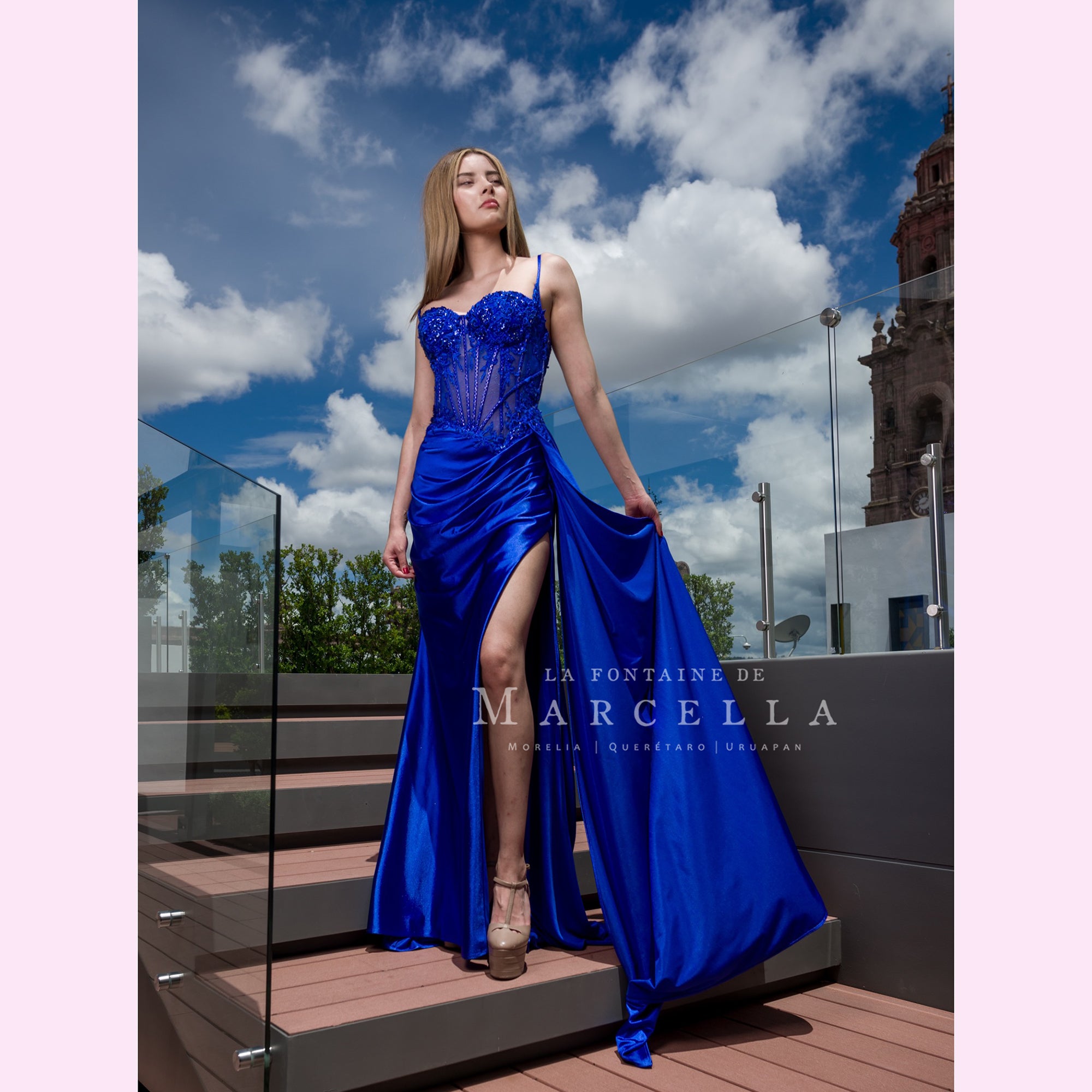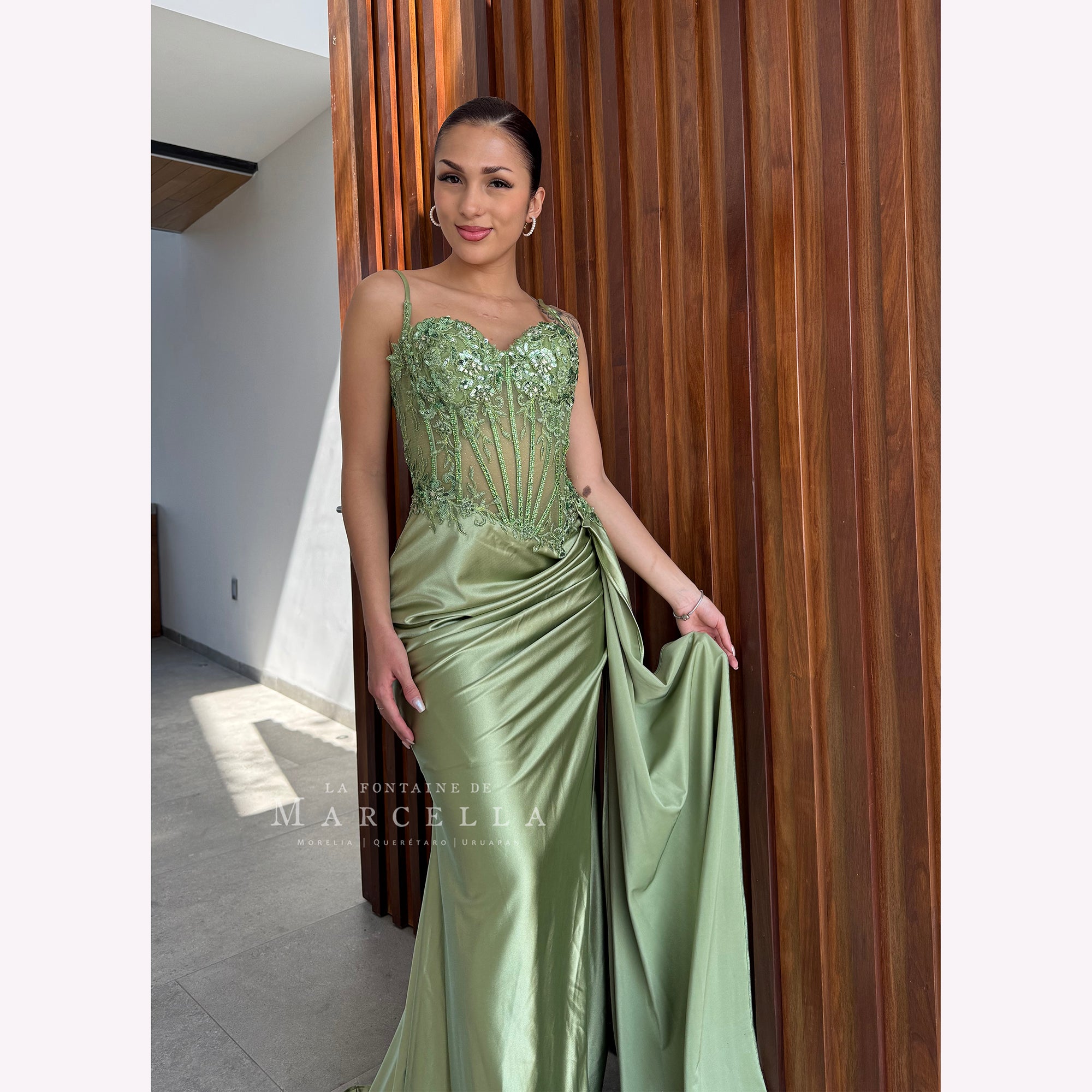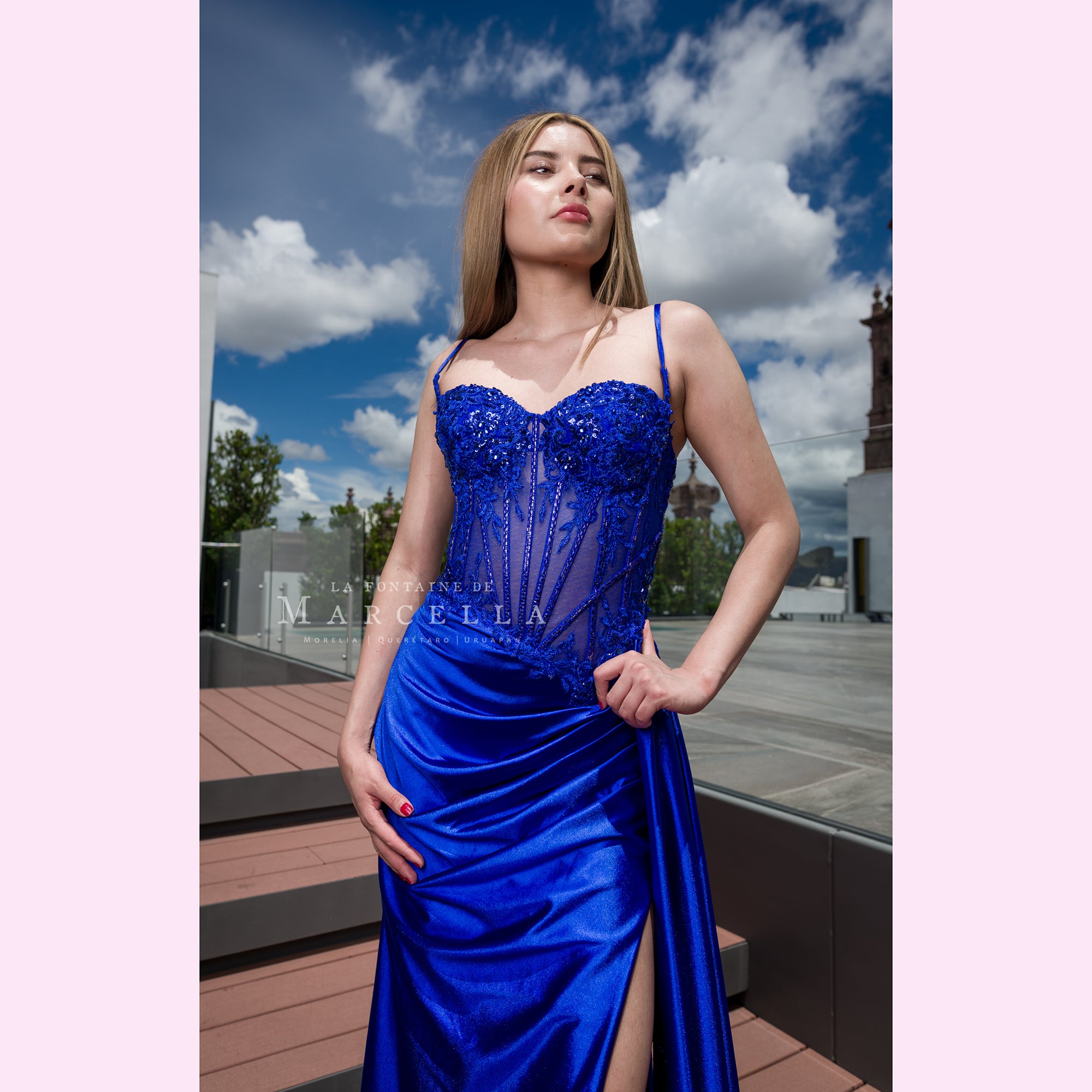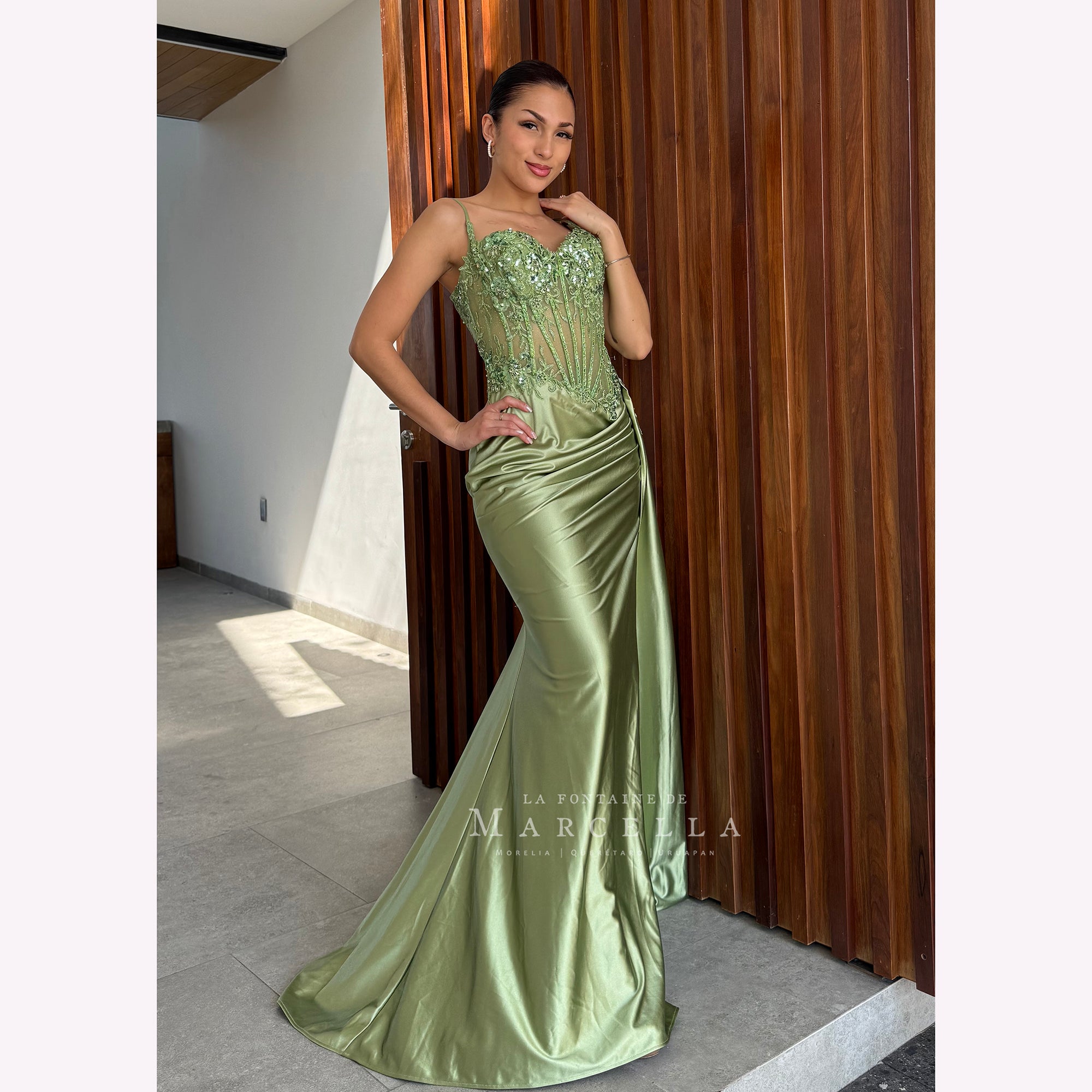 Vestido corte sirena con transparencia y brillo fantasía en la parte superior, en la parte inferior cuenta con abertura en la pierna y ensamble, es recomendado para cuerpos tipo Reloj de Arena y Rectángulo.