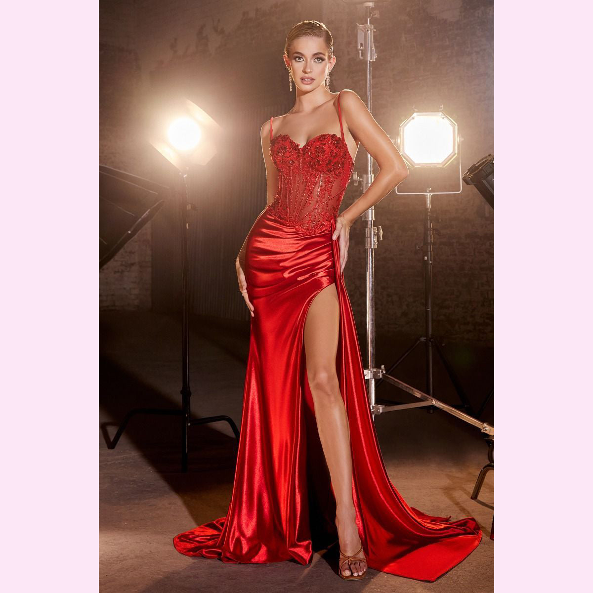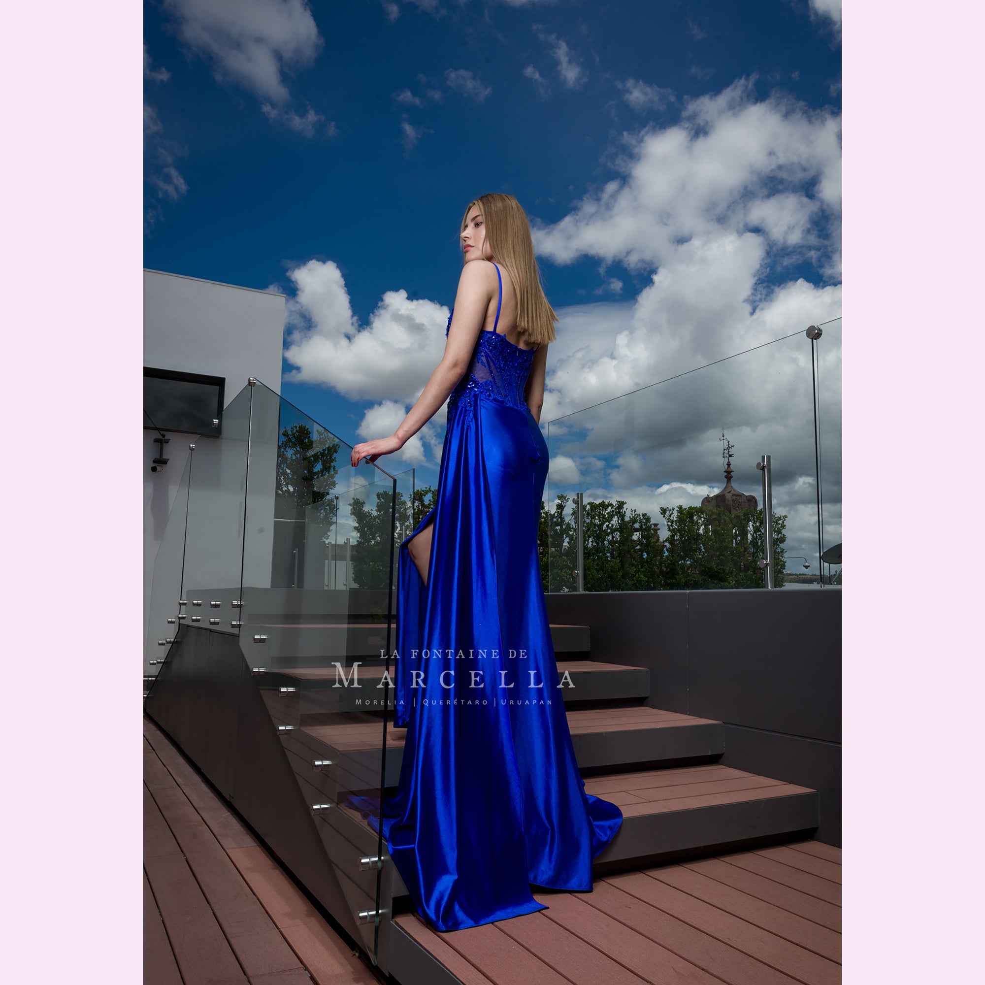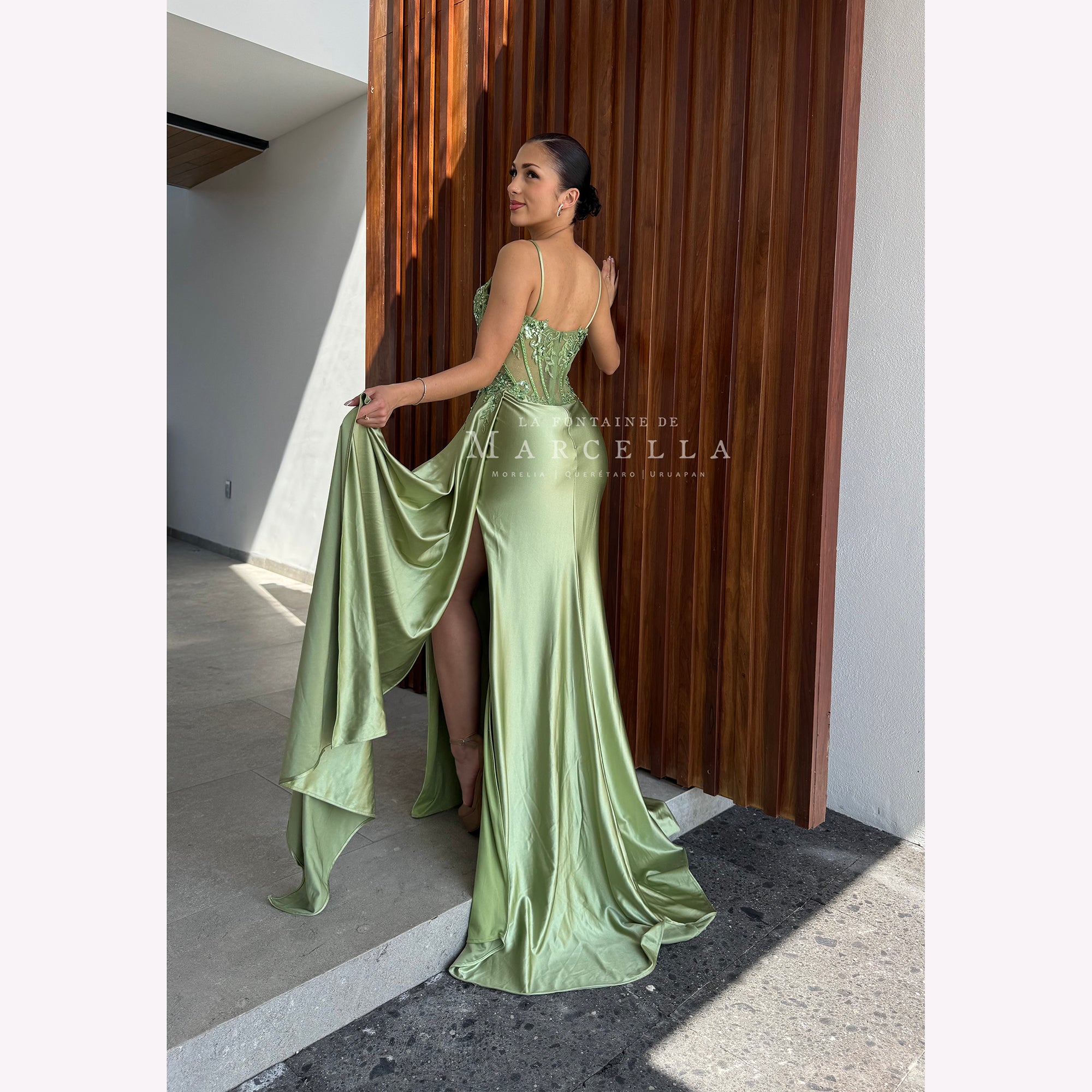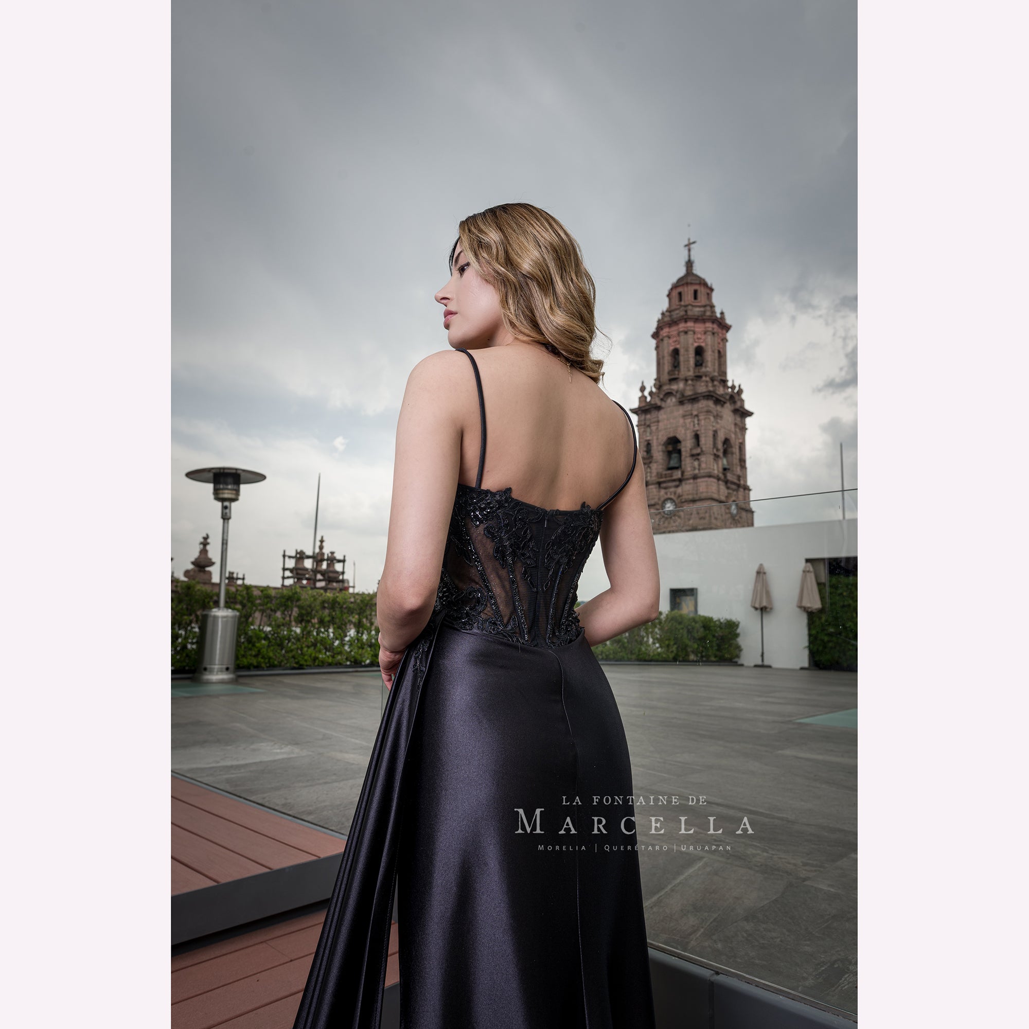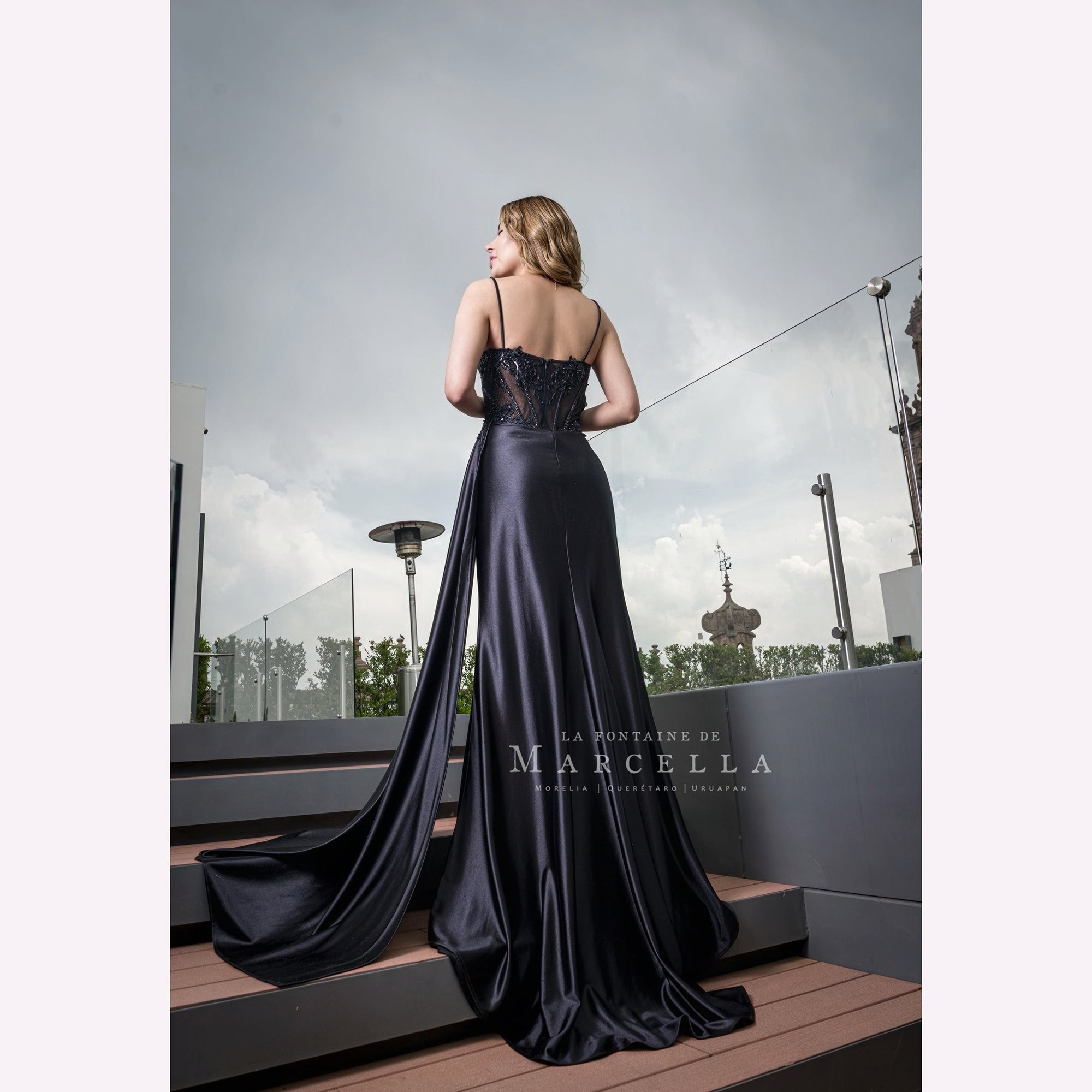 Vestido corte sirena con transparencia y brillo fantasía en la parte superior, en la parte inferior cuenta con abertura en la pierna y ensamble, es recomendado para cuerpos tipo Reloj de Arena y Rectángulo.