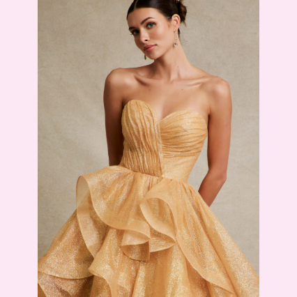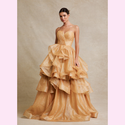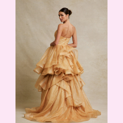 Vestido corte princesa en olanes con pliegues en la parte superior y escote corazón, es recomendado para cuerpos tipo Rectángulo y Triangulo Invertido.