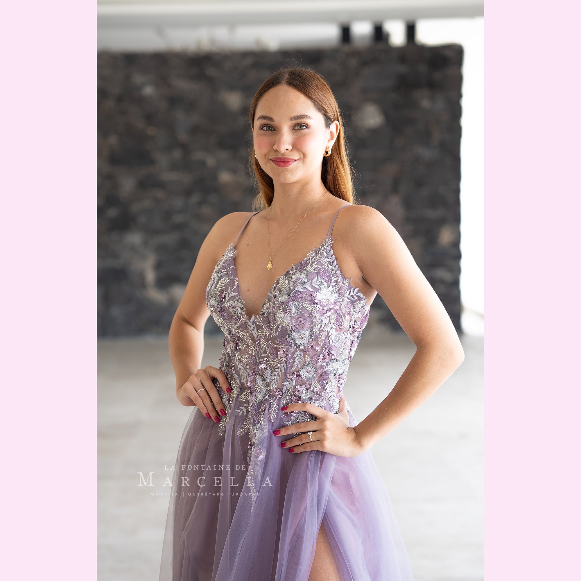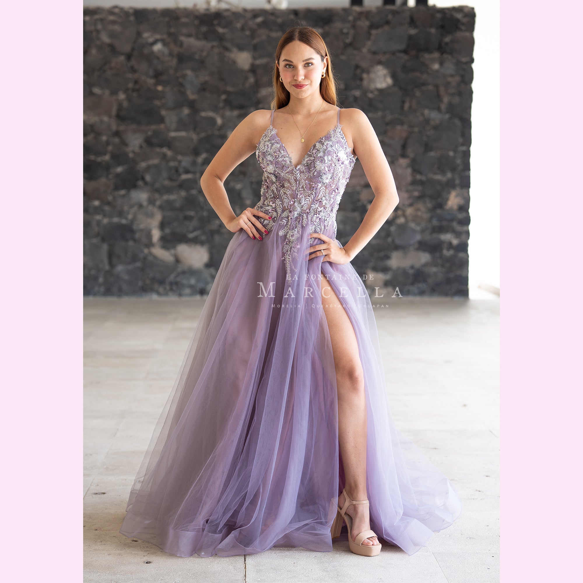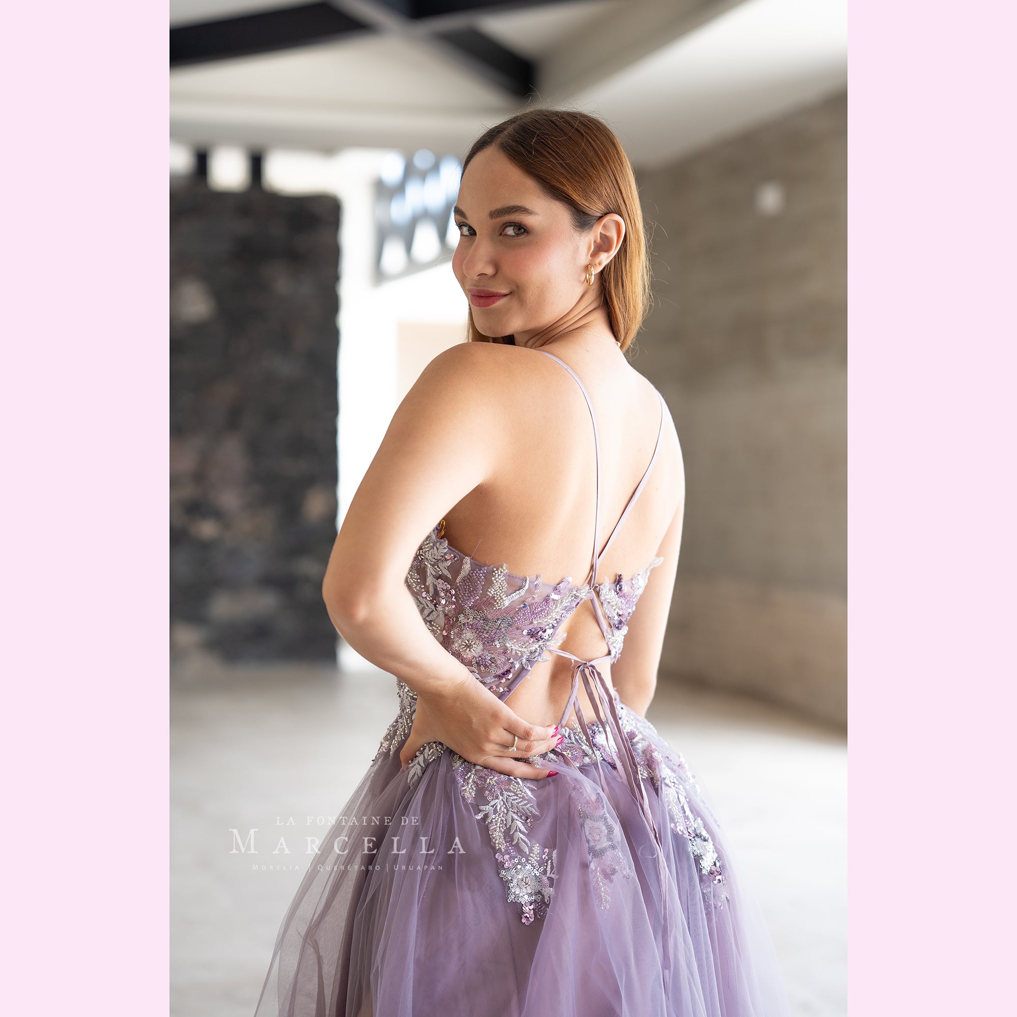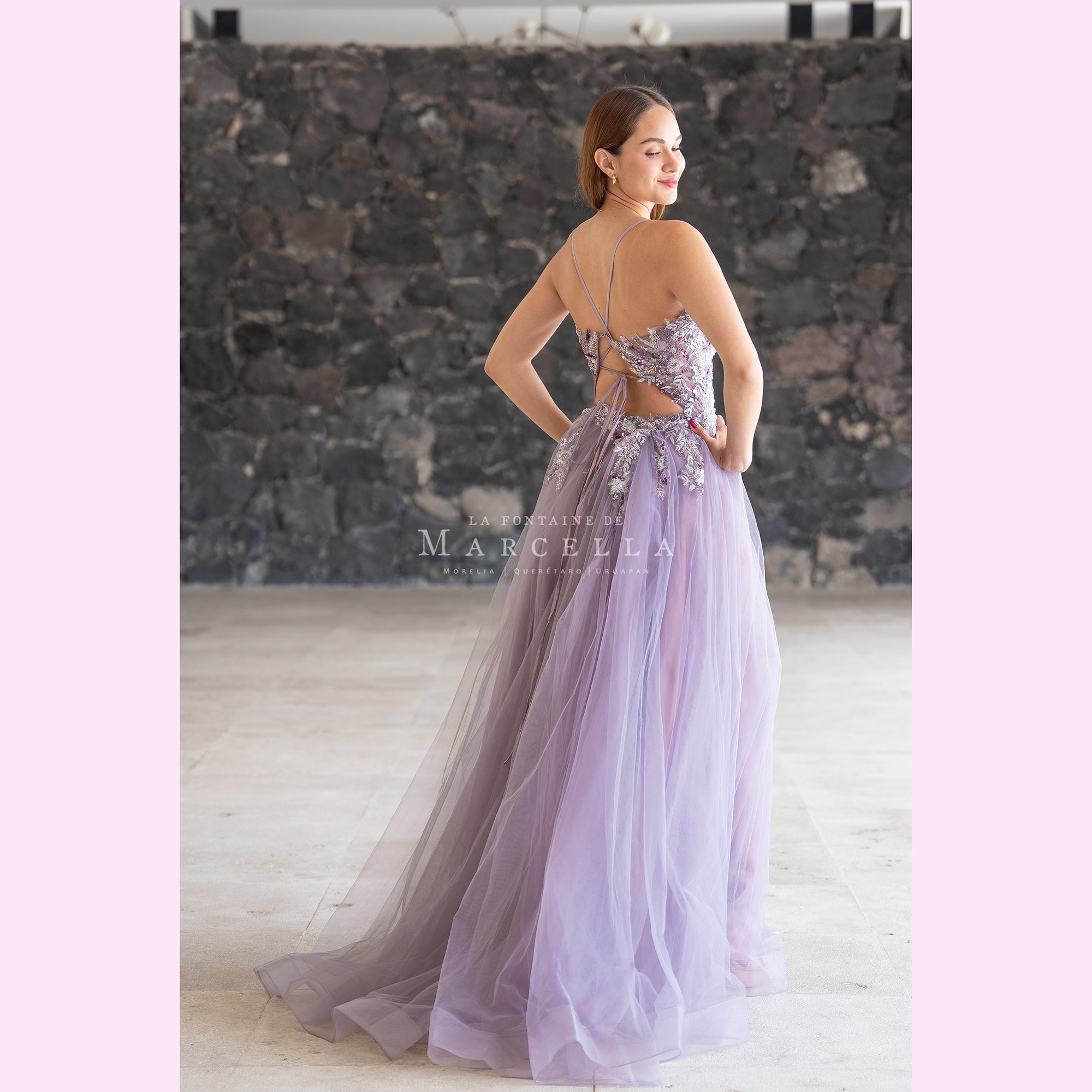 Vestido de tul en corte A con la espalda descubierta, con transparencia y aplicación brillante en la parte superior es recomendado para cuerpos tipo Reloj de Arena y Pera. Read more