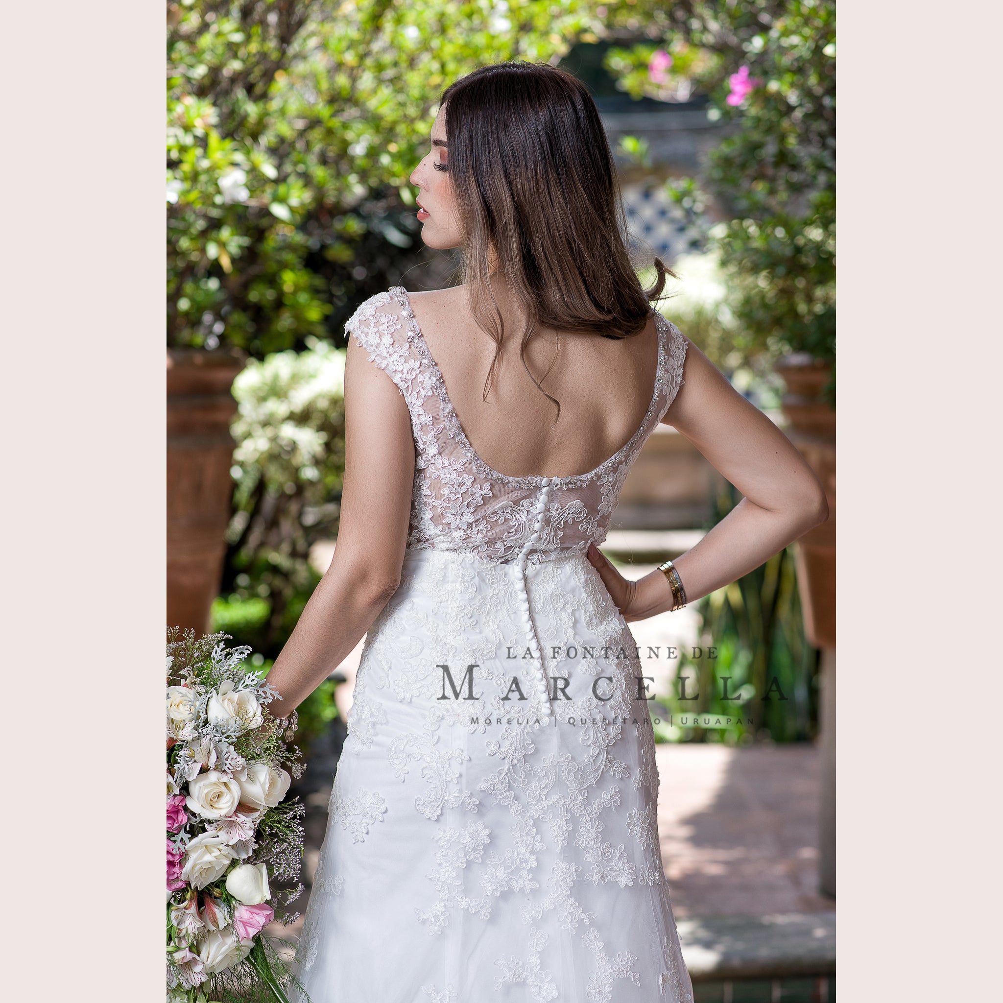 Vestido de novia de corte princesa con adorno de botón en la espalda.