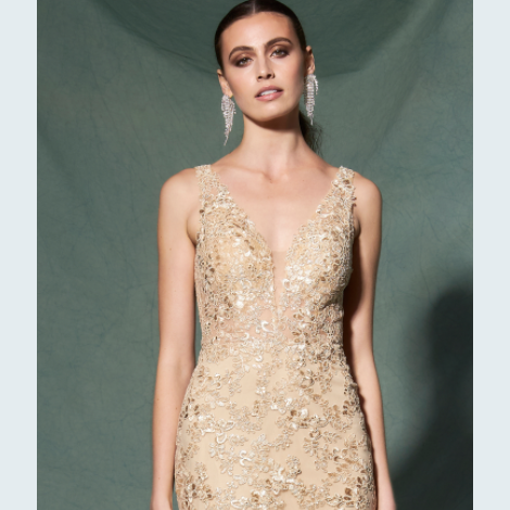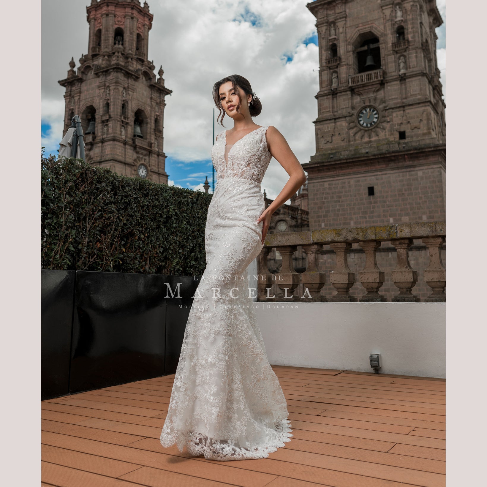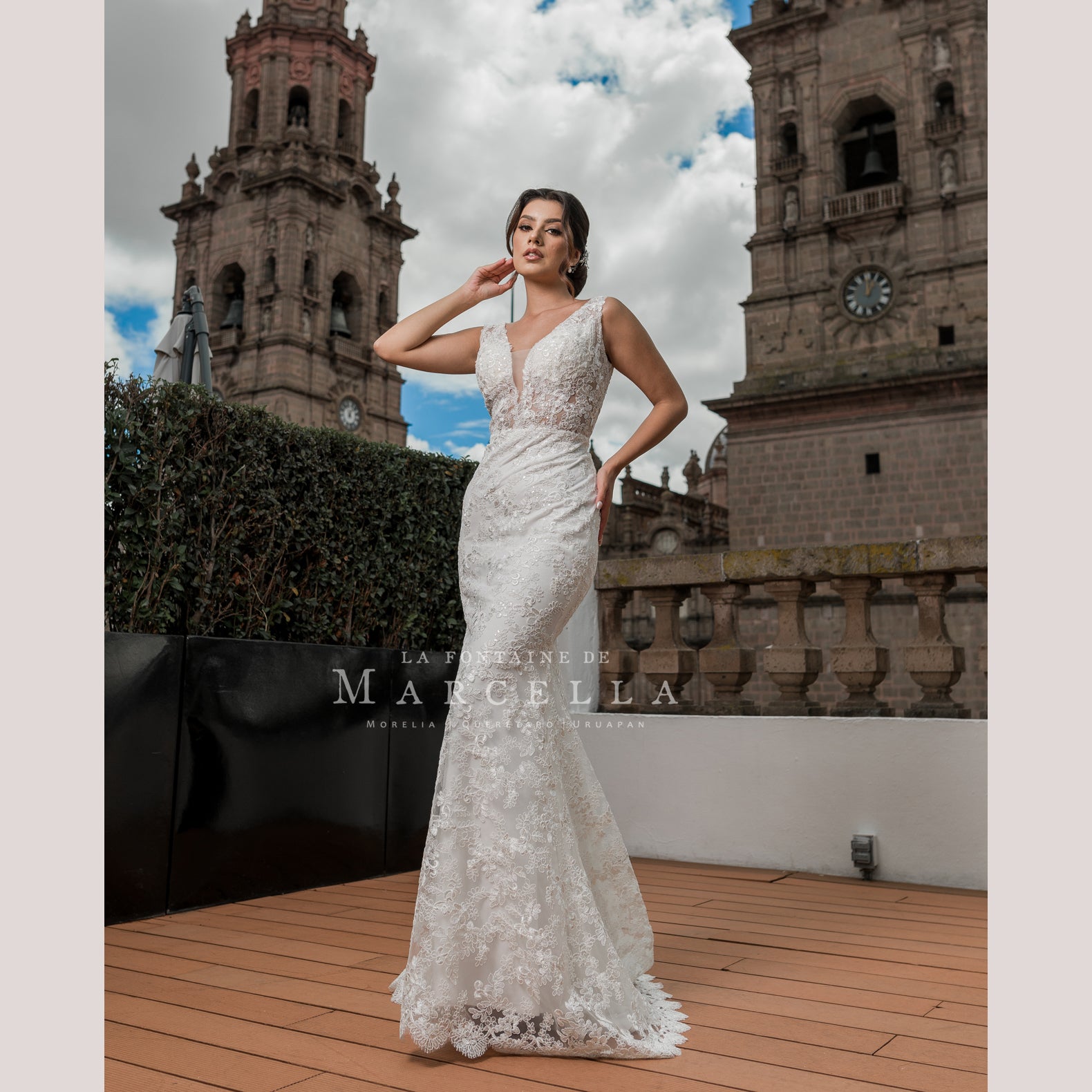 Vestido corte Sirena adornado completamente con aplicacion, recomendado para cuerpos tipo Reloj de Arena y Rectangulo.