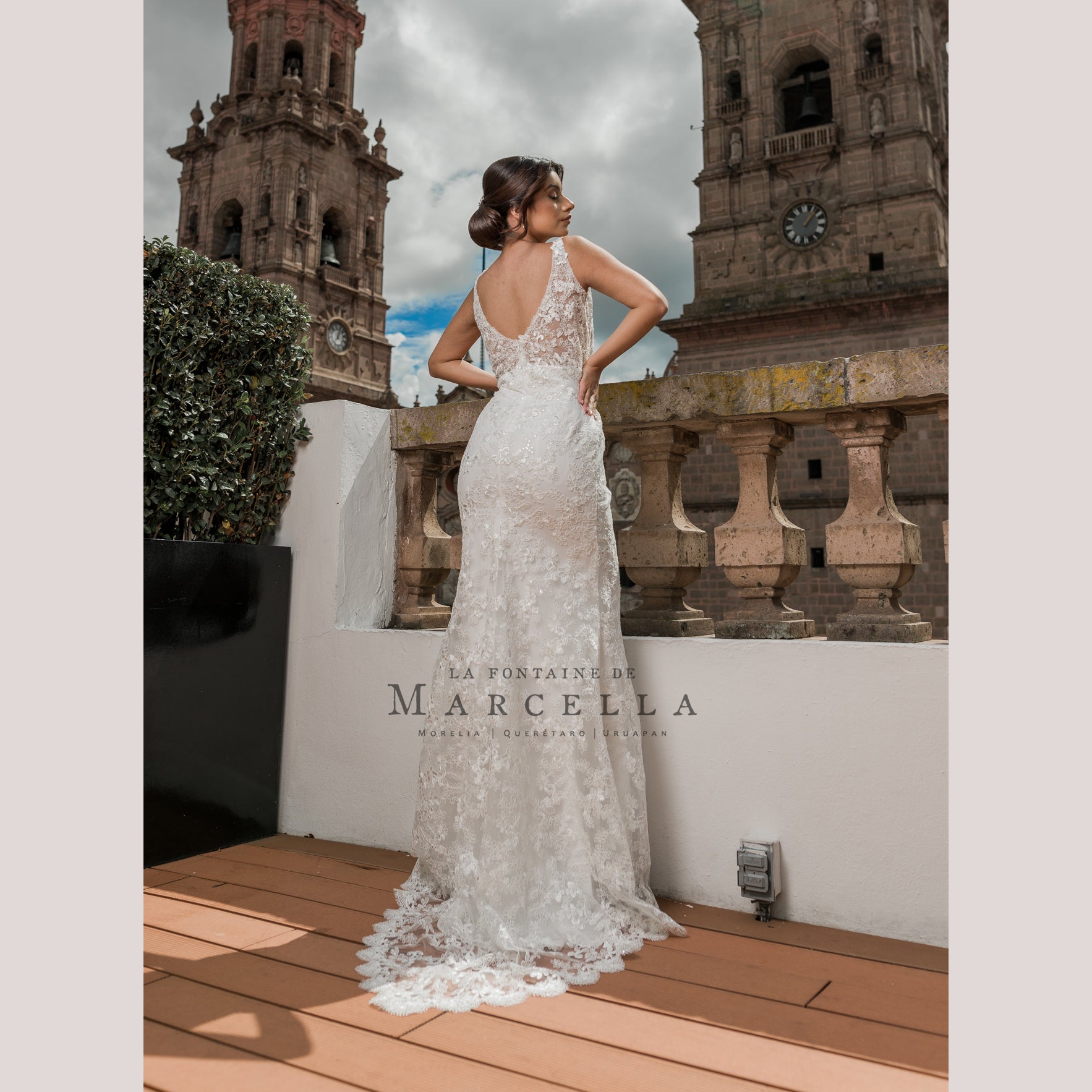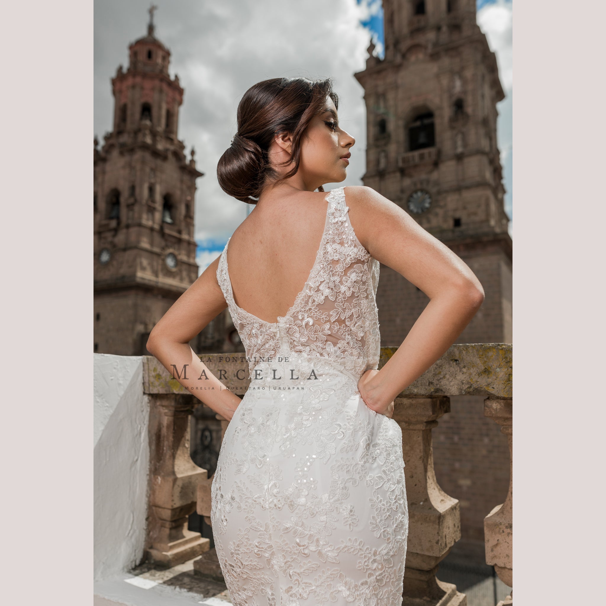 Vestido corte Sirena adornado completamente con aplicacion, recomendado para cuerpos tipo Reloj de Arena y Rectangulo.Read more
