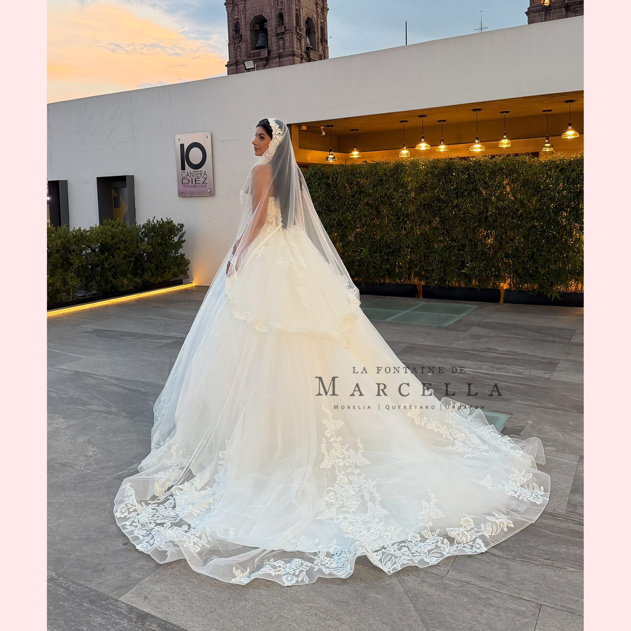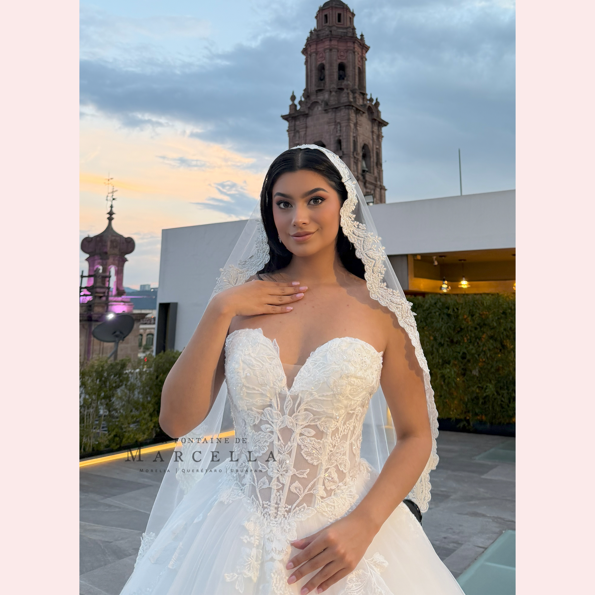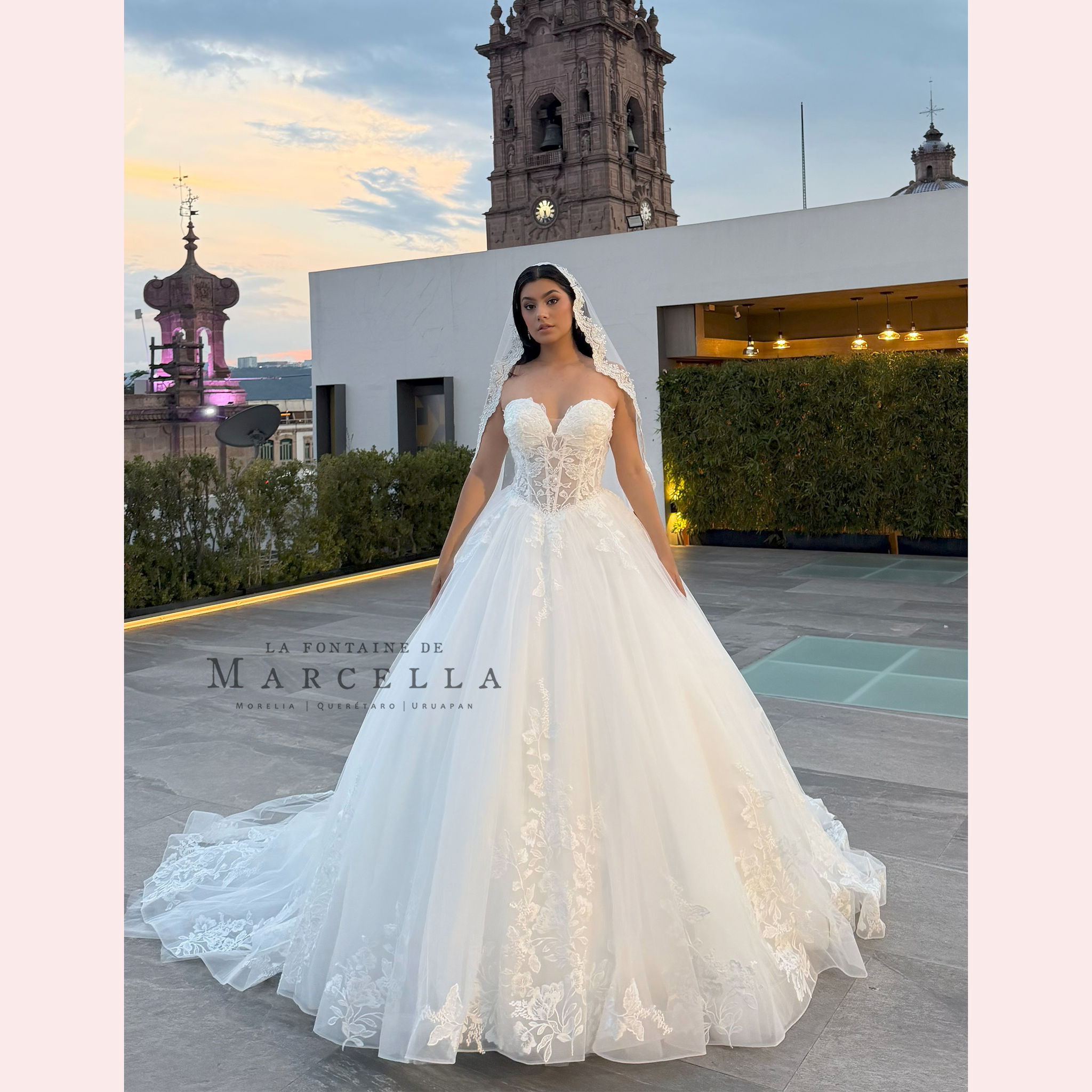 Vestido corte princesa con escote corazón y transparencia, es recomendado para cuerpos tipo Rectángulo y Triangulo Invertido.