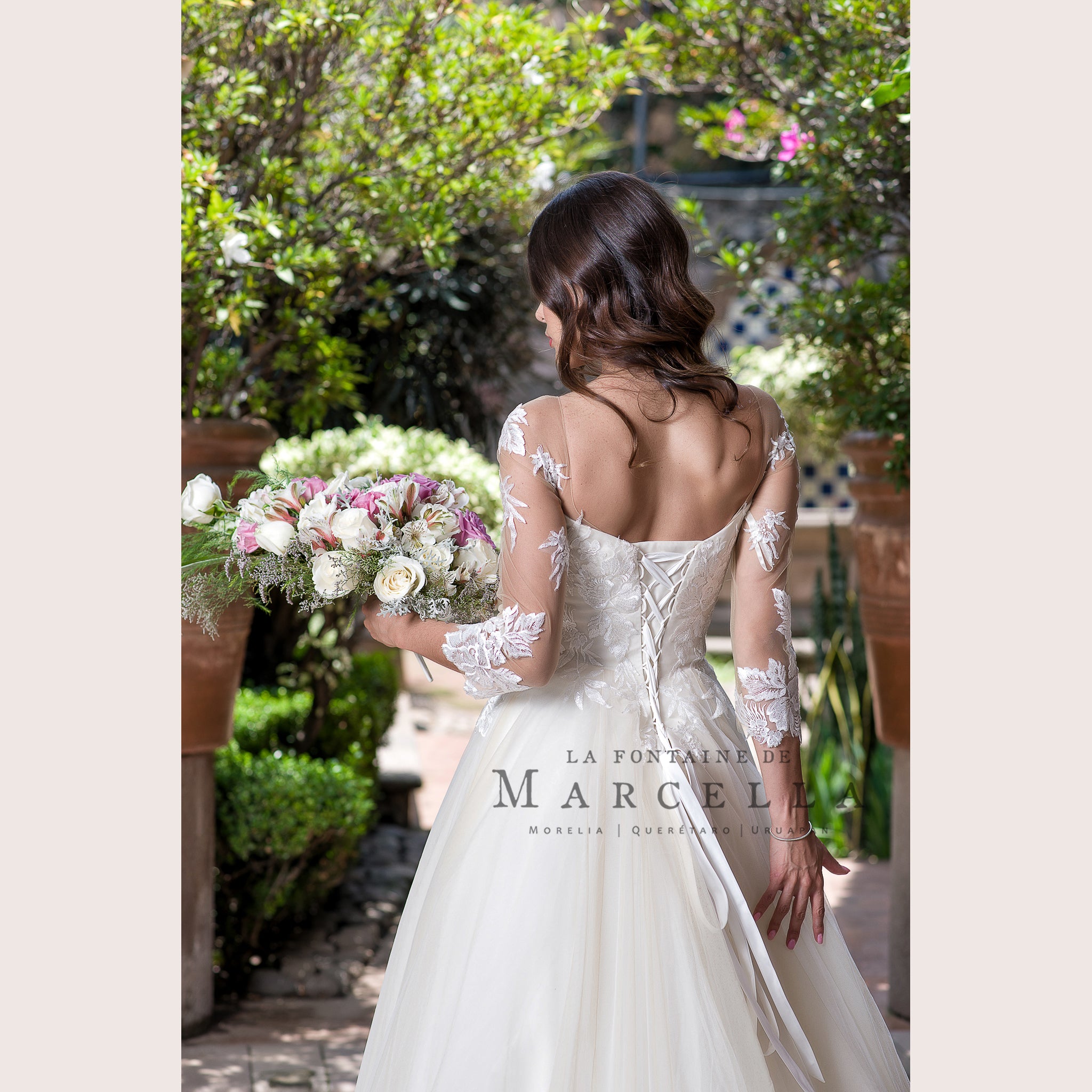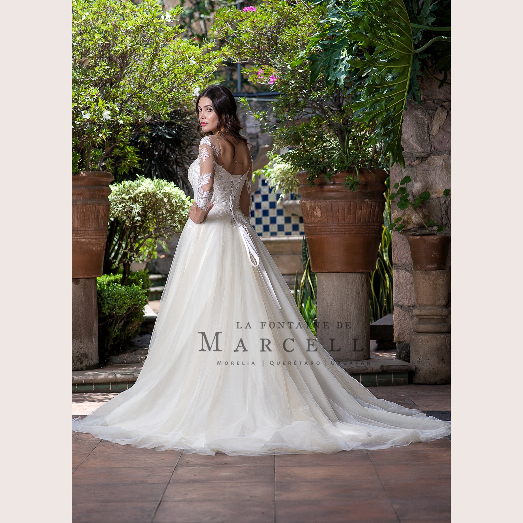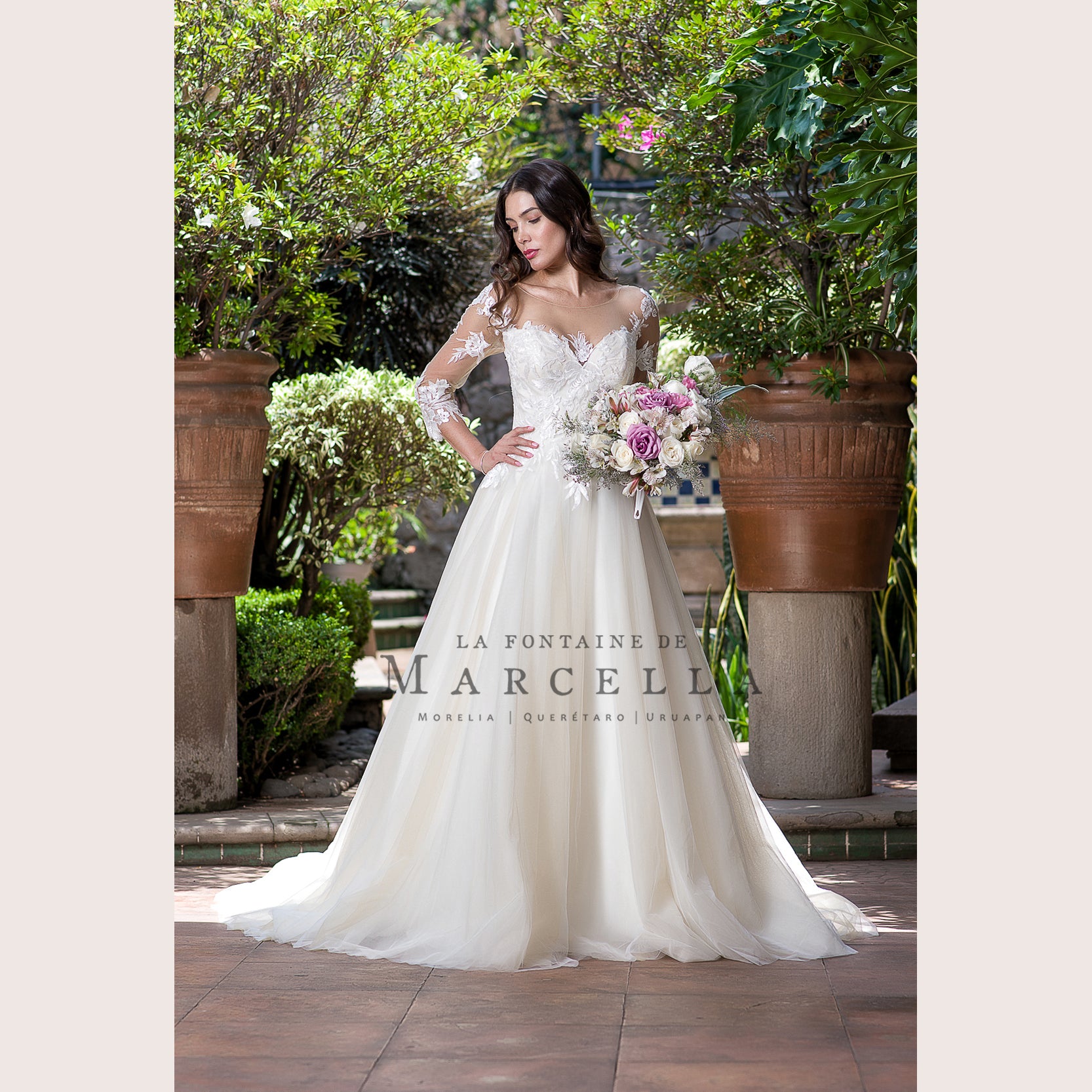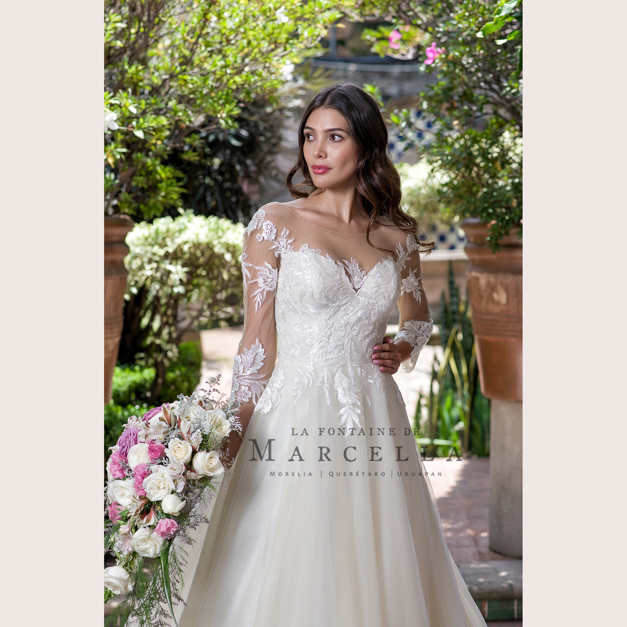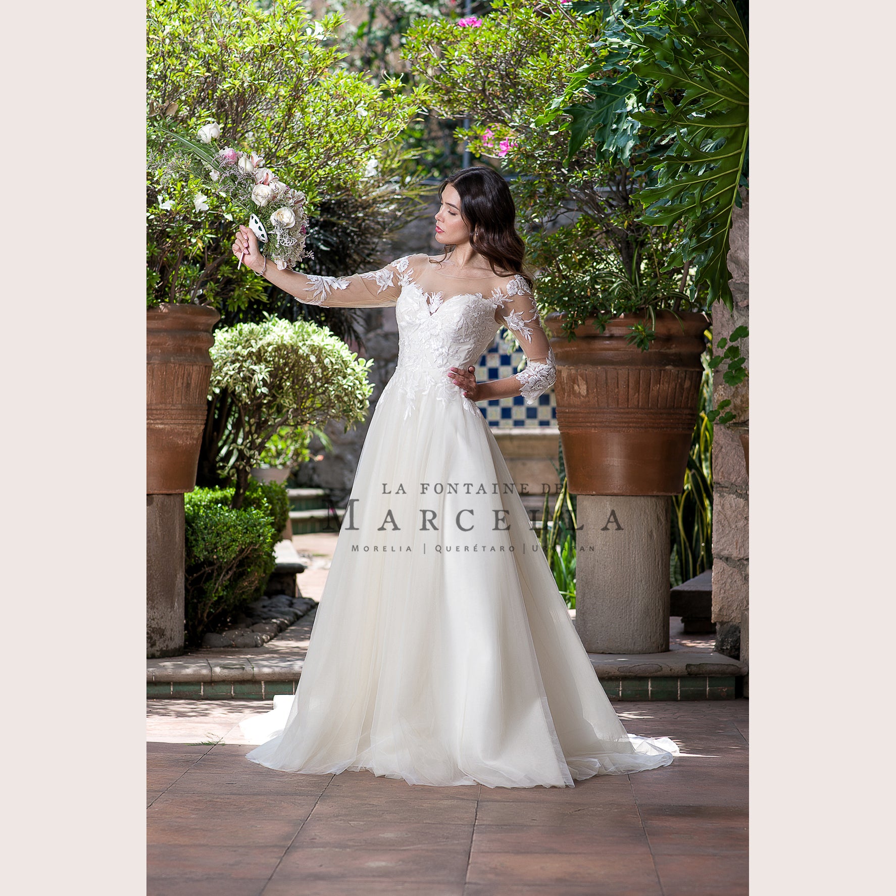 Vestido de novia con maga larga en transparencia y adornado con aplicación, de corte princesa y con corsé.Read more