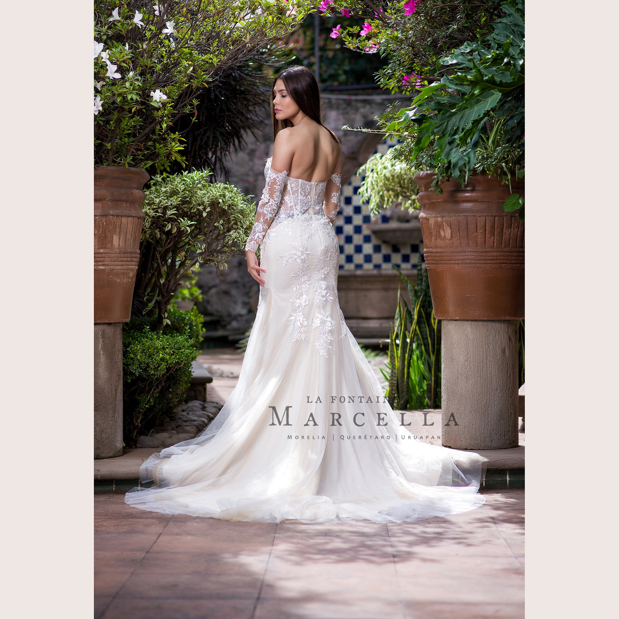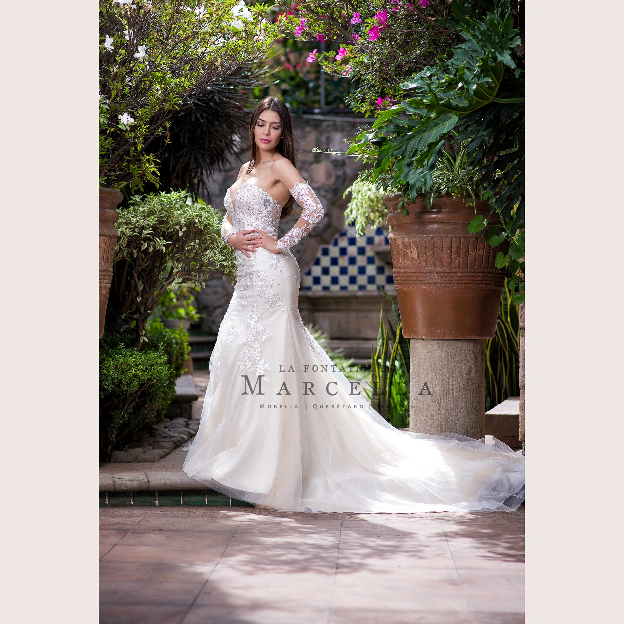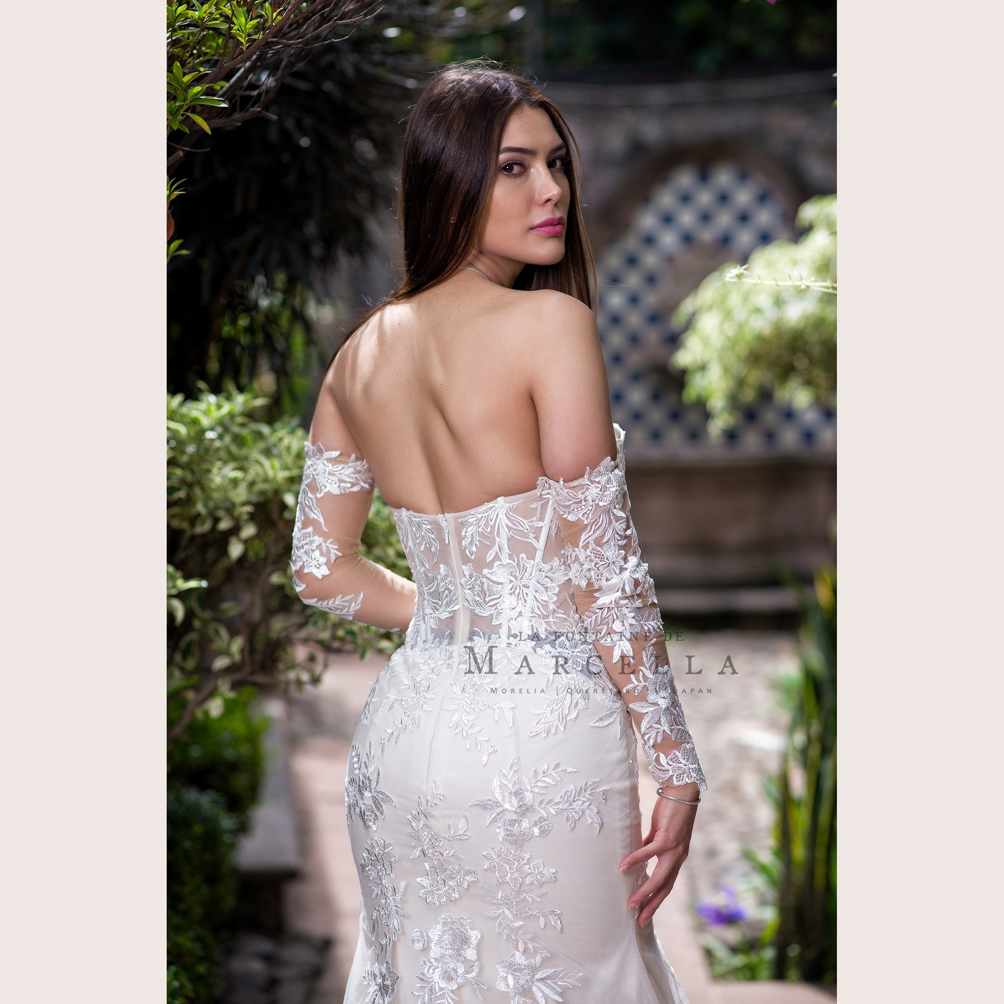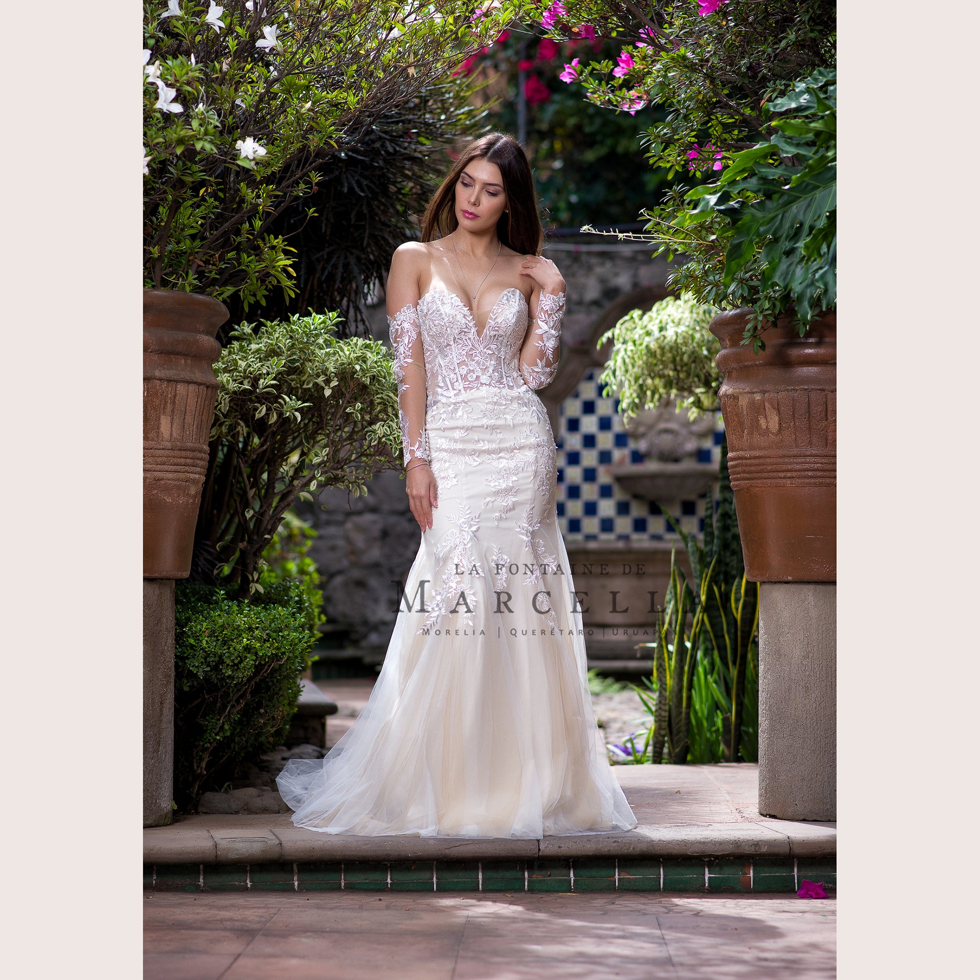 Vestido de novia de corte sirena con manga larga y cuello de ojal, recomendado para cuerpos tipo Reloj de Arena y Pera.Read more