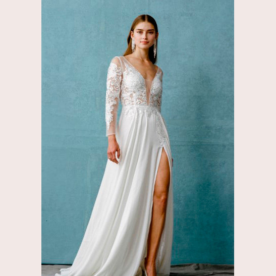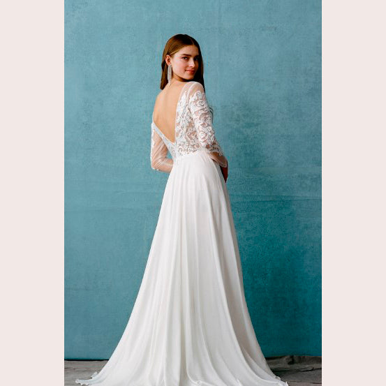 Vestido corte en A con escote en V y manga larga en transparencia, recomendado para cuerpos tipo Manzana y Rectángulo.