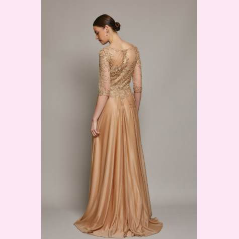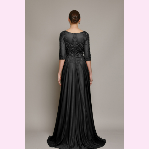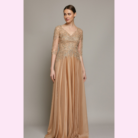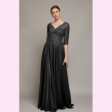 Vestido lardo corte en A con escote en V y manga a mitad del hombro, es recomendado para cuerpos tipo Rectángulo y Manzana.