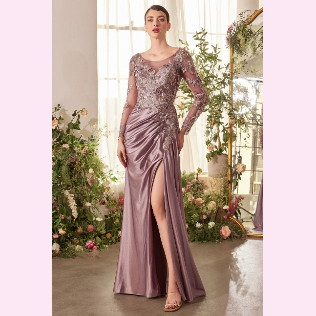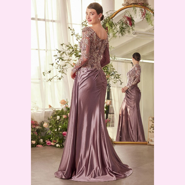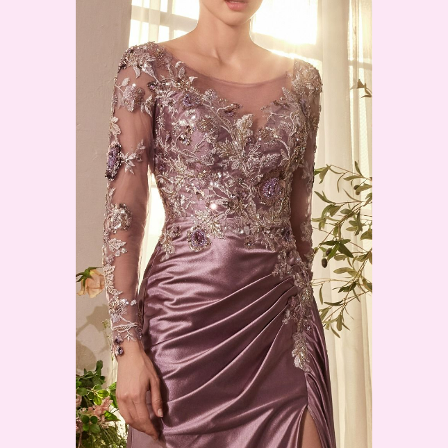 Vestido largo corte sirena con manga larga en transparencia, recomendado para cuerpos tipo Pera y Reloj de Arena.