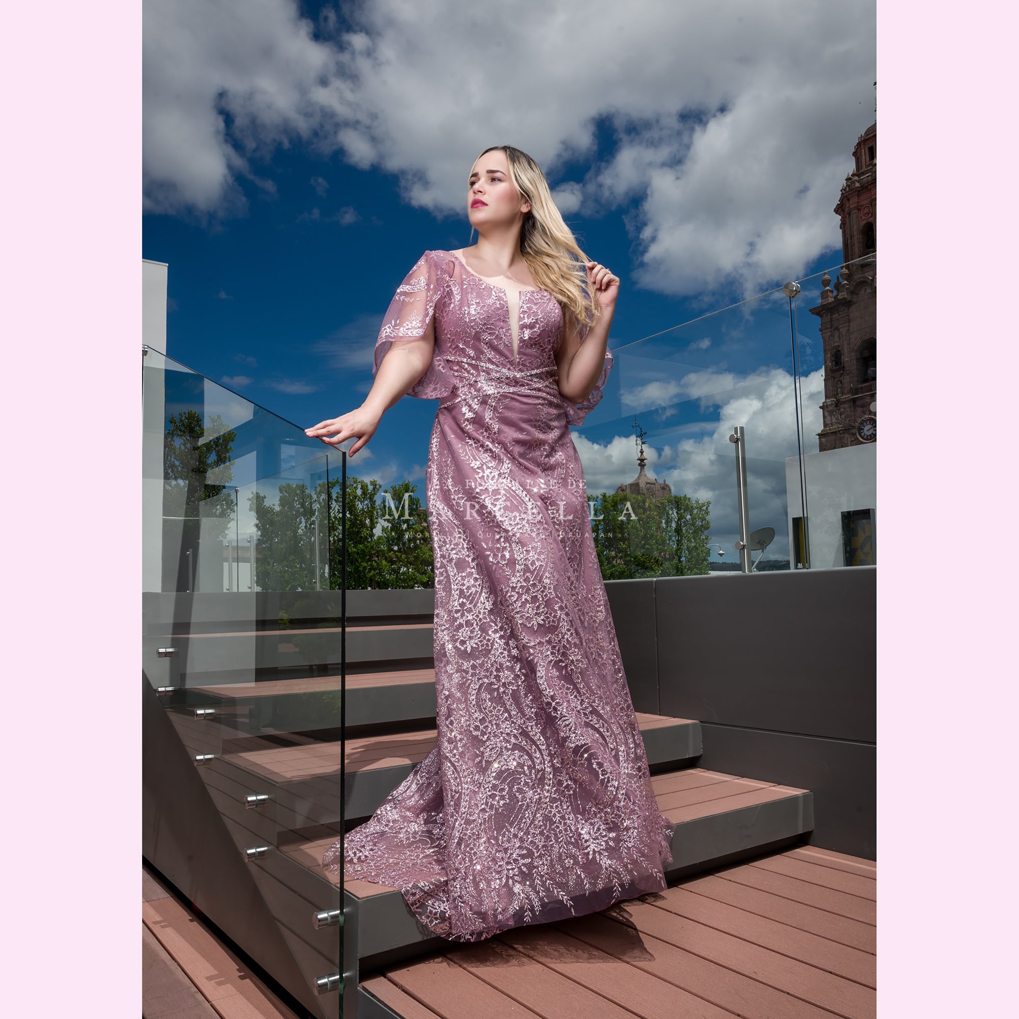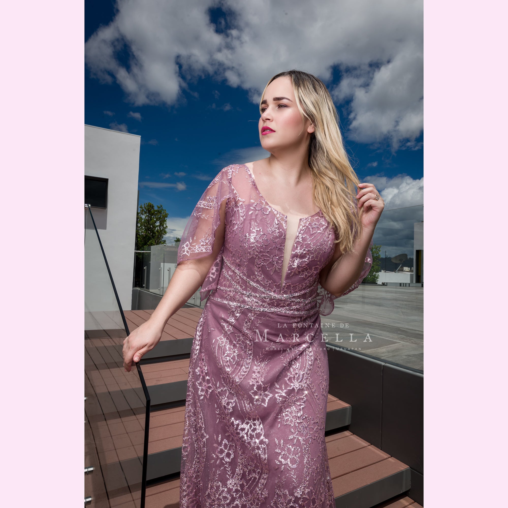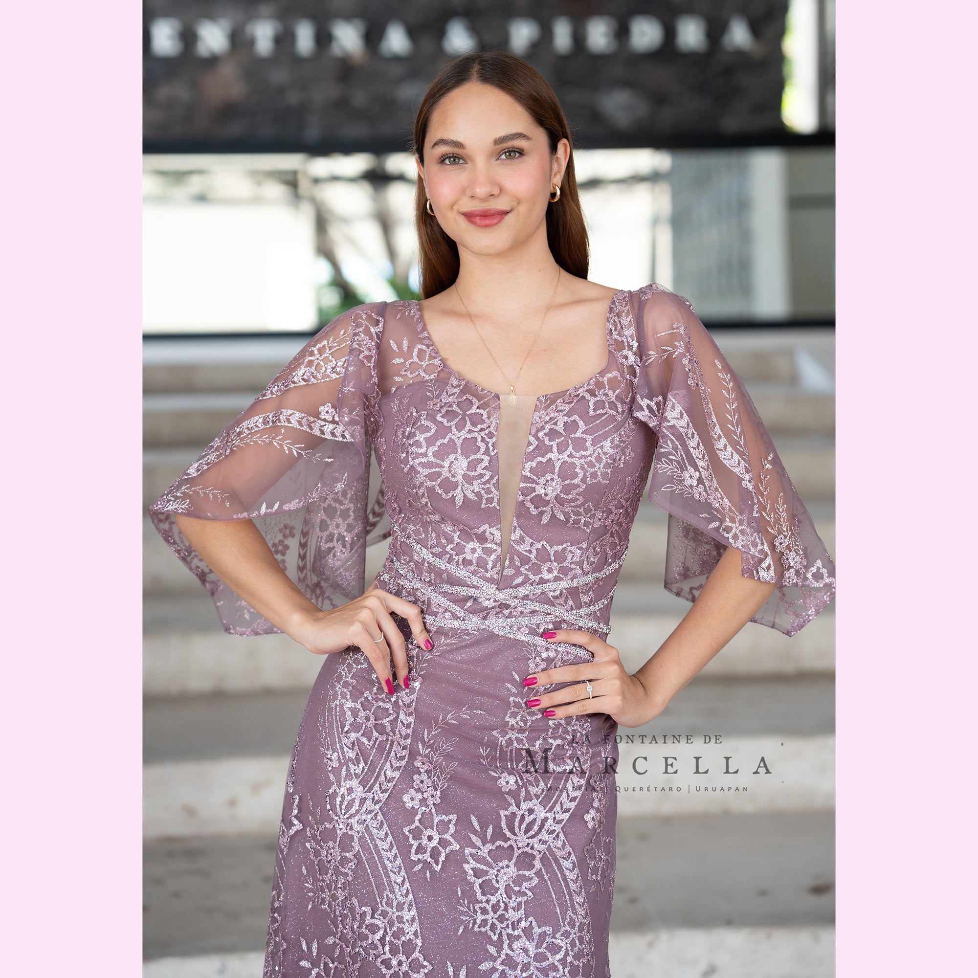 Vestido corte recto adornado con patrón brillante y manga de olan, es recomendado para cuerpos tipo Manzana y Rectángulo.