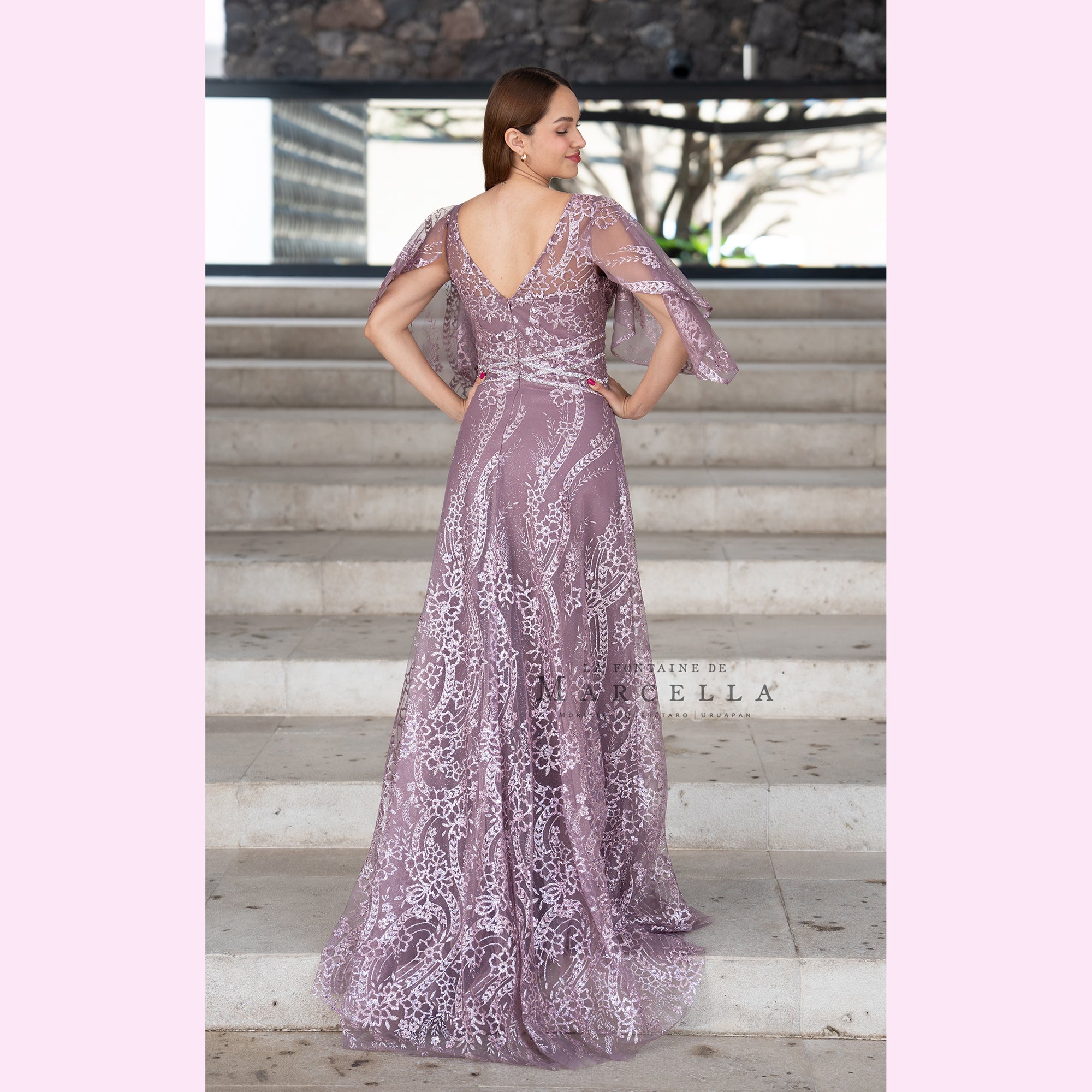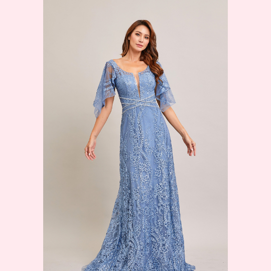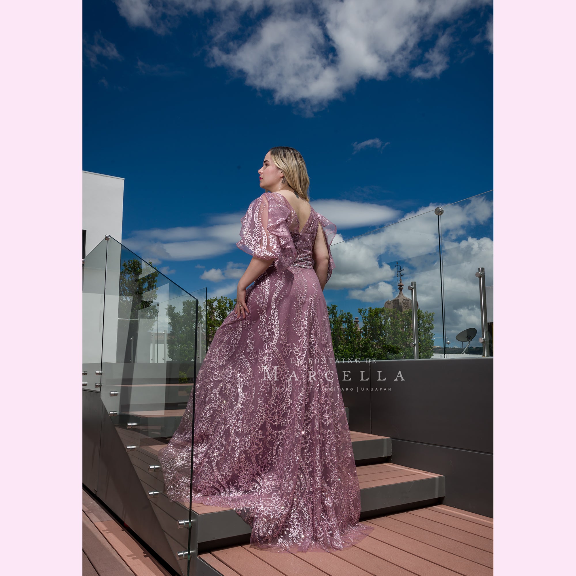 Vestido corte recto adornado con patrón brillante y manga de olan, es recomendado para cuerpos tipo Manzana y Rectángulo.