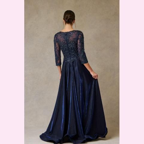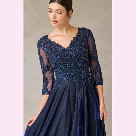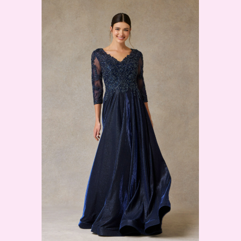 Vestido largo corte en A con manga larga y escote en V, es recomendado para cuerpos tipo Pera y Rectángulo.