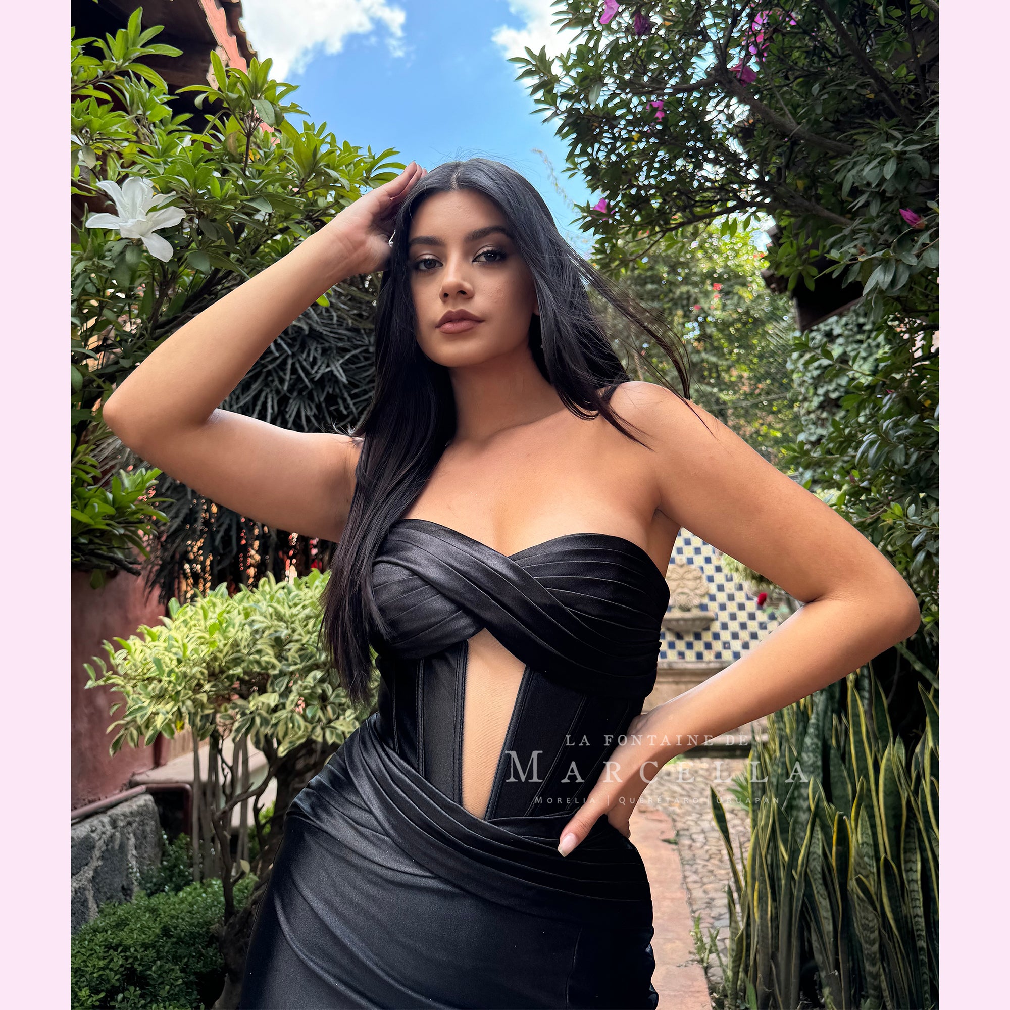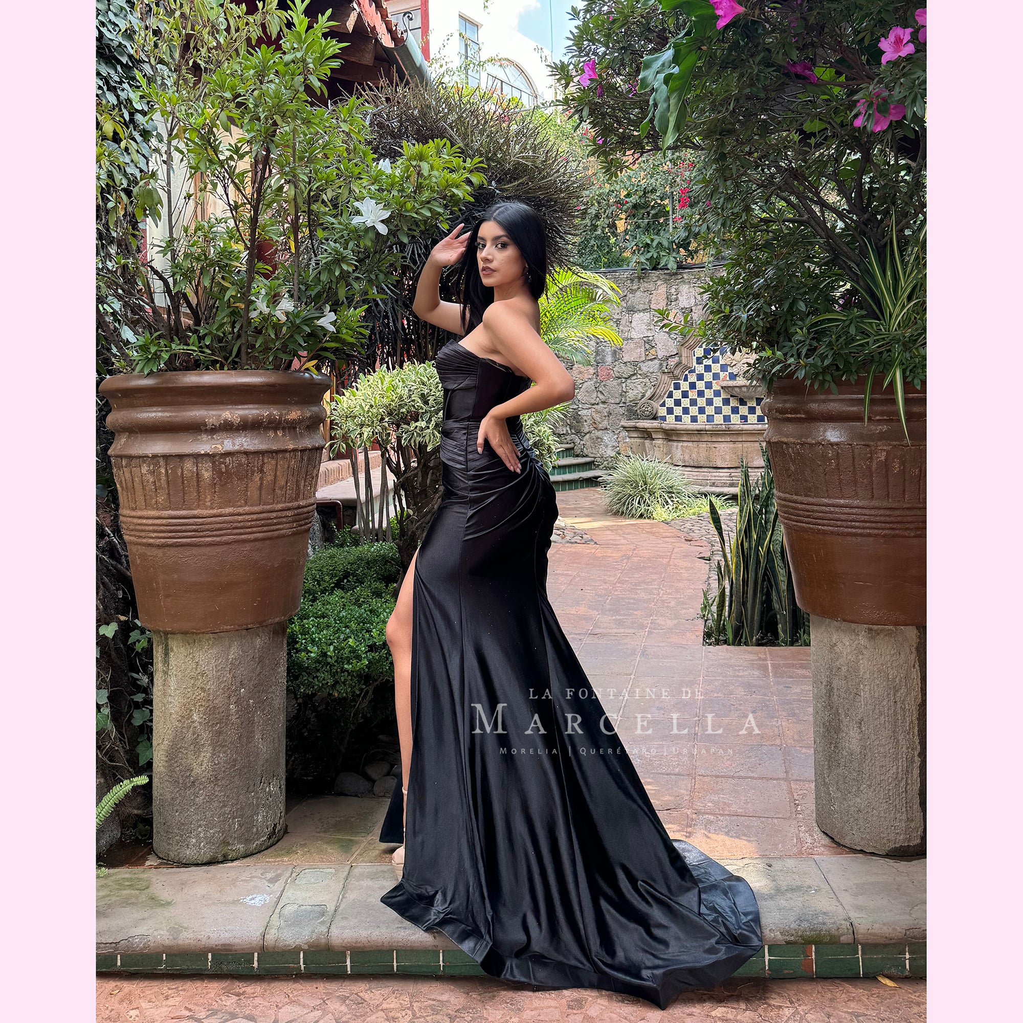 Vestido largo corte sirena con escote corazón y abertura en el torso, es recomendado para cuerpos tipo Reloj de Arena y Pera.