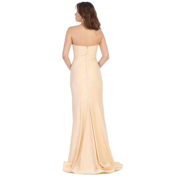 Vestido con corte sirena, strapless y con adorno de plisado en la parte delantera, recomendado para cuerpos tipo Reloj de Arena y Triangulo Invertido.