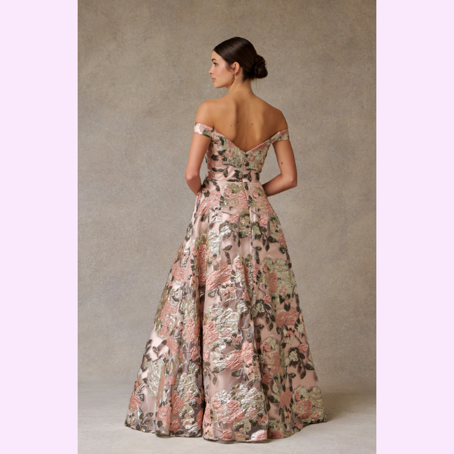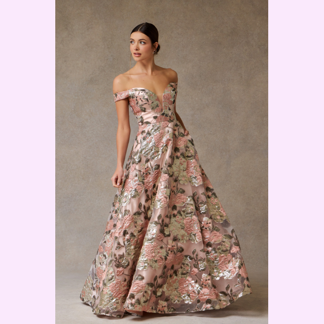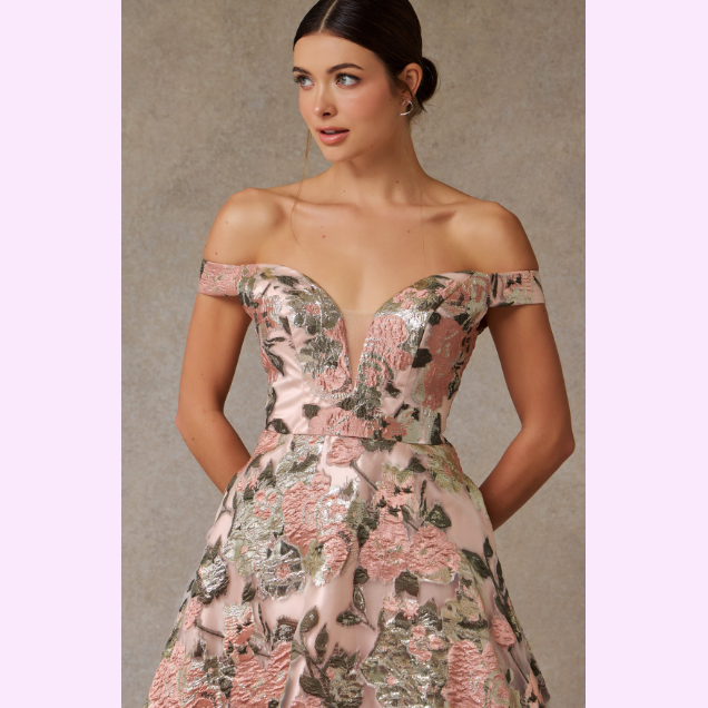 Vestido corte en A con manga de ojal y escote Corazón, con estampado floral con liero relieve, es recomendado para cuerpos tipo Rectángulo y Triangulo Invertido.