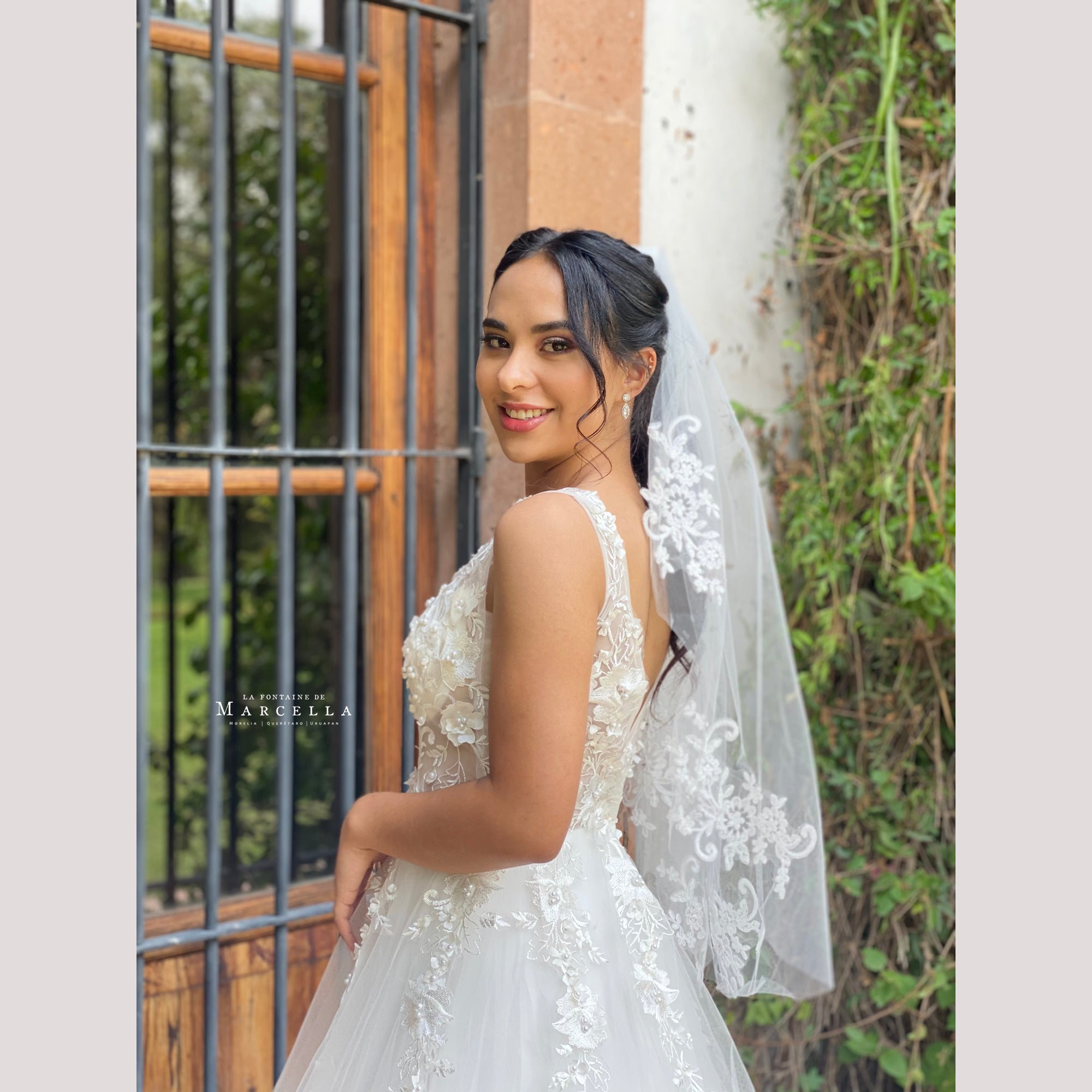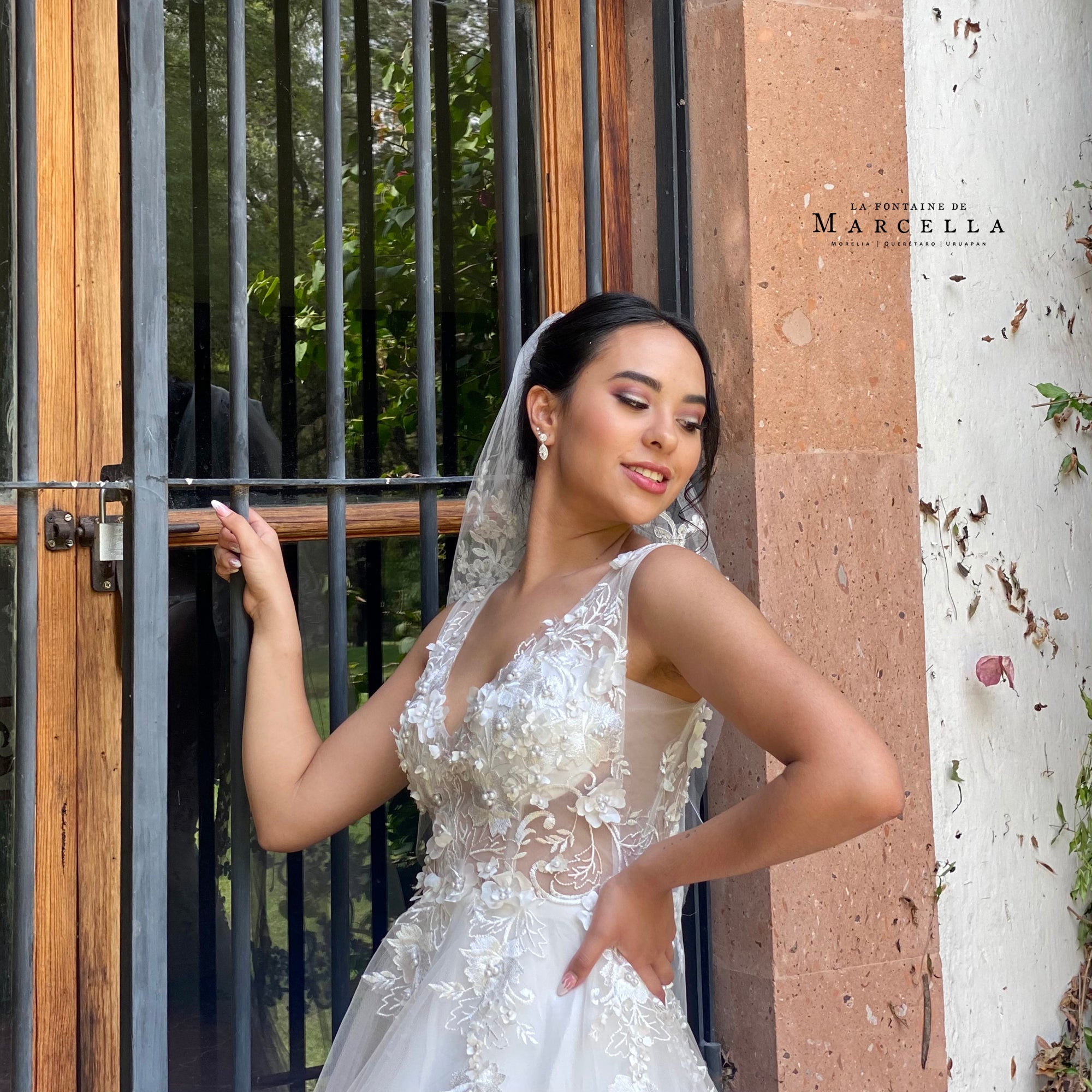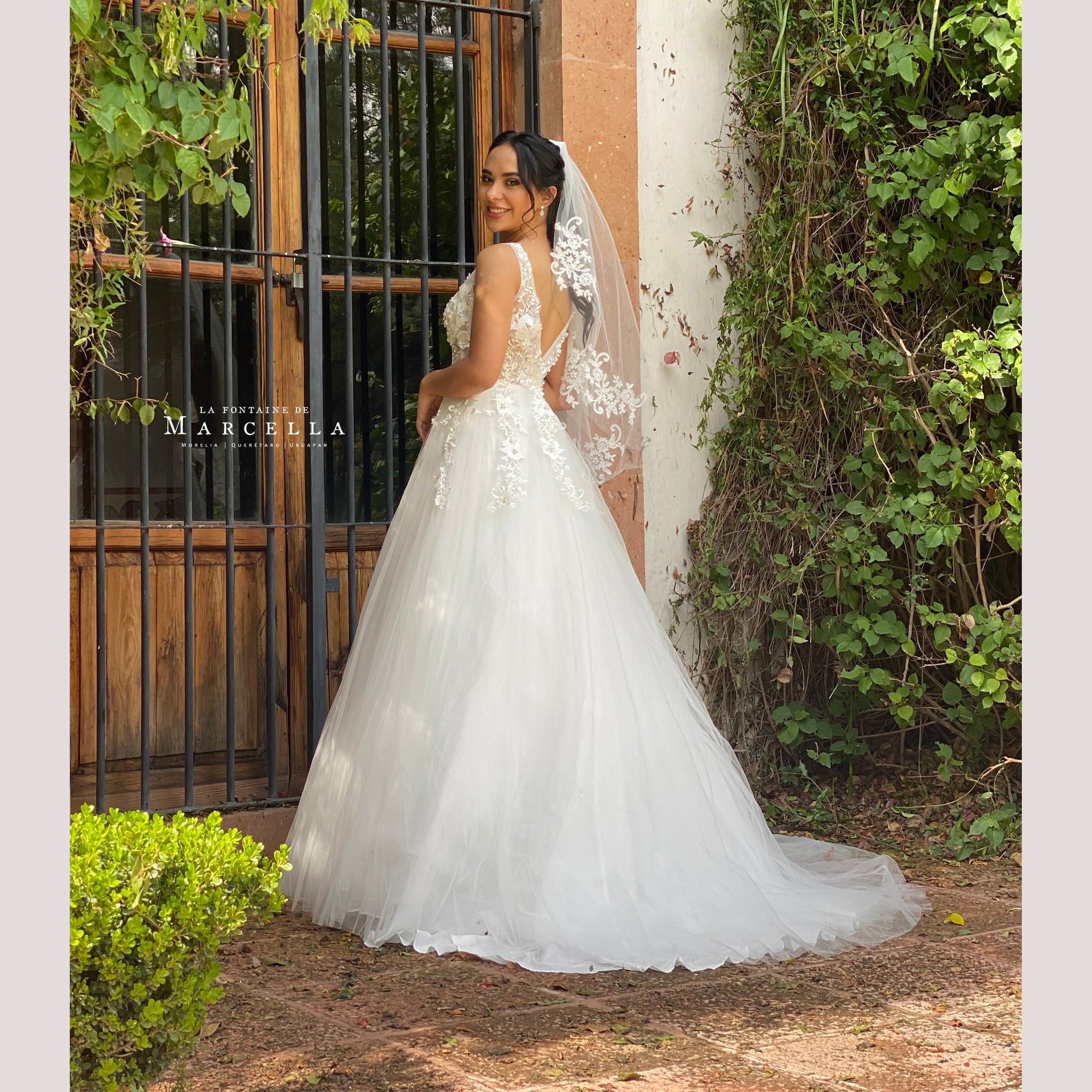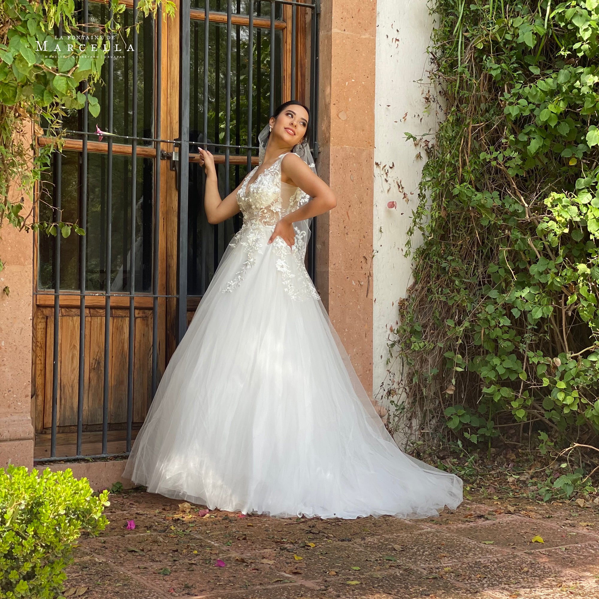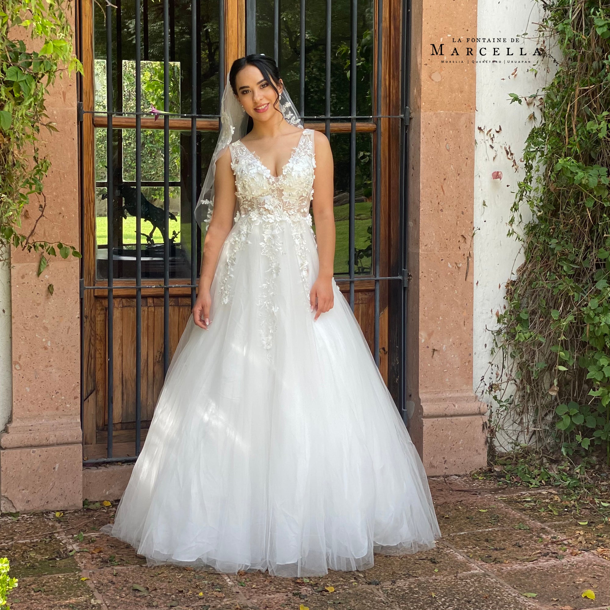 Vestido con capas de tul, la ultima adornada con hermosa aplicación, con escote en V y transparencia en la parte superior. Recomendado para cuerpos tipo Rectangulo y Reloj de Arena. No incuye Velo*Read more