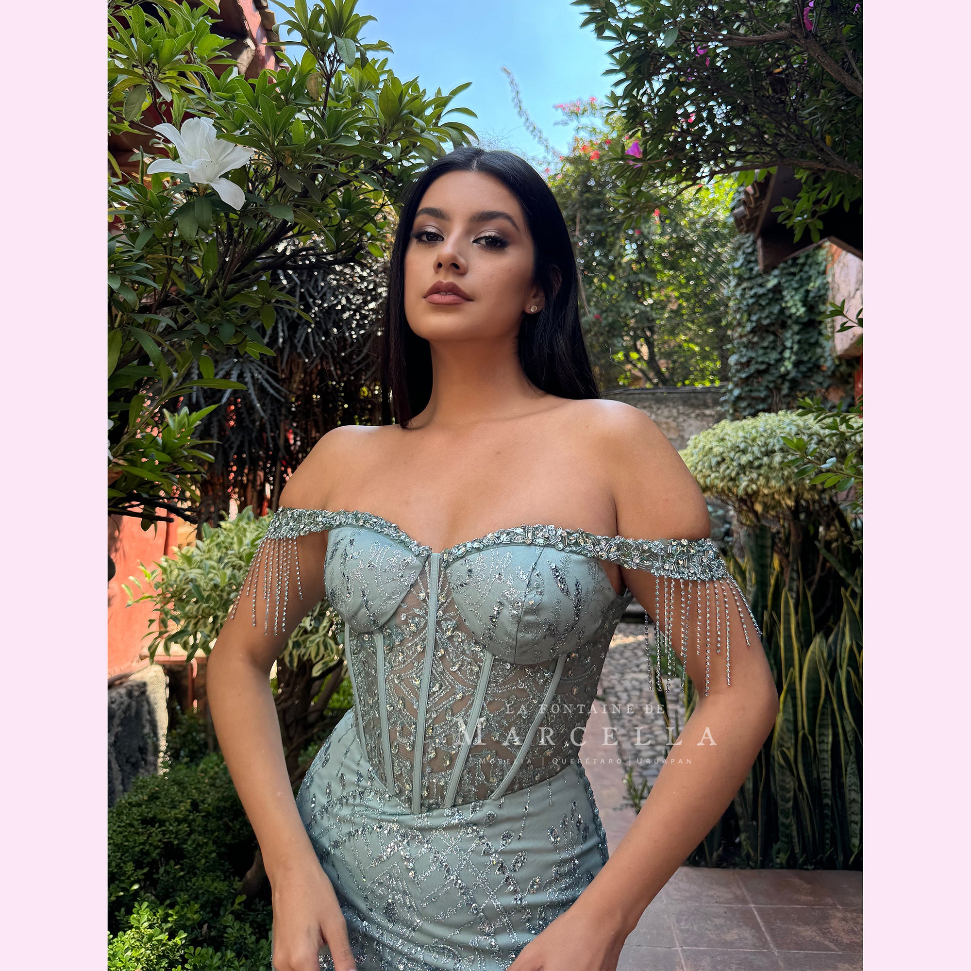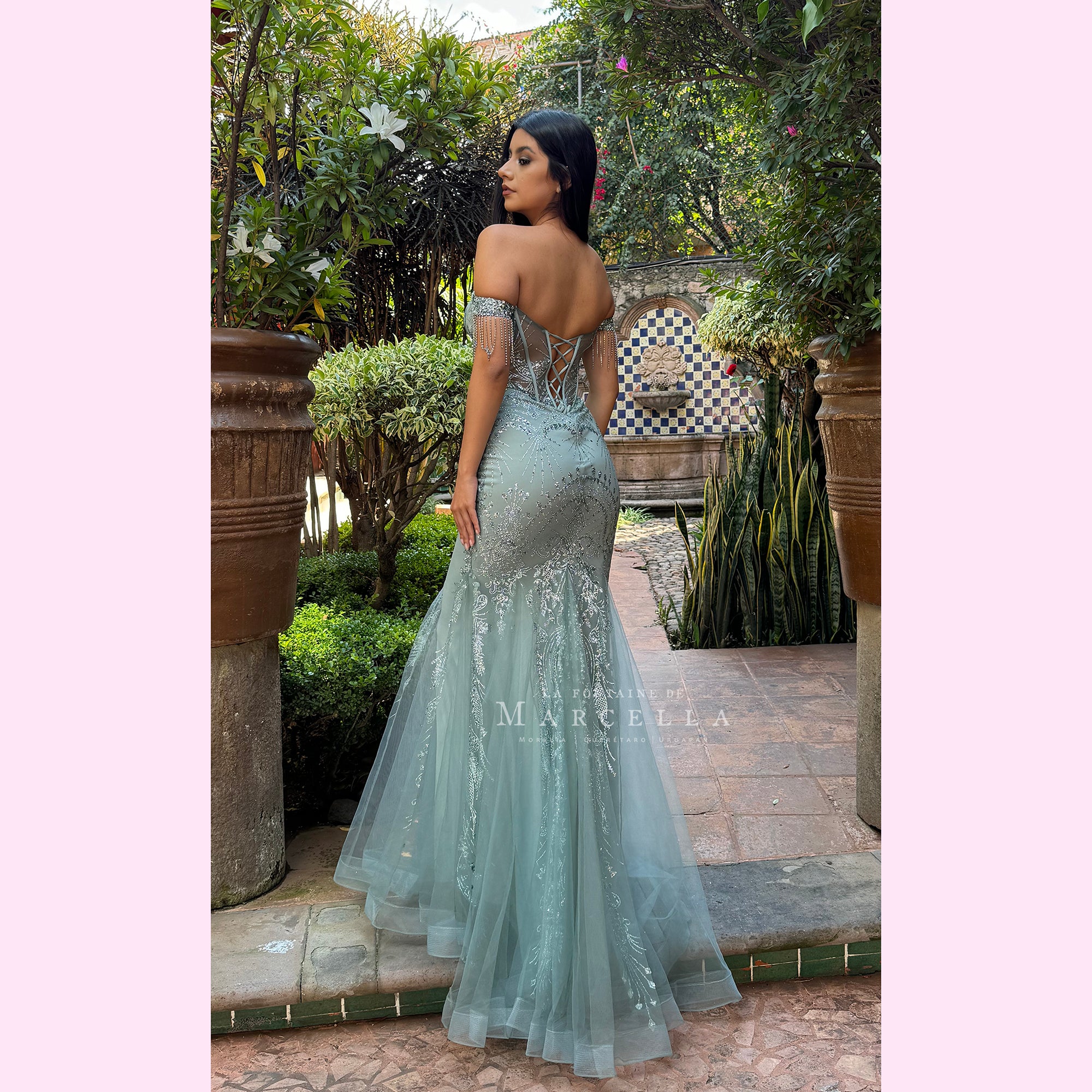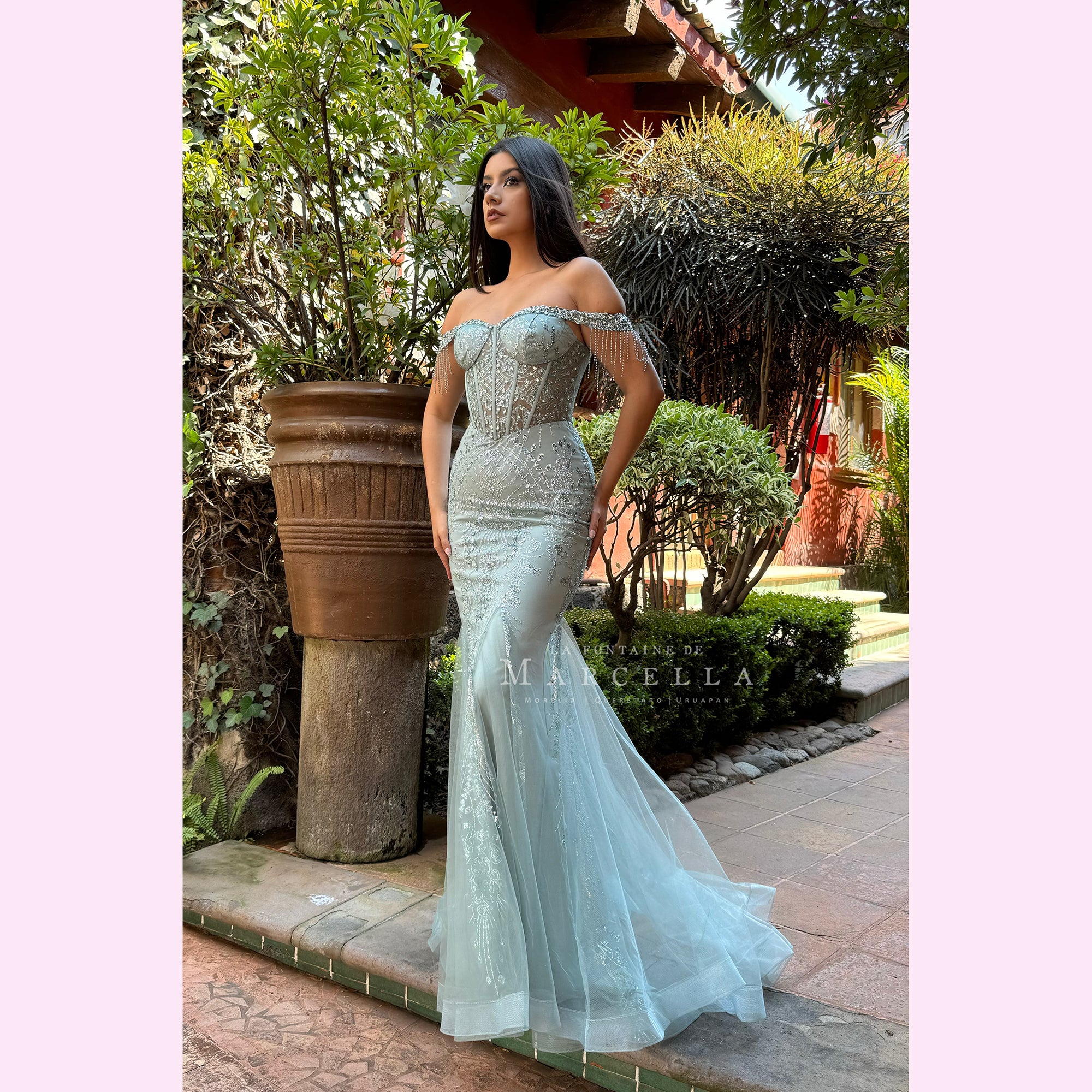 Vestido corte sirena con manga de ojal y adonado con pedrería de fantasía y patrón brillante es recomendado para cuerpos tipo Reloj de Arena y Pera.Read more