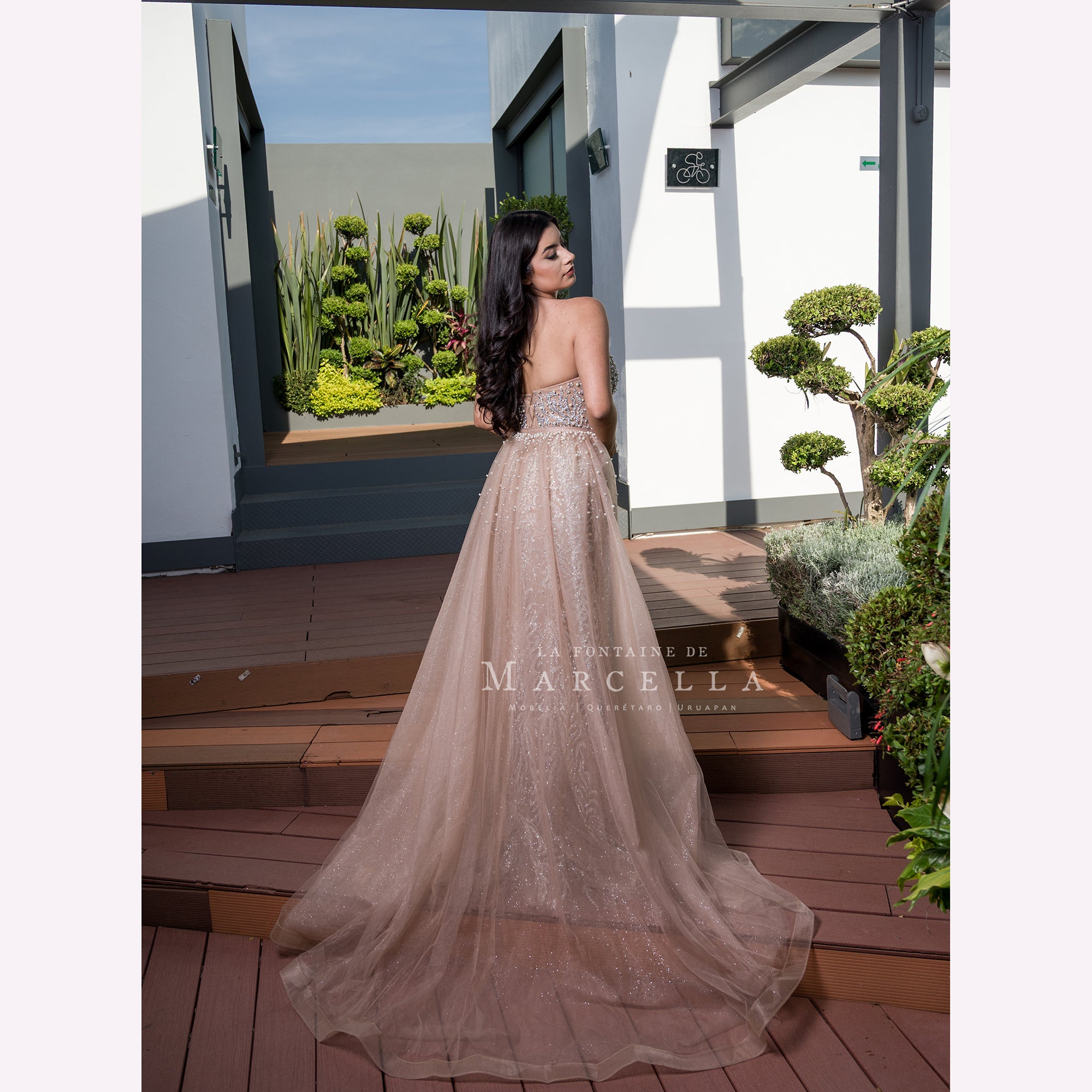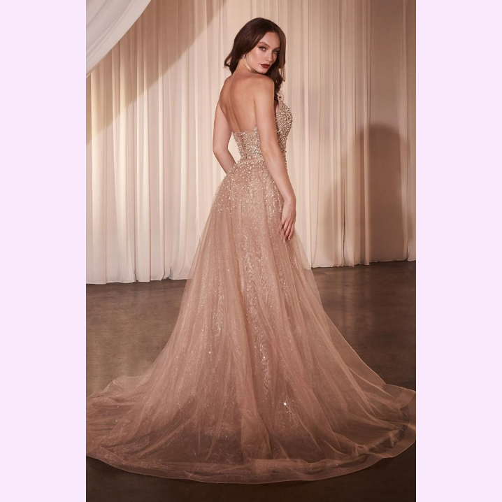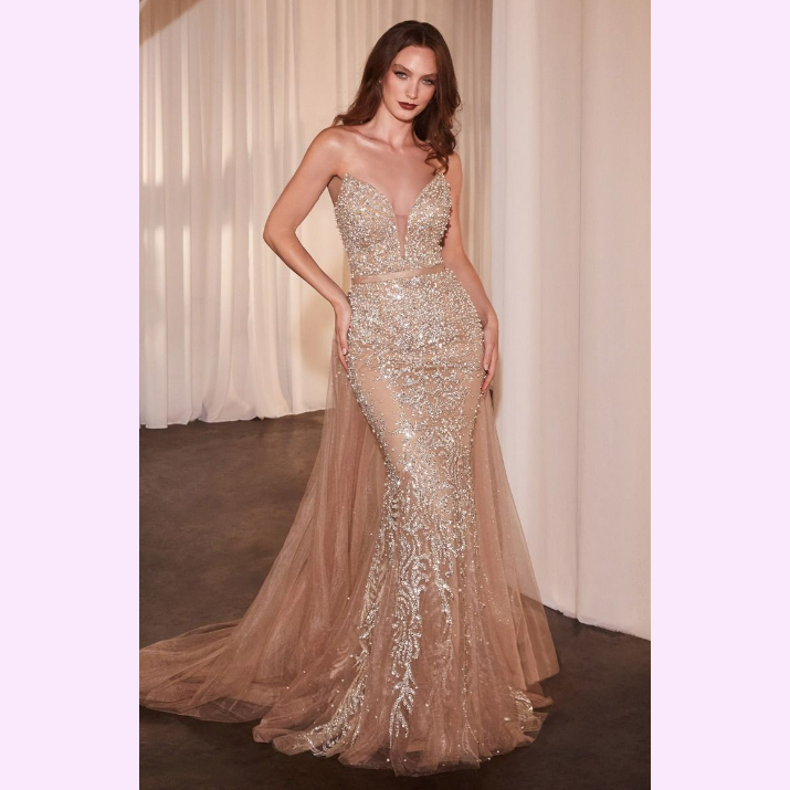 Vestido largo corte sirena con escote en V, adornado hermosamente con un patrón en pedrería de fantasía y una cauda de tul desmontable es recomendado para cuerpos tipo Reloj de Arena, Triangulo Invertido y Pera.