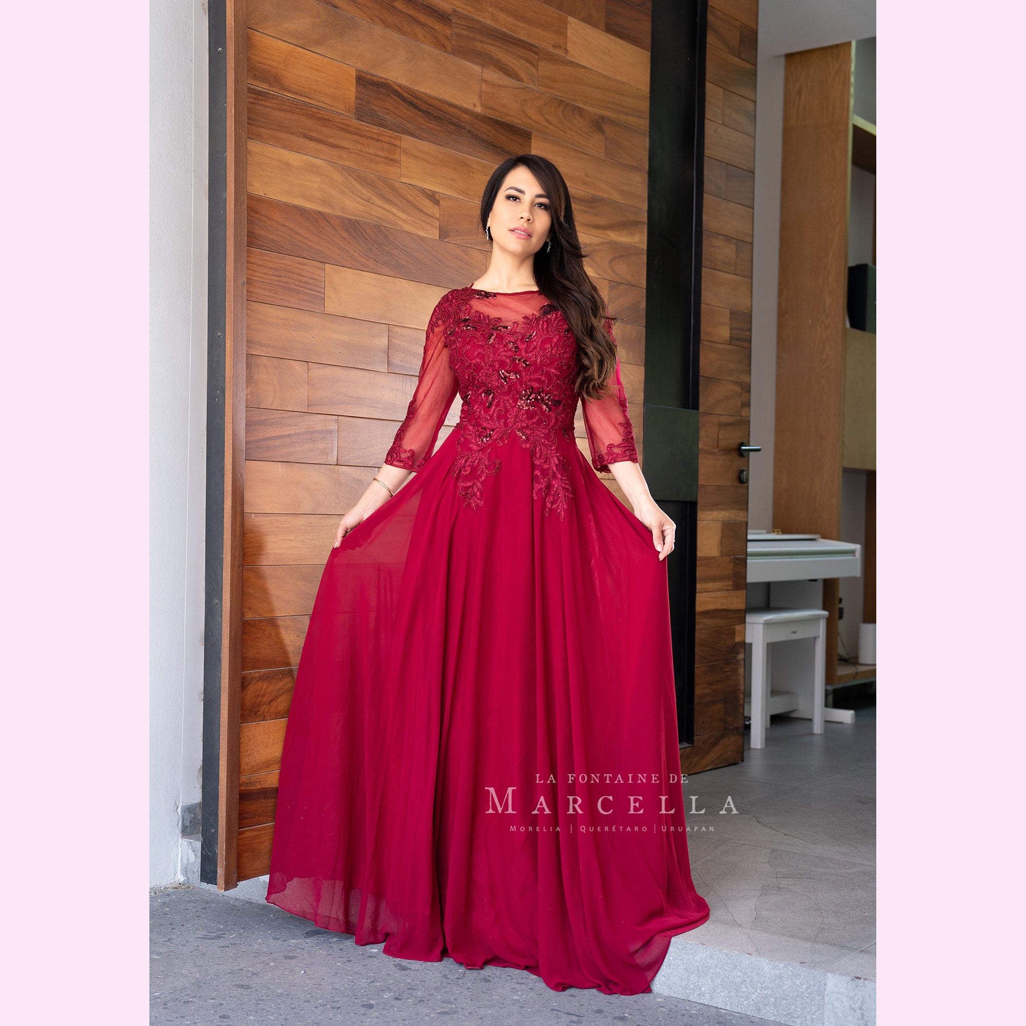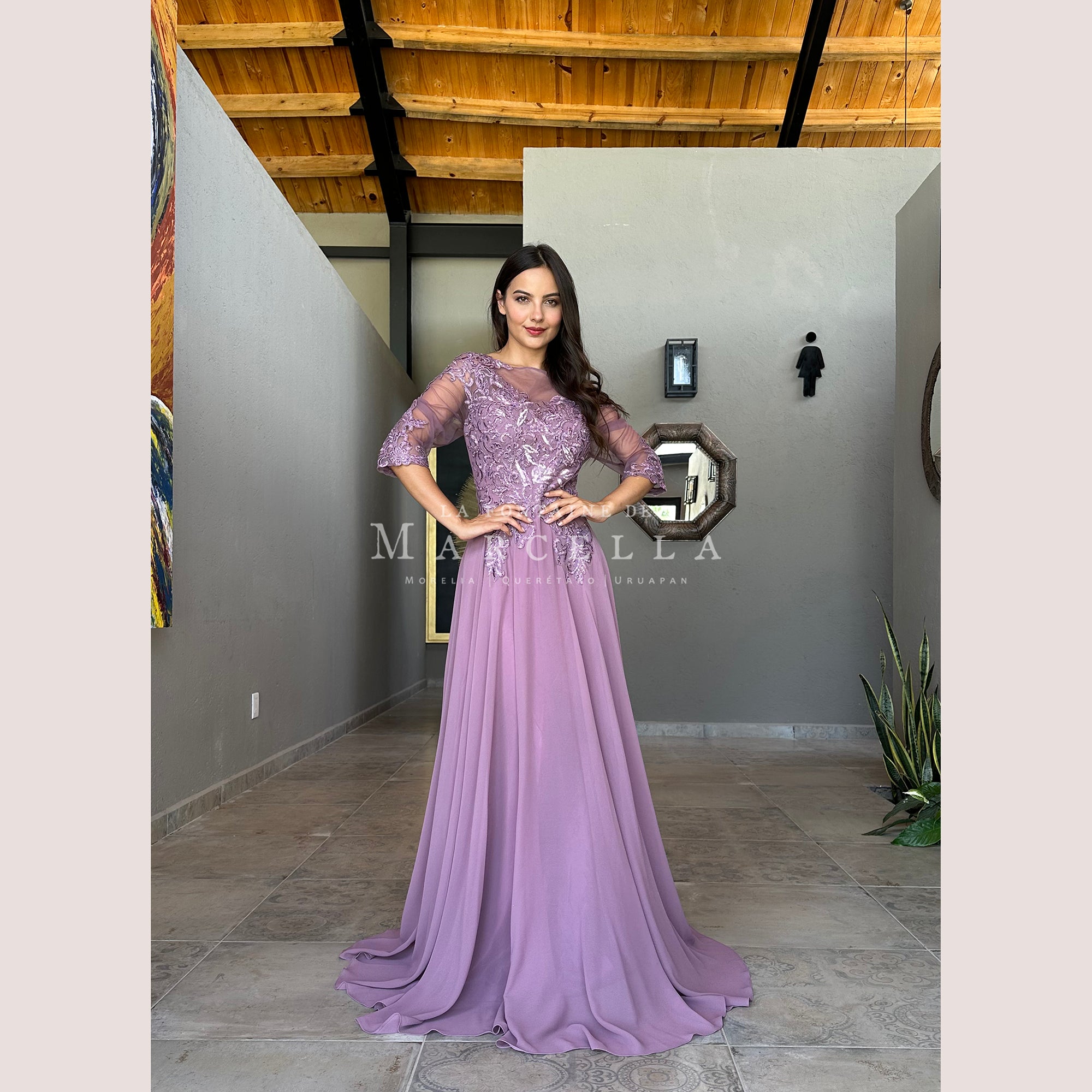 Vestido corte A con manga larga en transparencia y adornada con aplicación, recomendado para cuerpos tipo Rectángulo y Manzana.Leer más