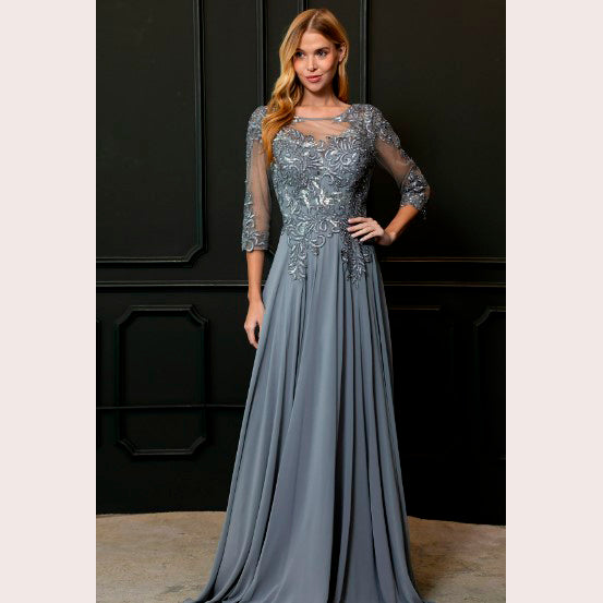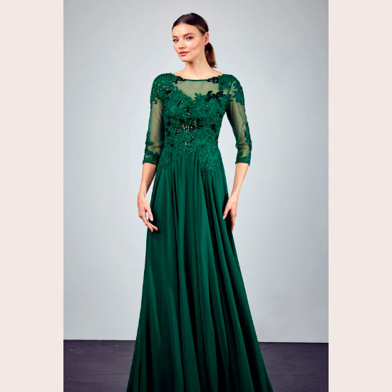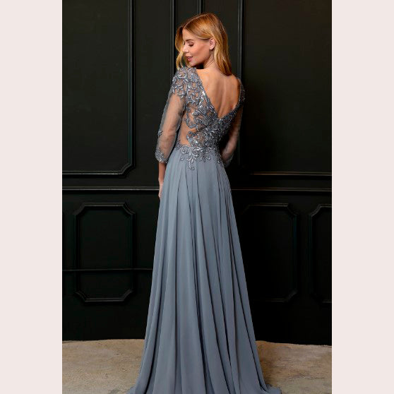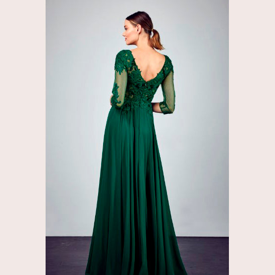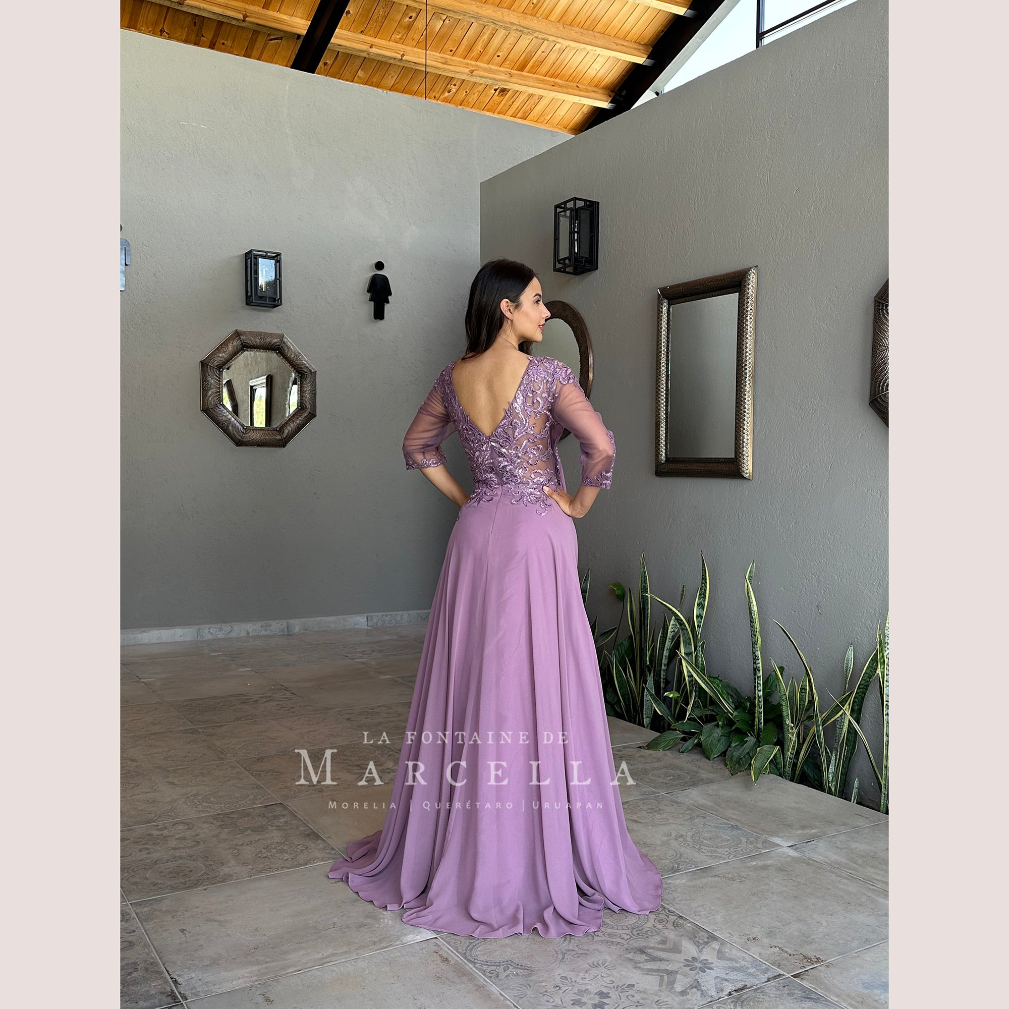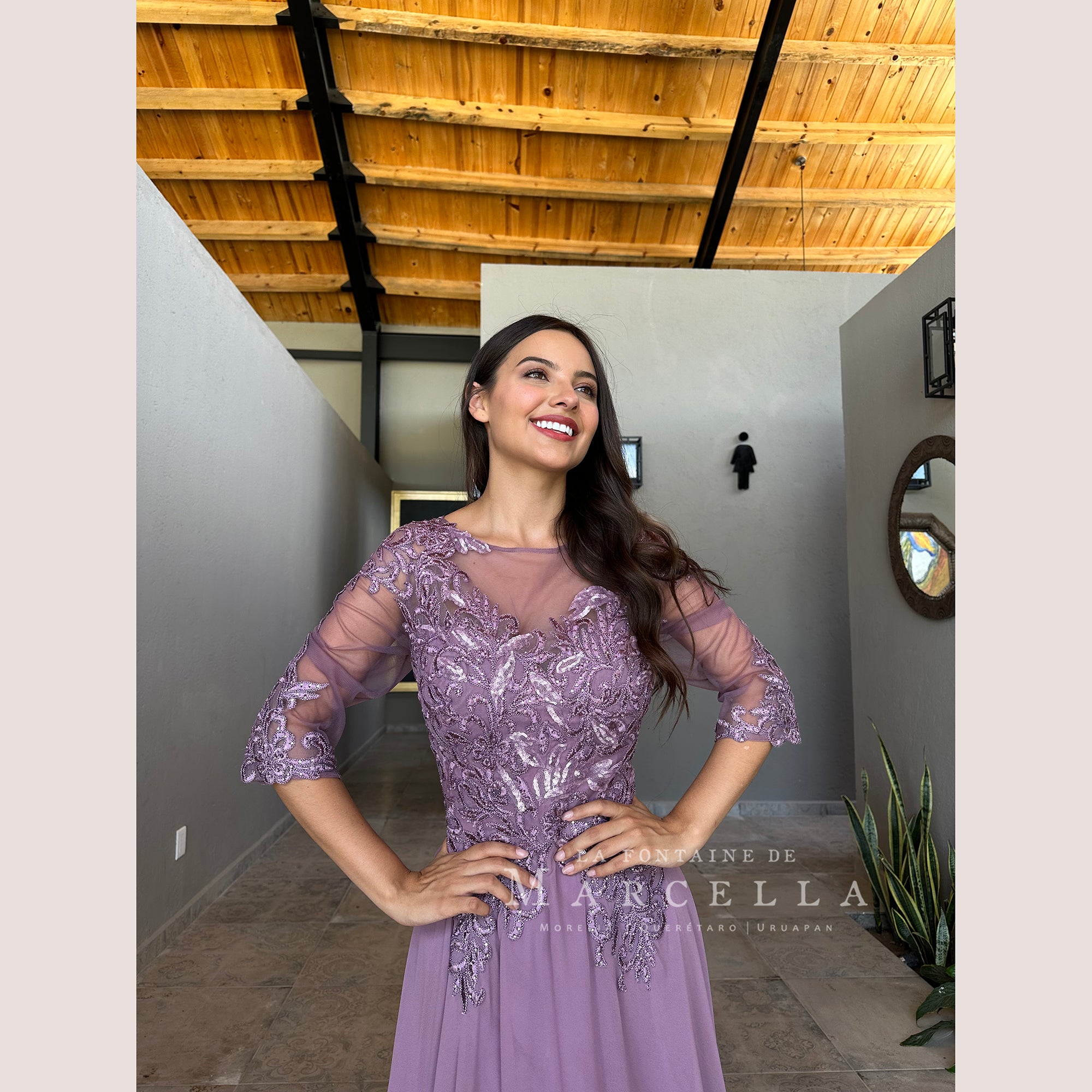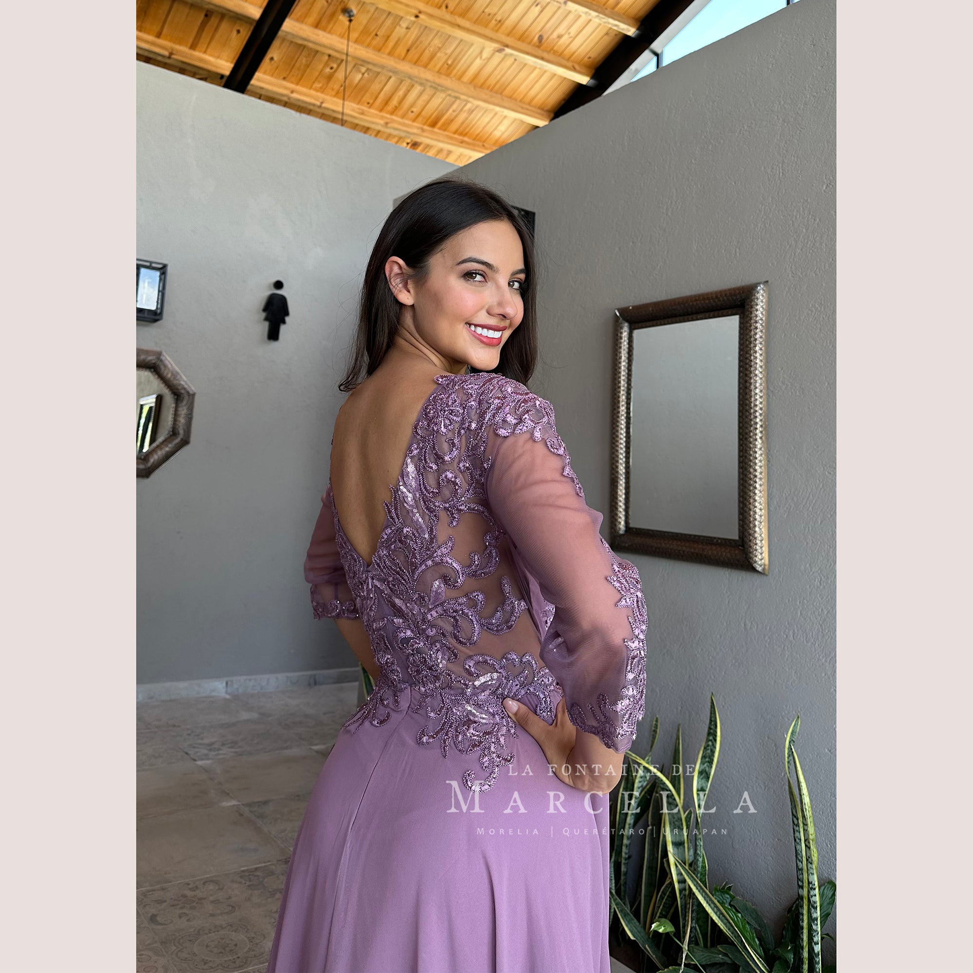 Vestido corte A con manga larga en transparencia y adornada con aplicación, recomendado para cuerpos tipo Rectángulo y Manzana.