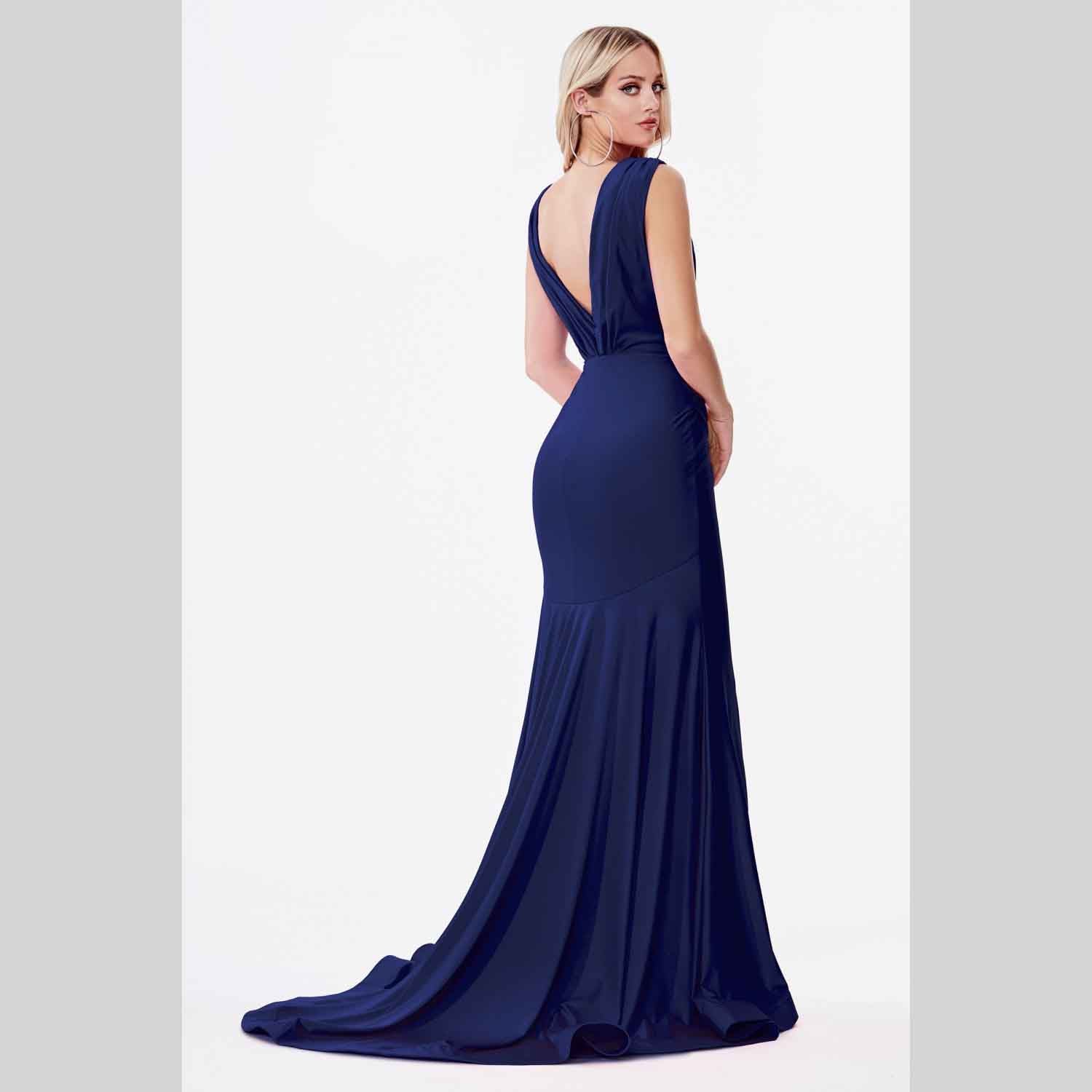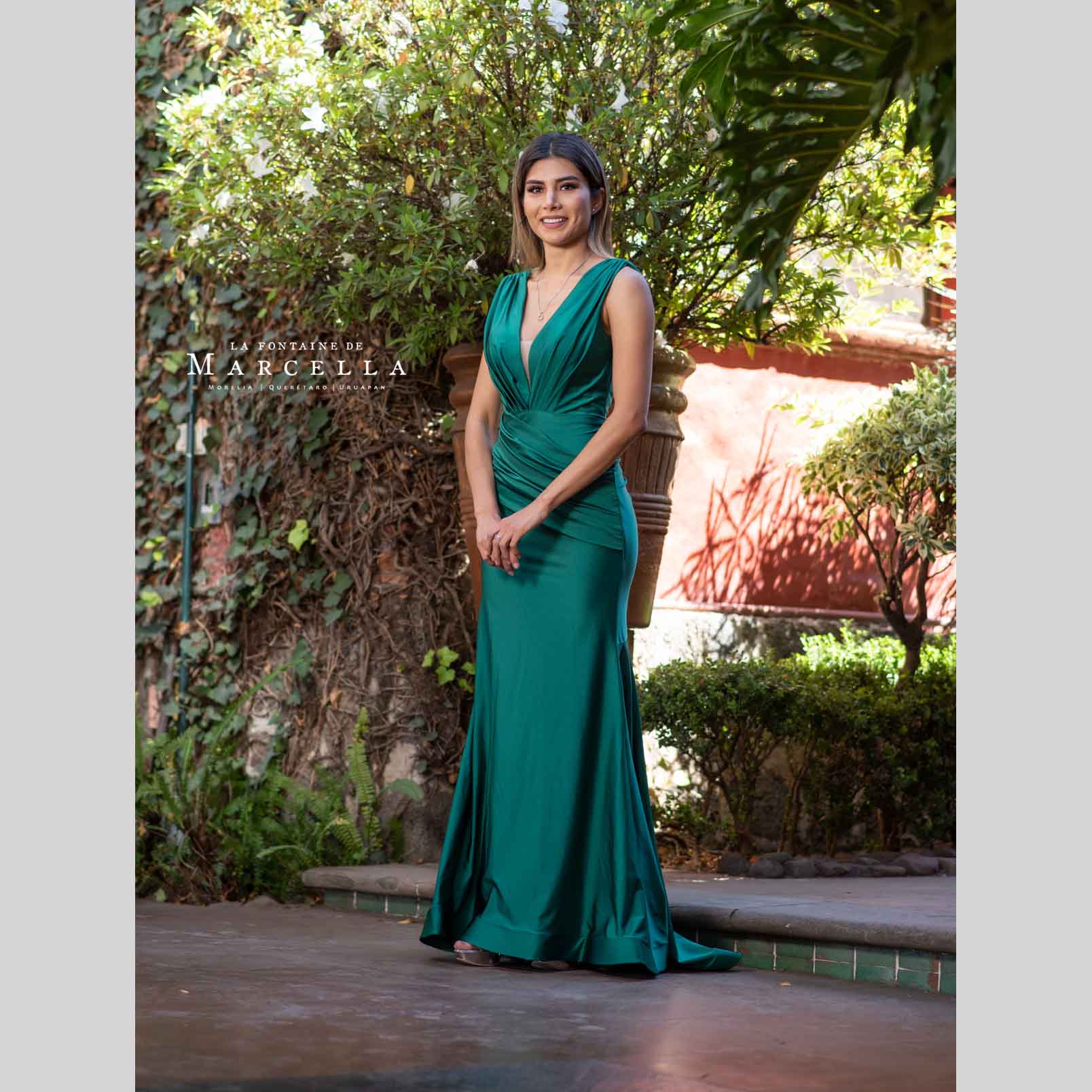 Vestido largo corte sirena con adorno de pliegue en la parte delantera, con tirante grueso y escote en V, recomendado para cuerpos tipo Reloj de Arena y Rectángulo.