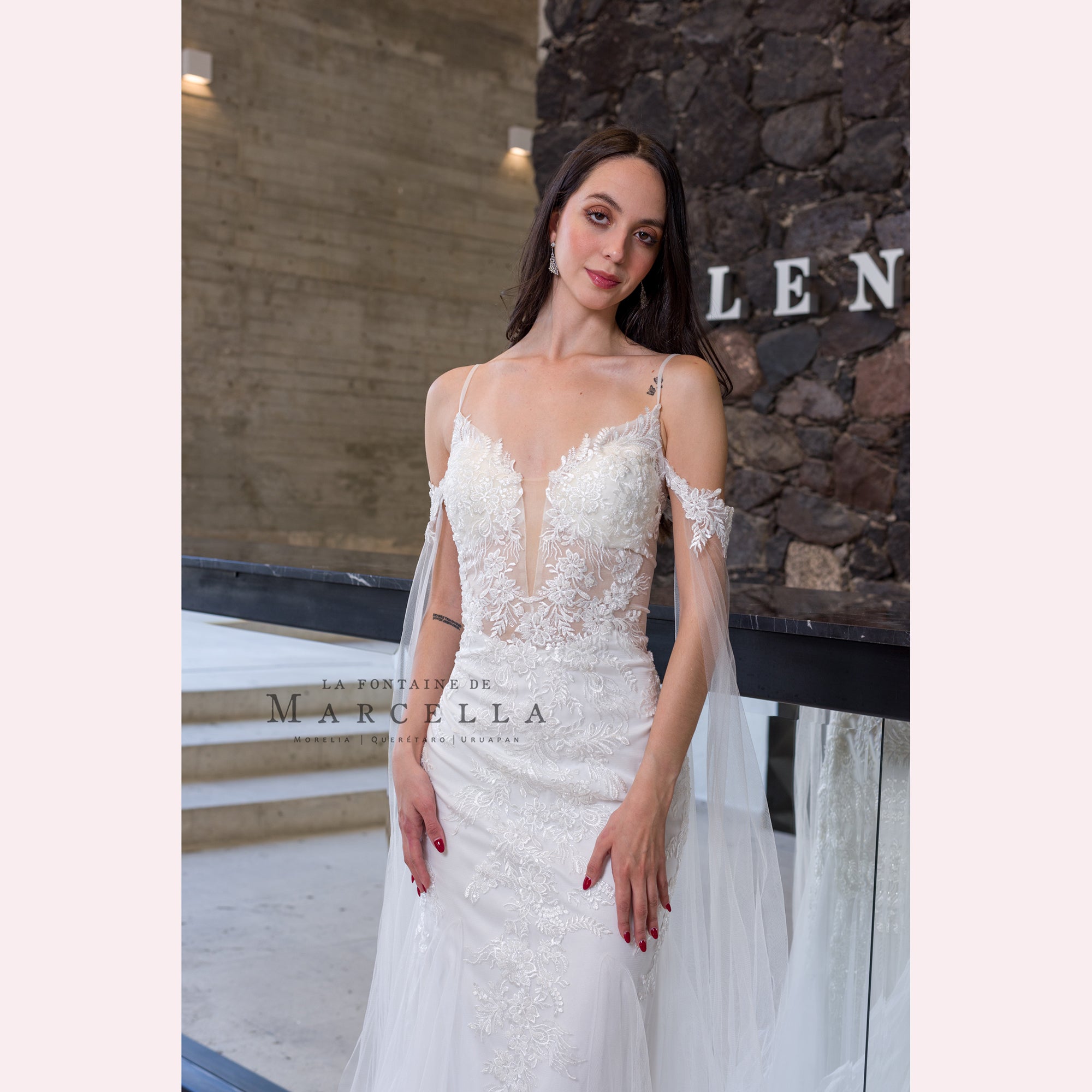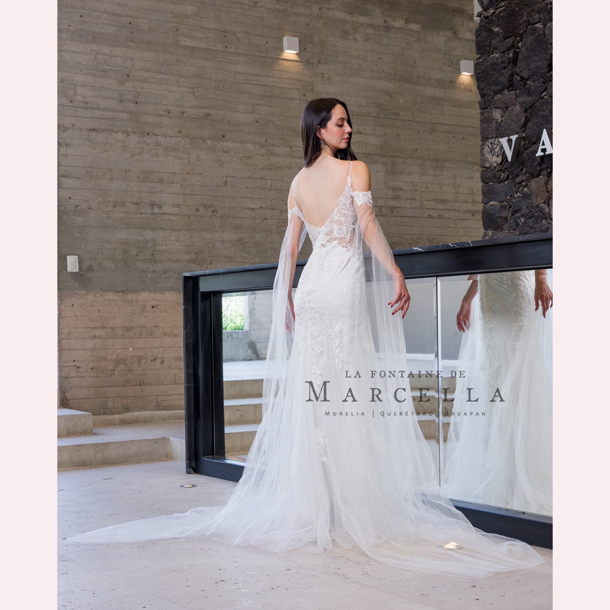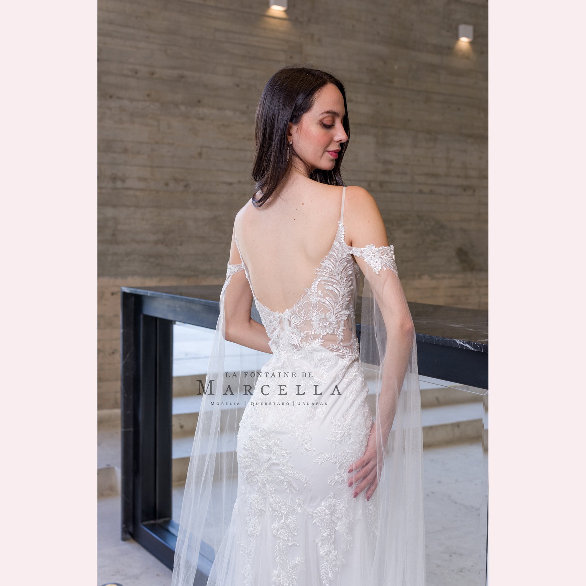 Vestido de corte sirena con aplicación y adorno a modo de media capa de tul a los hombros, es recomendado para cuerpos tipo Pera y Rectángulo.
