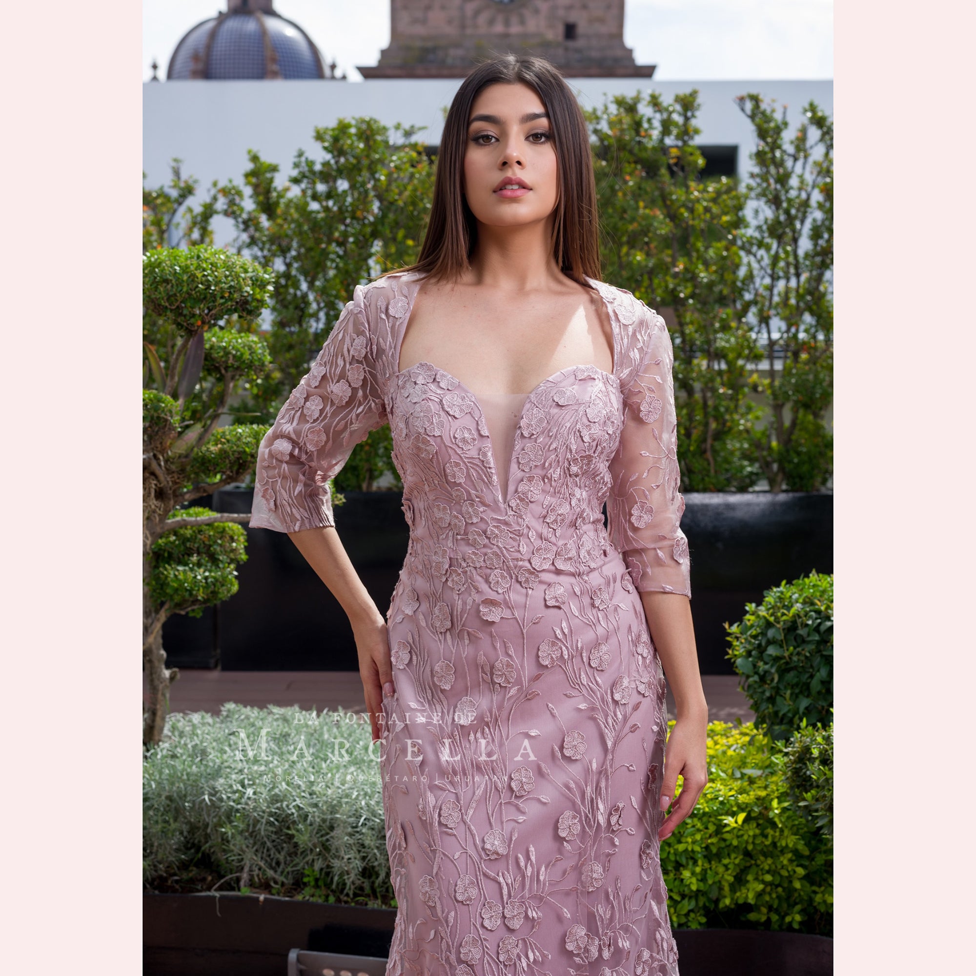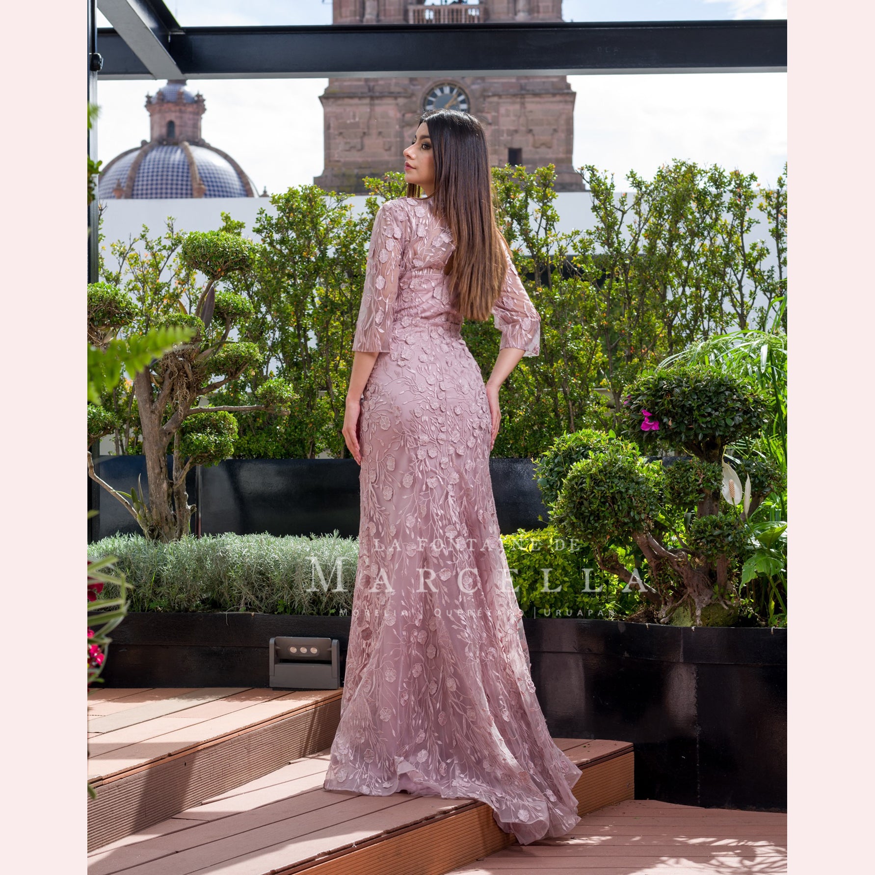 Vestido largo de corte en A con manga media y adornado hermosamente con aplicación, es recomendado para cuerpos tipo Pera, Rectángulo y Reloj de Arena.Leer más