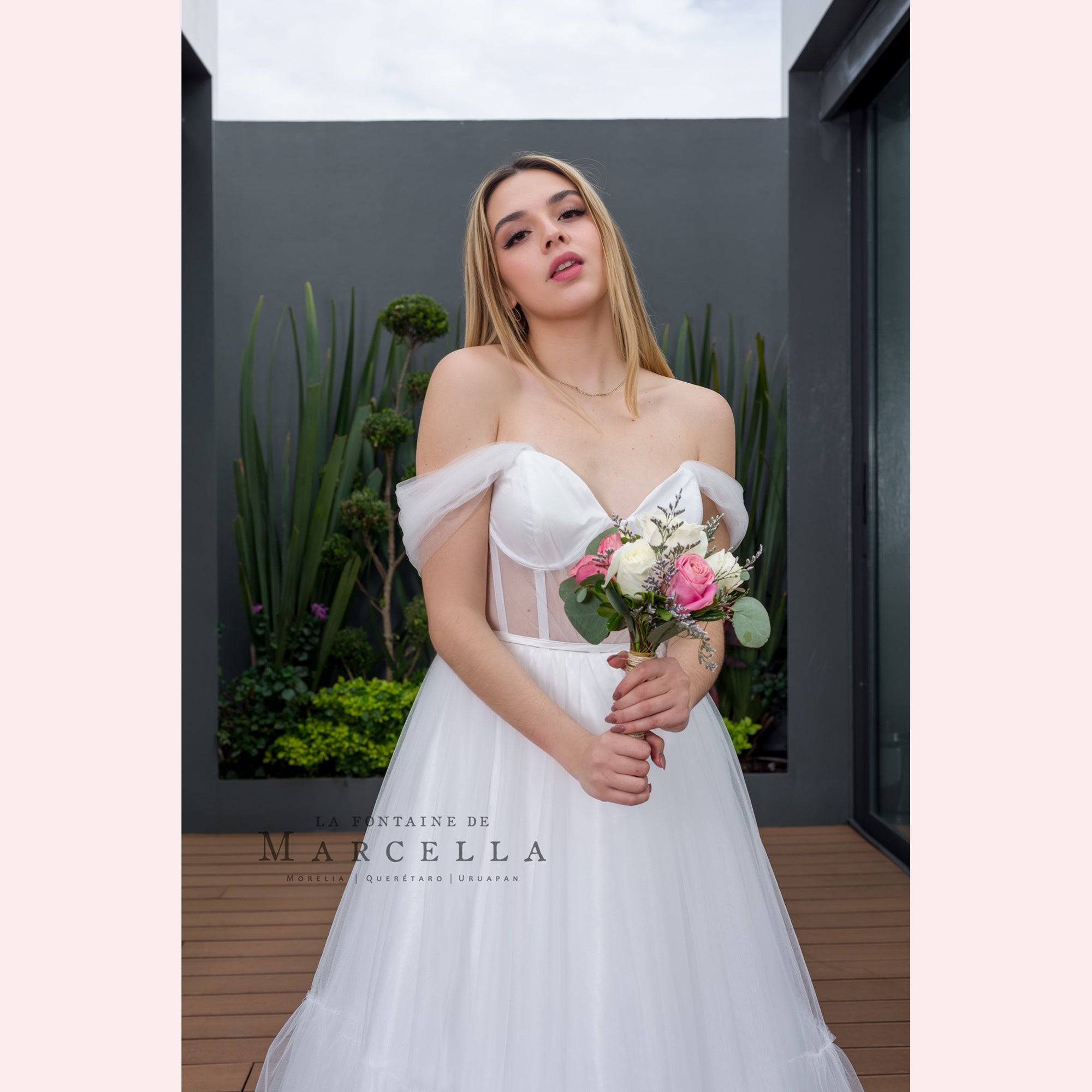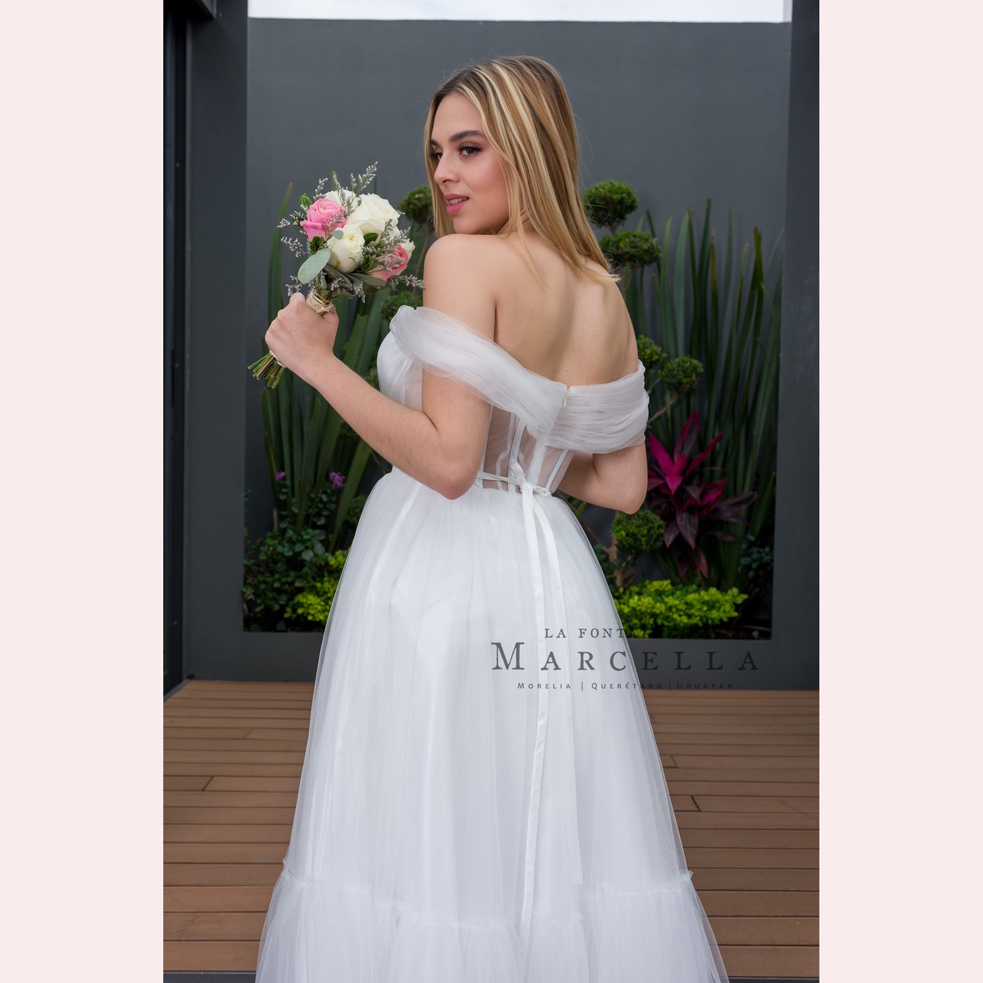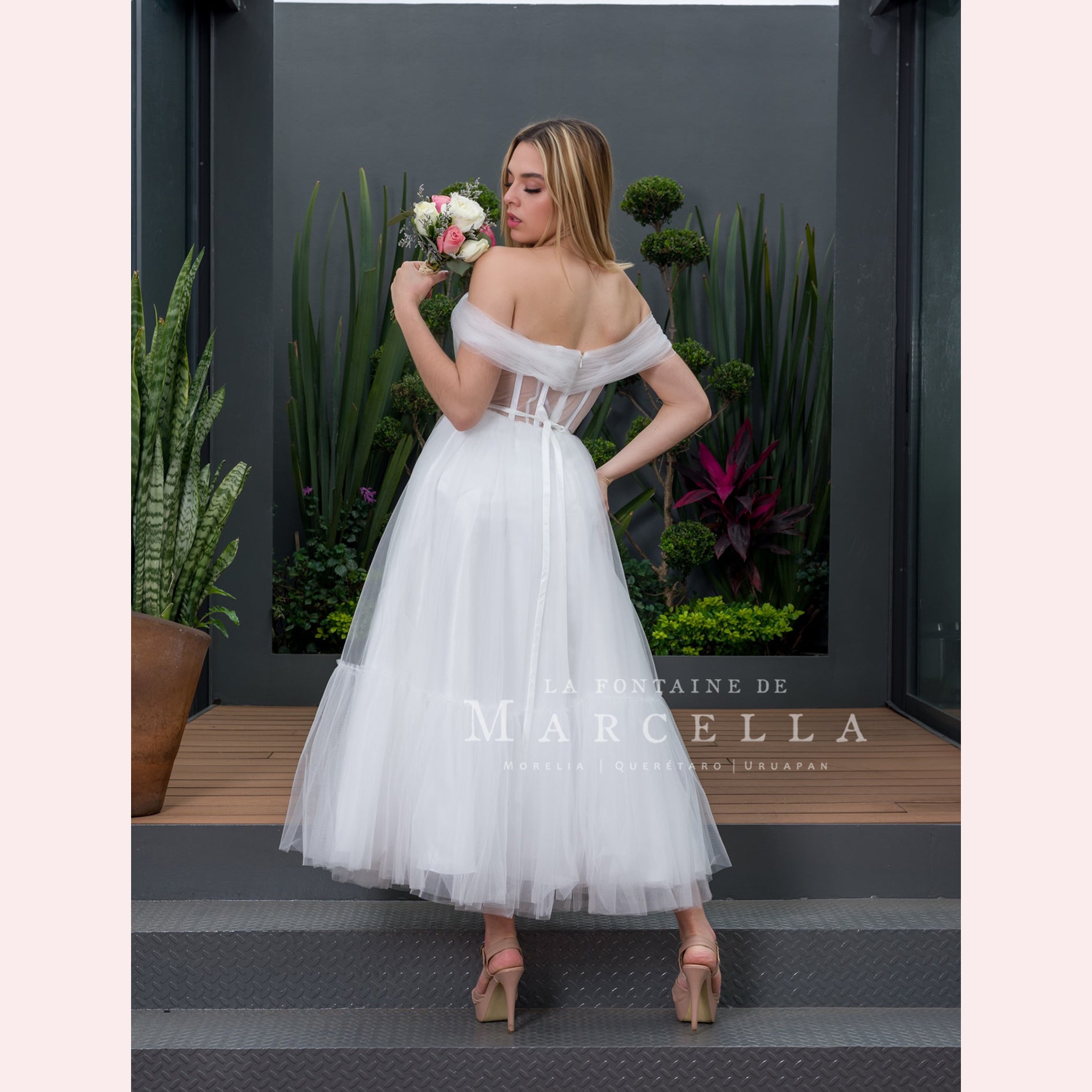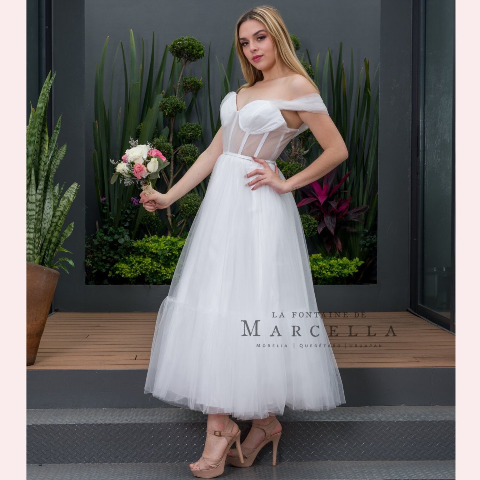 Vestido midi de tul con ola, transparencia en la parte superior y tirante de ojal, es recomendado para cuerpos tipo Rectángulo, Pera y Triangulo Invertido.Leer más