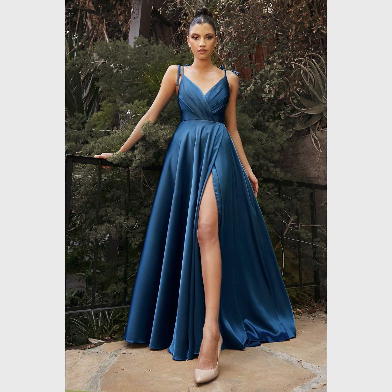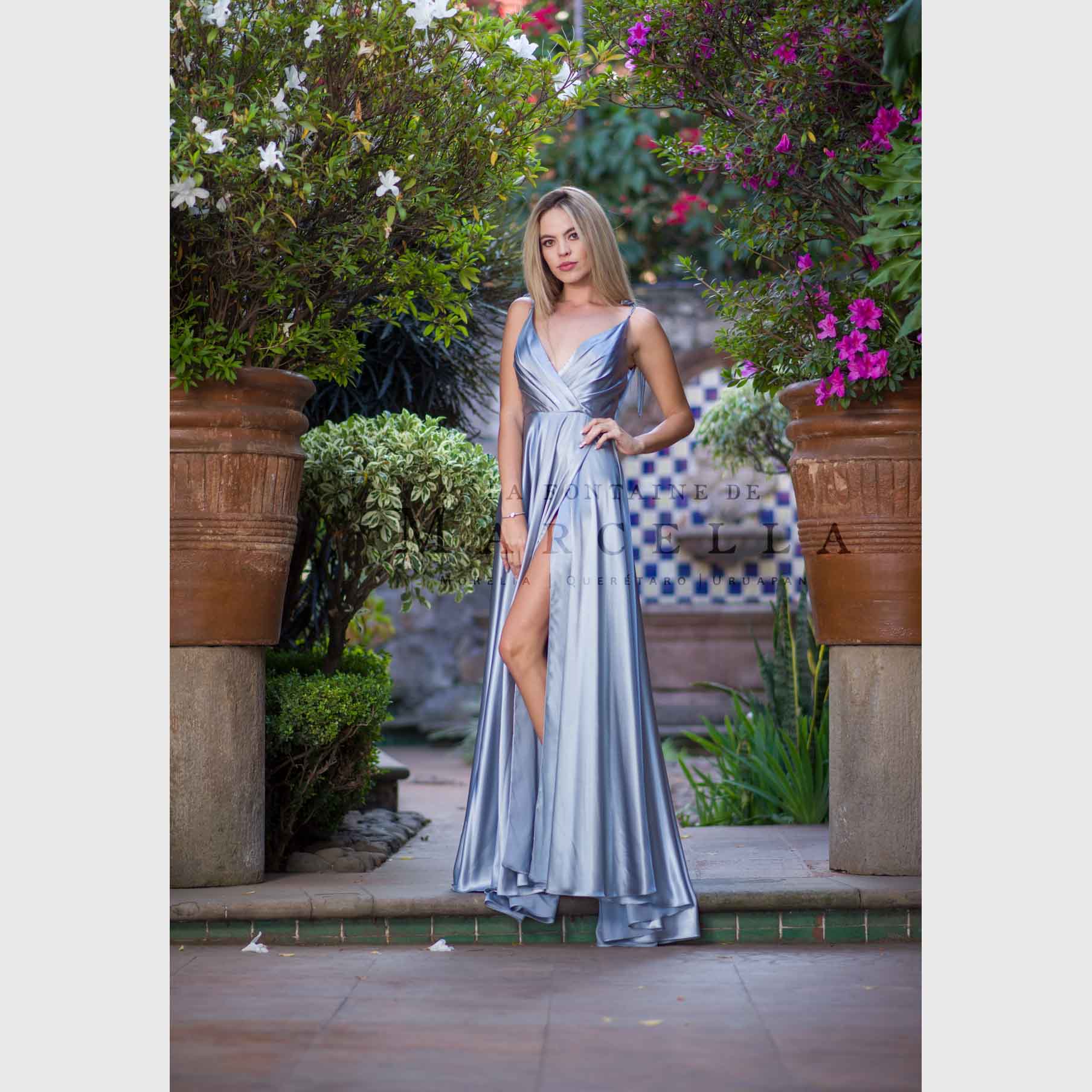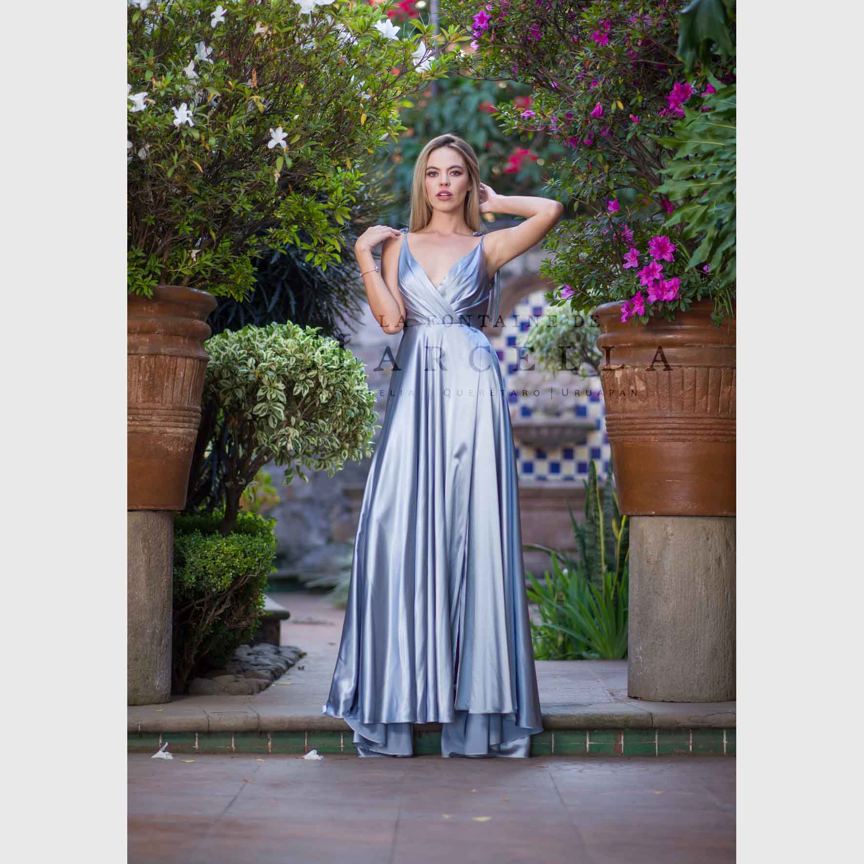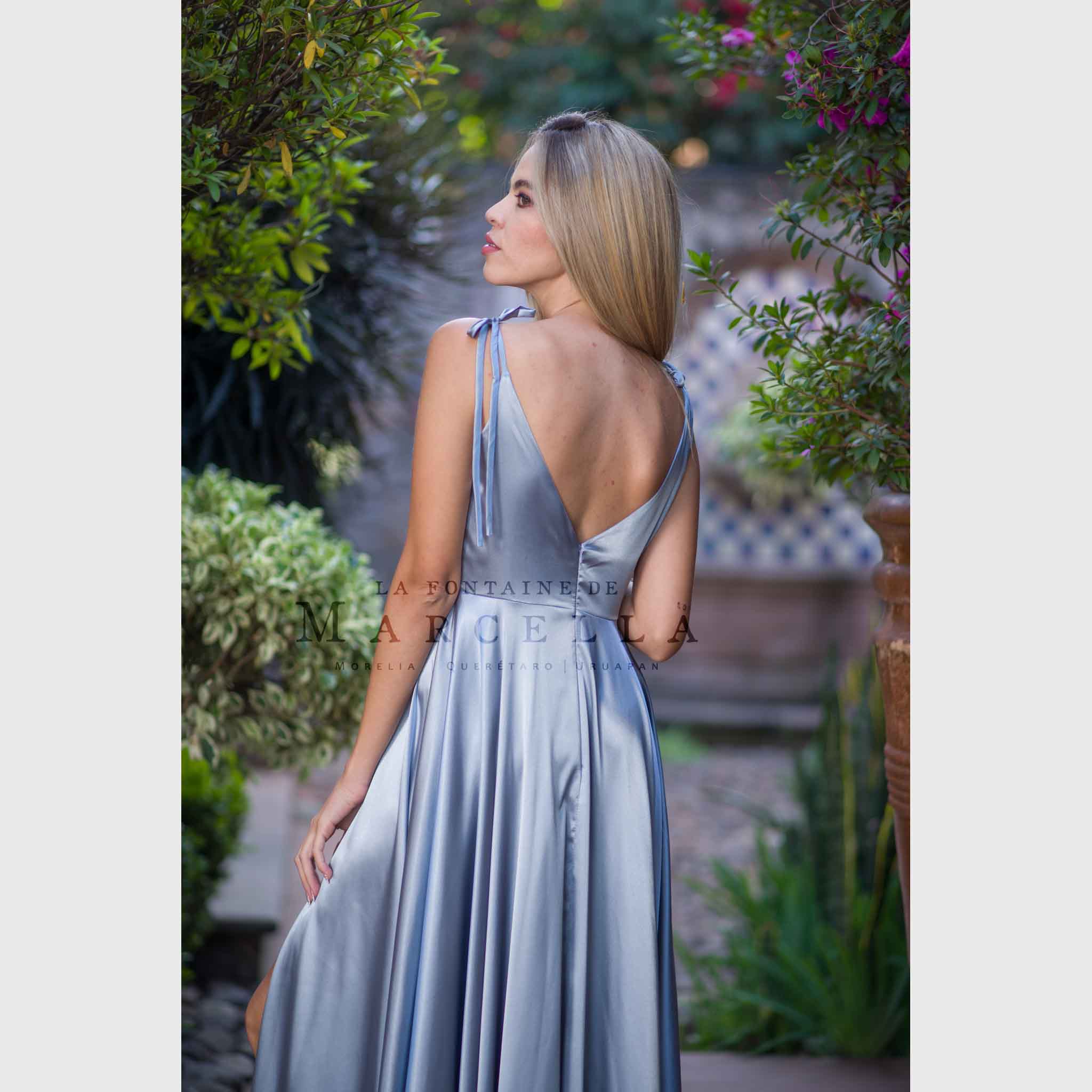 Vestido largo de corte A con tirantes que pueden amarrarse al gusto, con abertura en la pierna y escote corazón, es recomendado para cuerpos tipo Rectángulo, Manzana y Reloj de Arena.