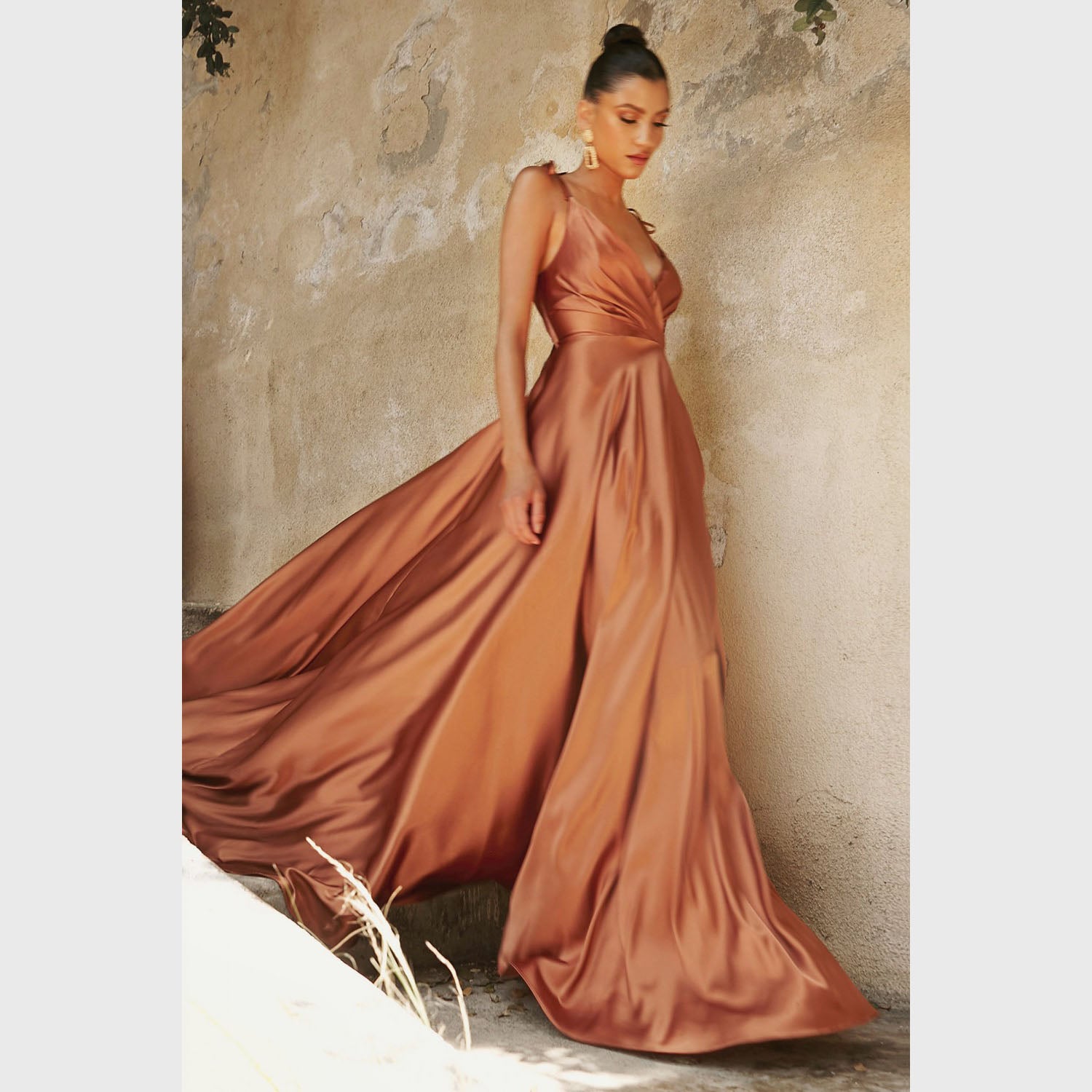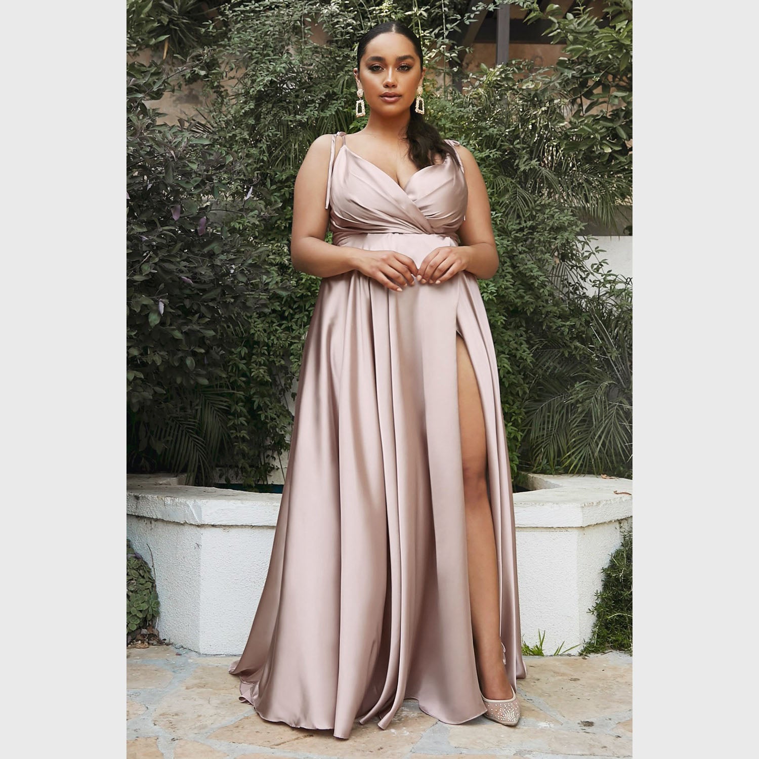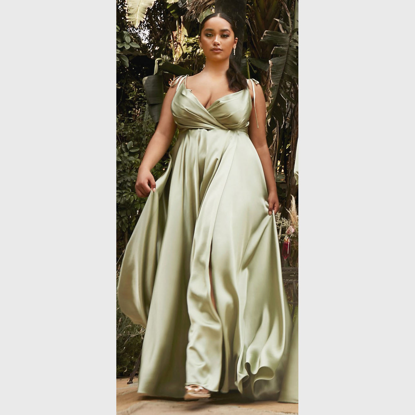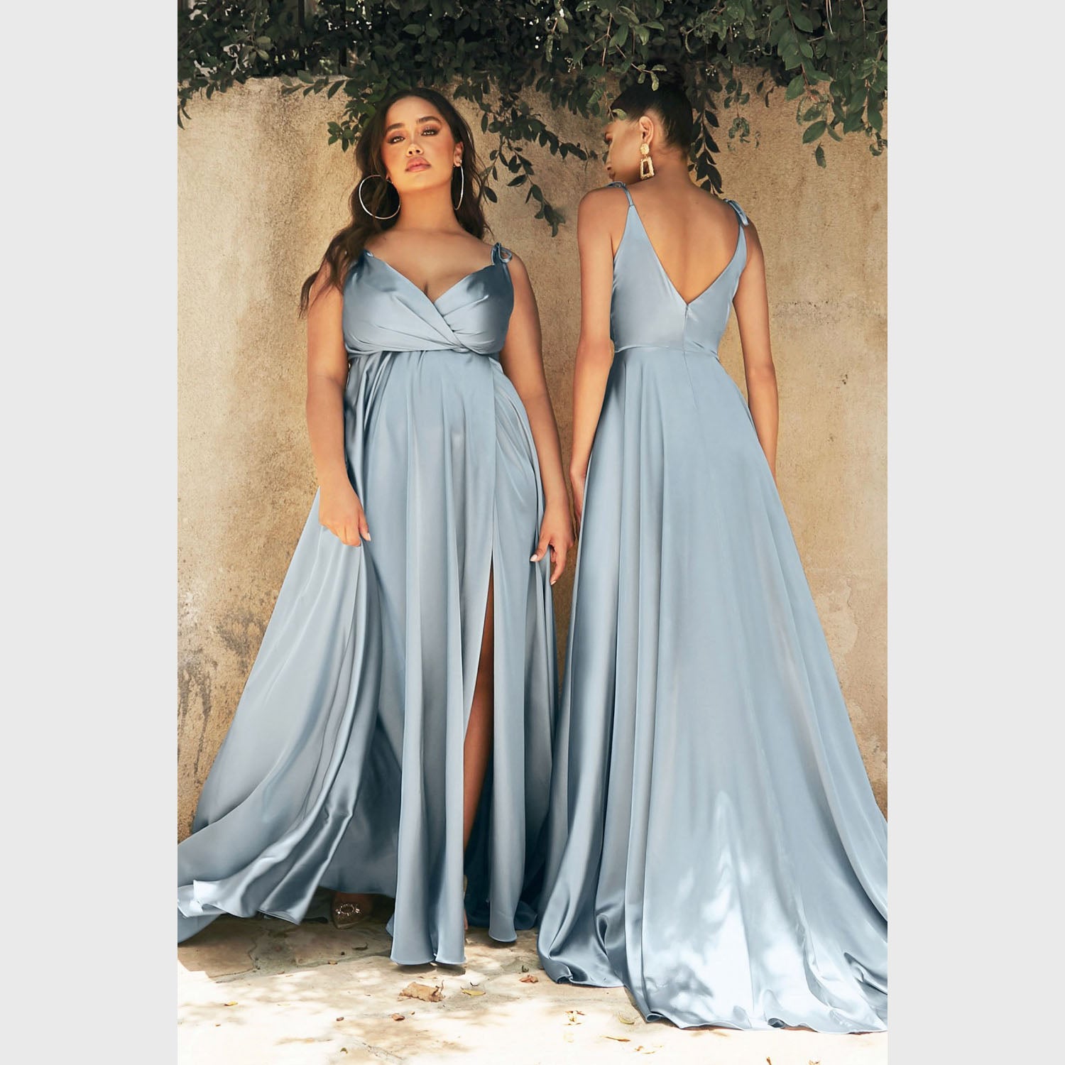Vestido largo de corte A con tirantes que pueden amarrarse al gusto, con abertura en la pierna y escote corazón, es recomendado para cuerpos tipo Rectángulo, Manzana y Reloj de Arena.