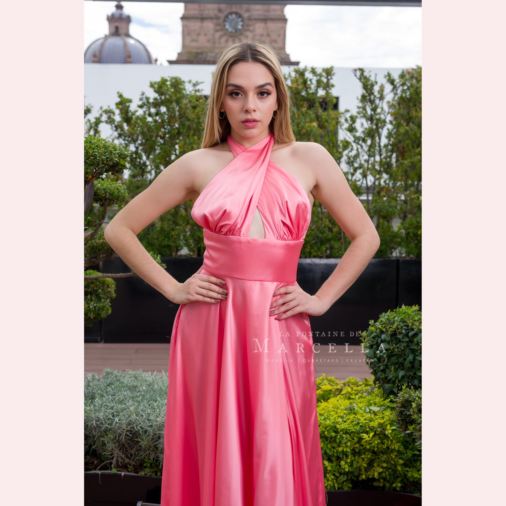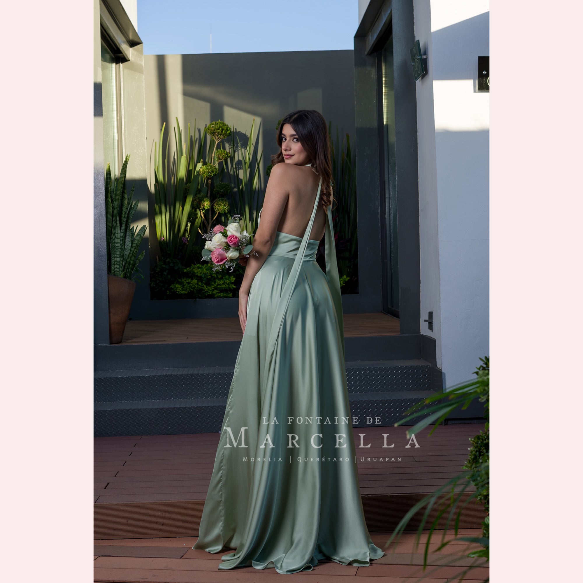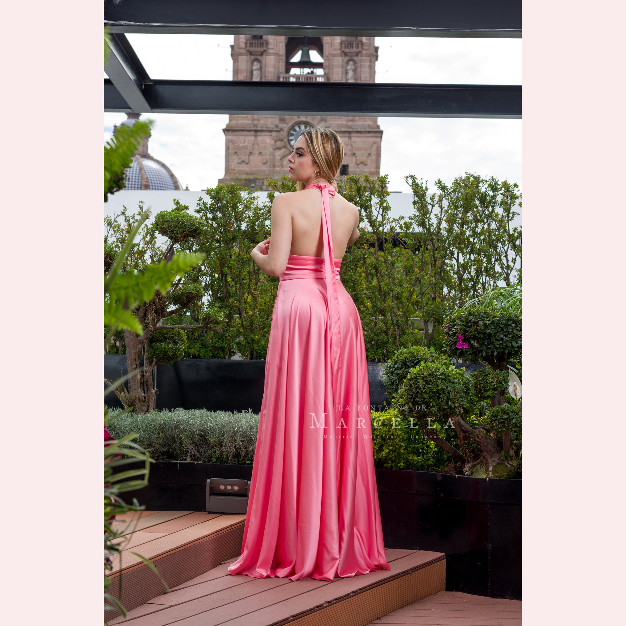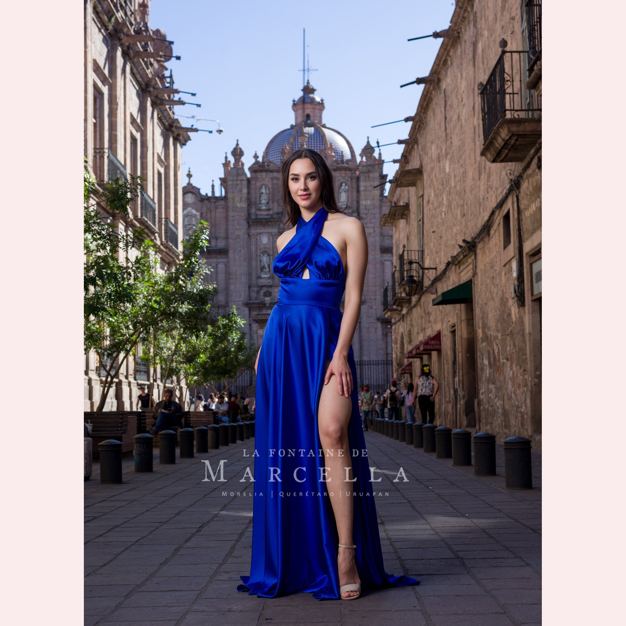 Vestido largo corte en A con abertura pronunciada en la pierna y cuello que puede acomodarse en distintas posiciones, es recomendado para cuerpos tipo Rectángulo y Triangulo Invertido.
