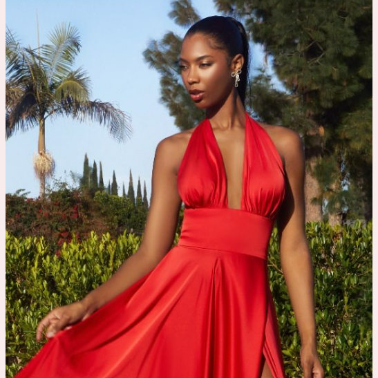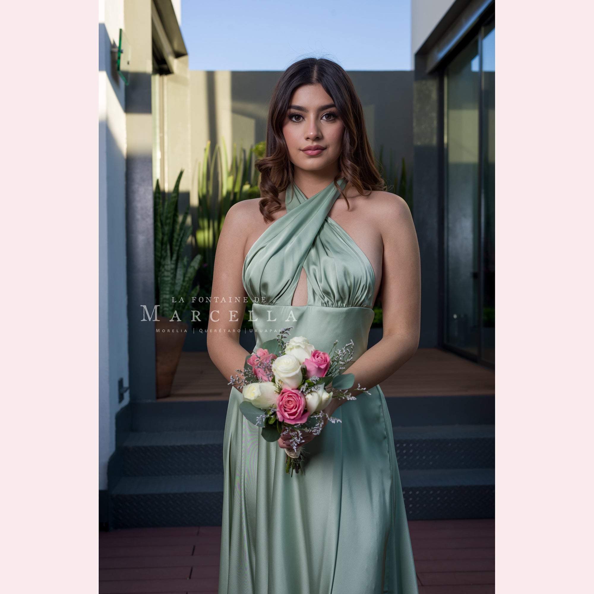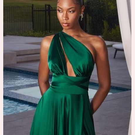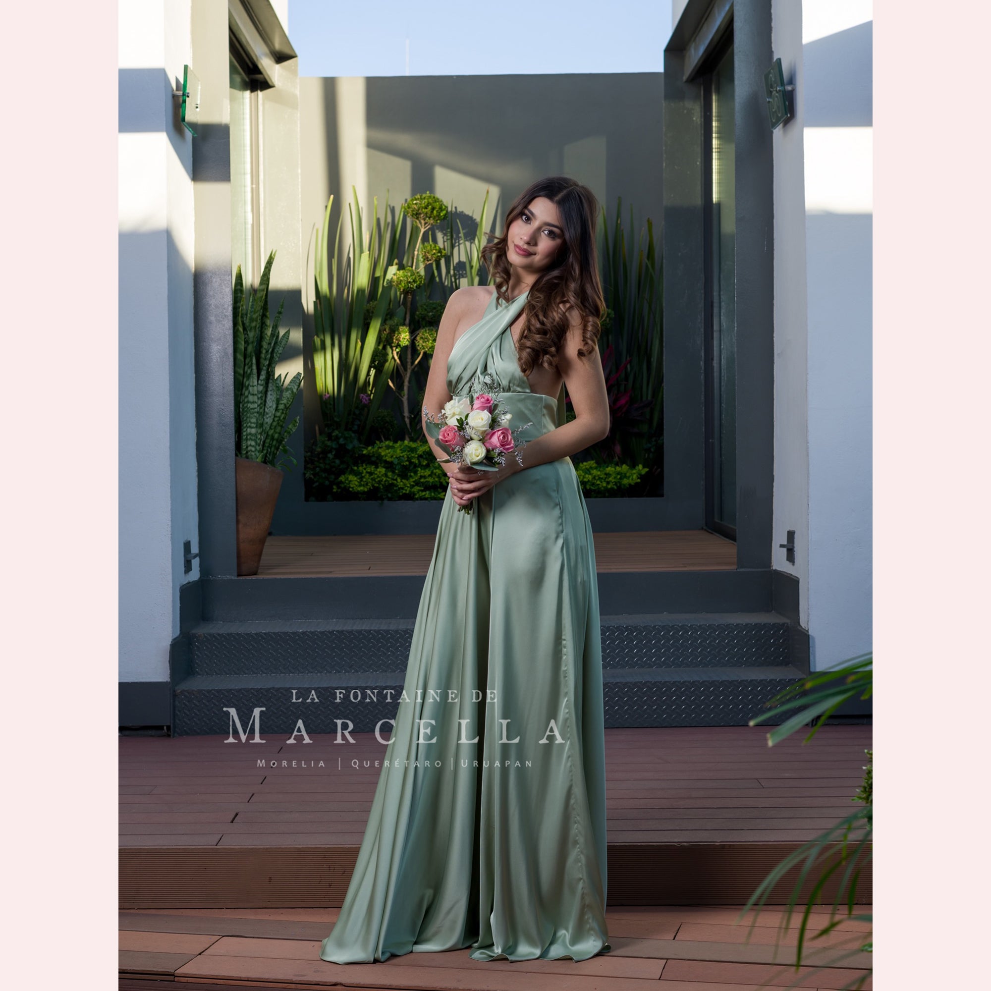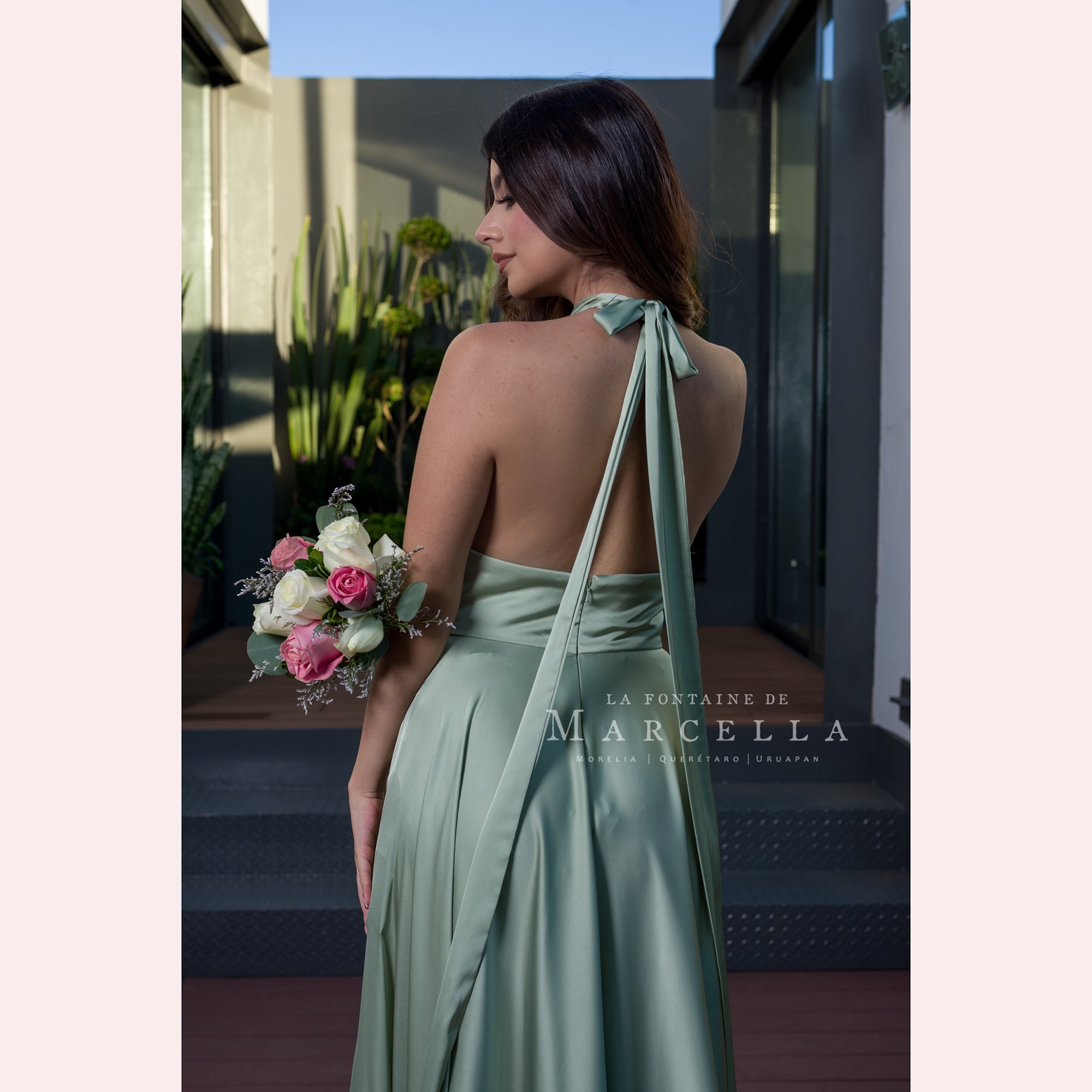 Vestido largo corte en A con abertura pronunciada en la pierna y cuello que puede acomodarse en distintas posiciones, es recomendado para cuerpos tipo Rectángulo y Triangulo Invertido.